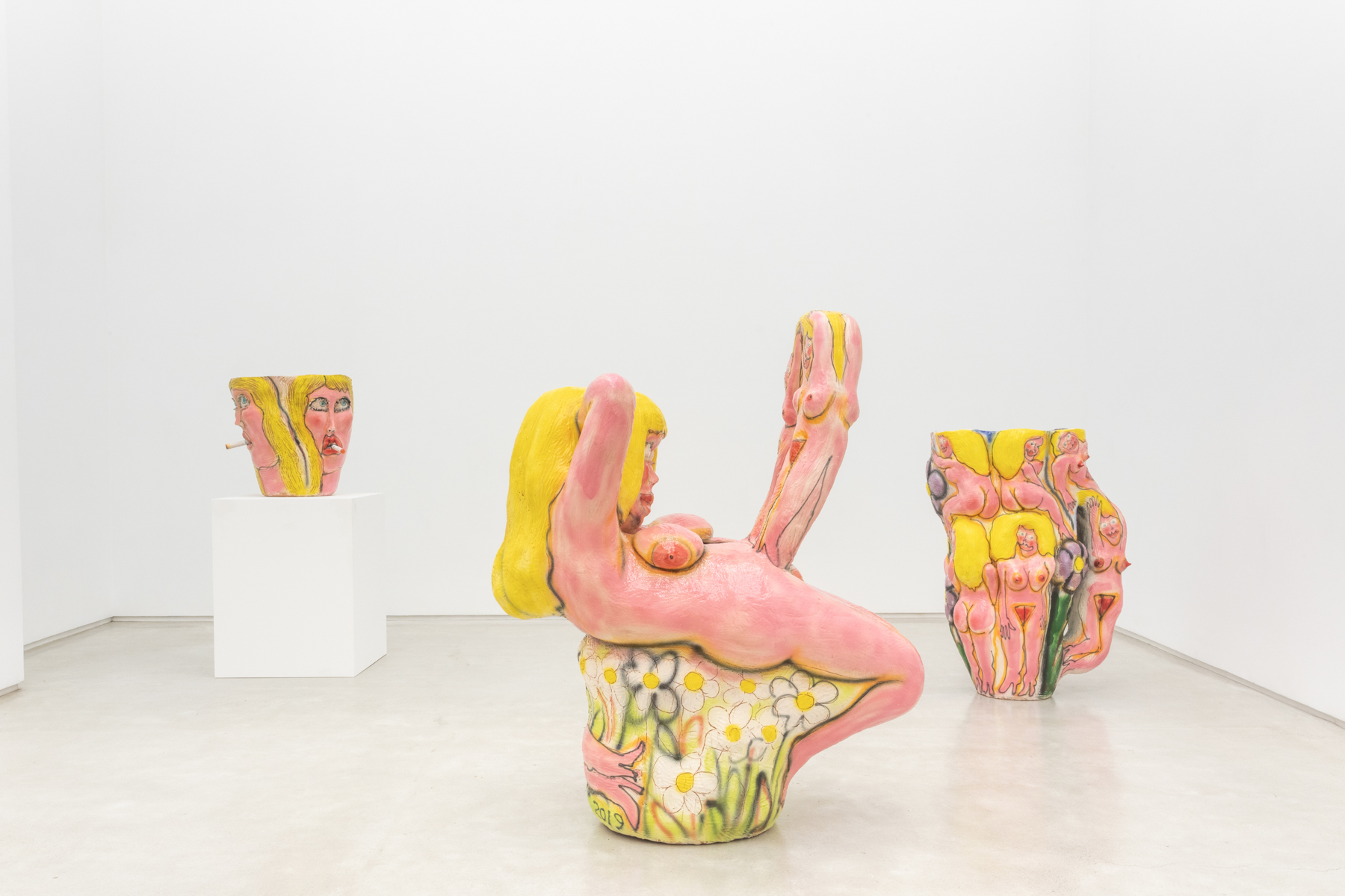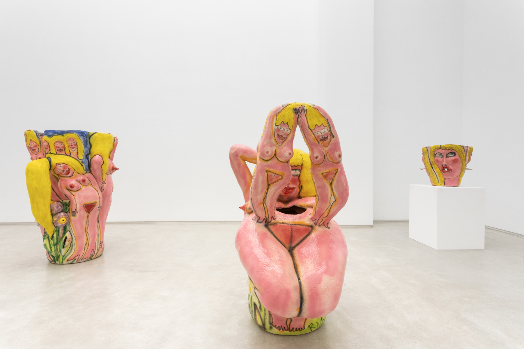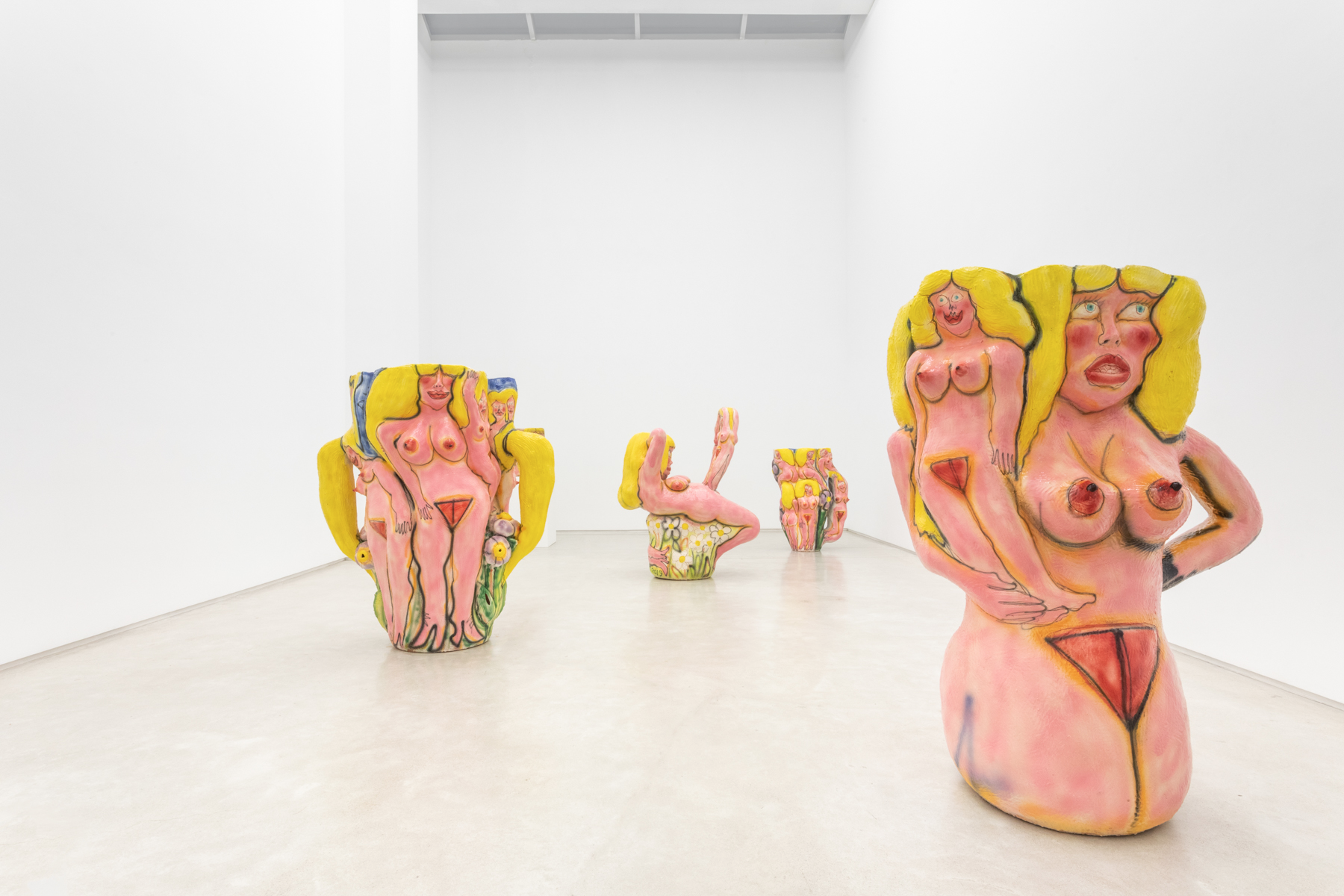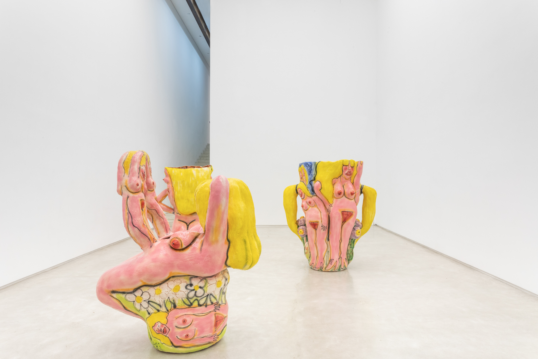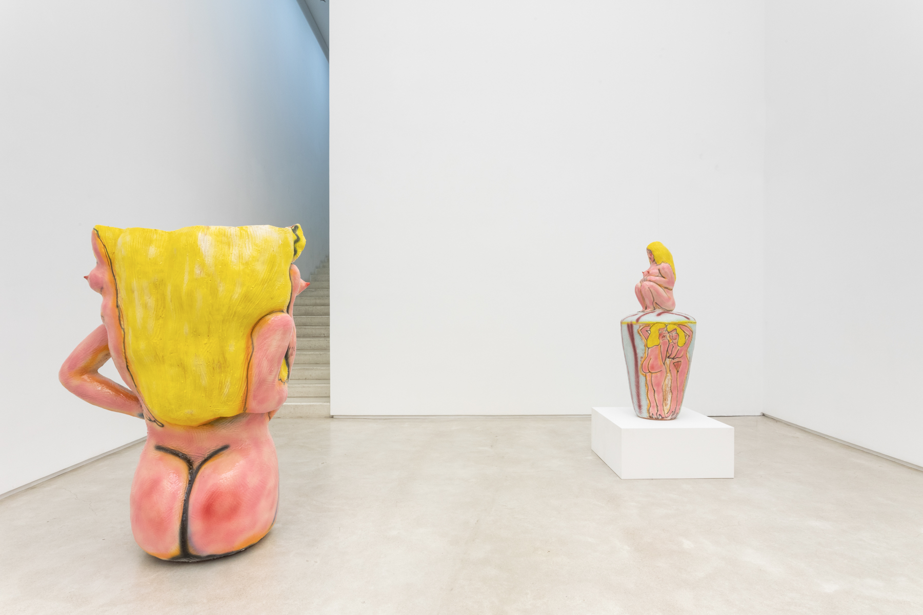 Doubly blonde and yellow, doubly hard and fragile, doubly sculpted in the round and on the surface, the works in the exhibition acknowledge ambivalence, confusion and delirium, stereotypical representations of the feminine that Neri refines through empowerment. These vessels depict “extreme characters of the imagination,” as Neri describes, figures of multiplicity rather than portraits of any one individual. In Neri’s words, the sculptures have a “self-imploding pressure—they are self-destructing in front of our eyes.