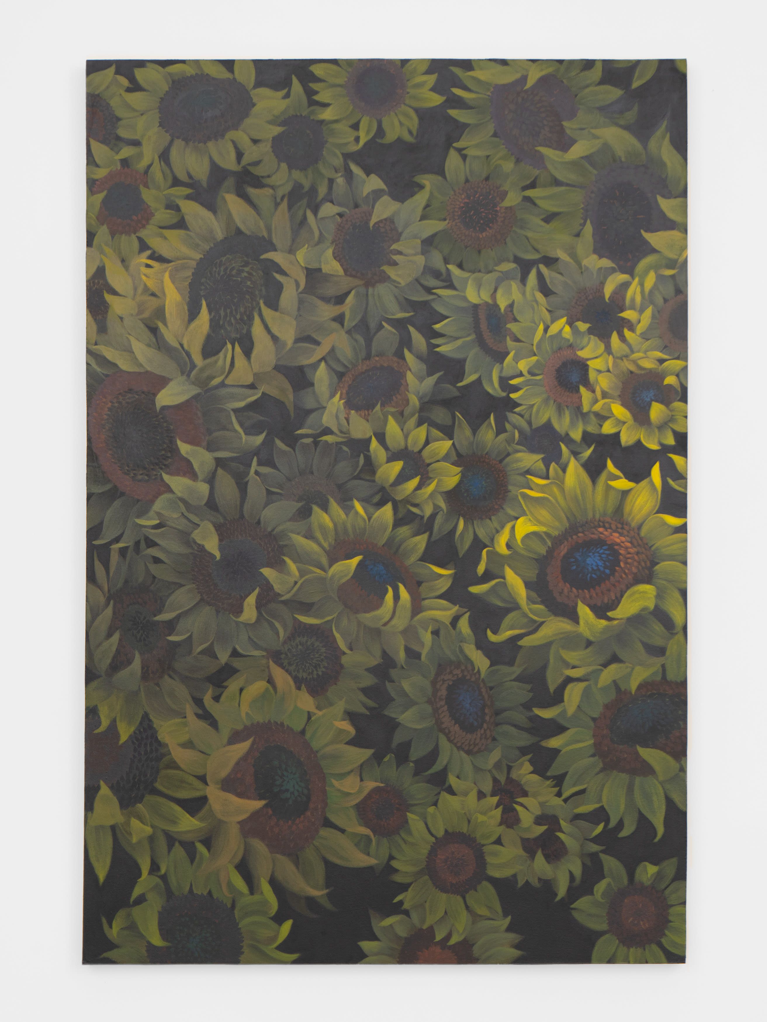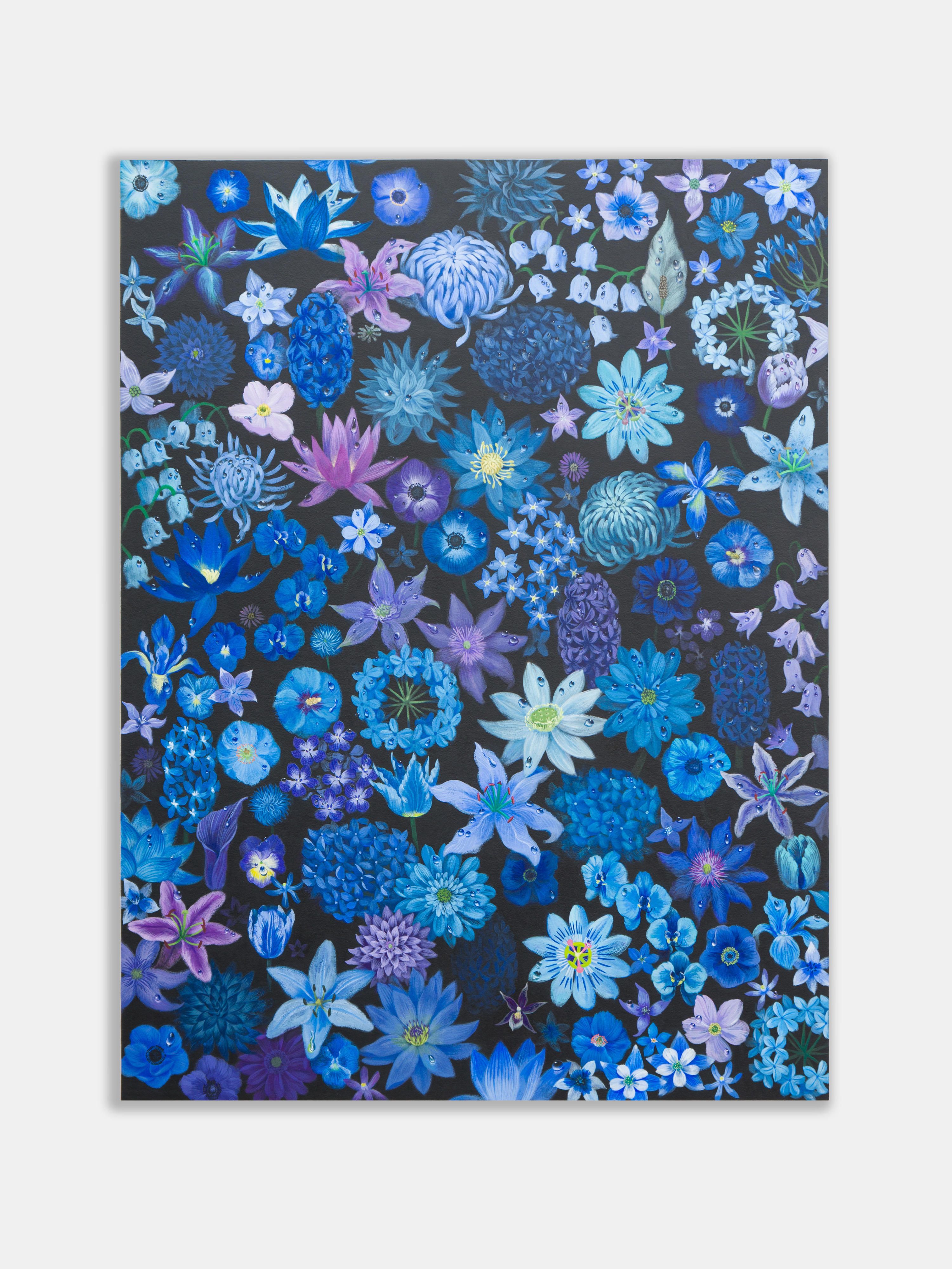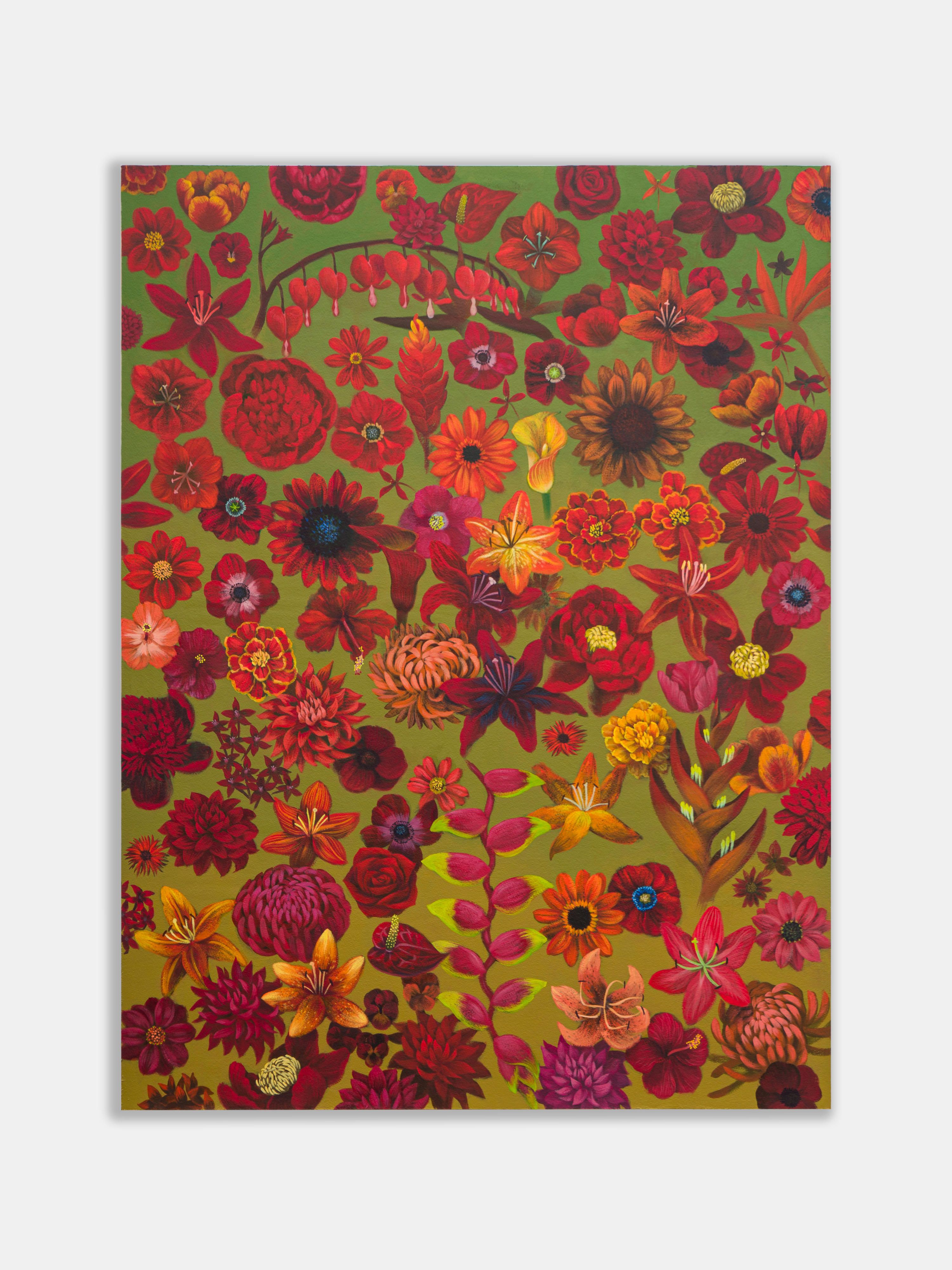 Why do sunflowers belong to the realm of the sun? Greek myth tells of Clytie, a nymph whose unrequited love for Apollo left her eternally bound to the sun. Han’s Light from the Window is a receptacle for the sunflower’s longing: emerging from darkness, the golden petals twist in varied directions, as though each is fighting for the sunlight. There is a terrorlike beauty in their struggle. And the calla lily? Next time you encounter one, think of Hera, queen of the gods. While she slept, Zeus placed infant Hercules at her breast. Startled, Hera pushed him away. Her spilled milk formed the Milky Way, and the drops that fell to Earth created the first calla lilies, scattered throughout Han’s paintings like whispered fragments—Moondrop, Bouquet, Night Flowers. These floral dreamscapes are painted in a surreal register: alizarin crimson bleeding into sap green; phthalo green humming with vitality; cadmium yellow glowing beside quinacridone magenta; yellow ochre murmuring of earth.