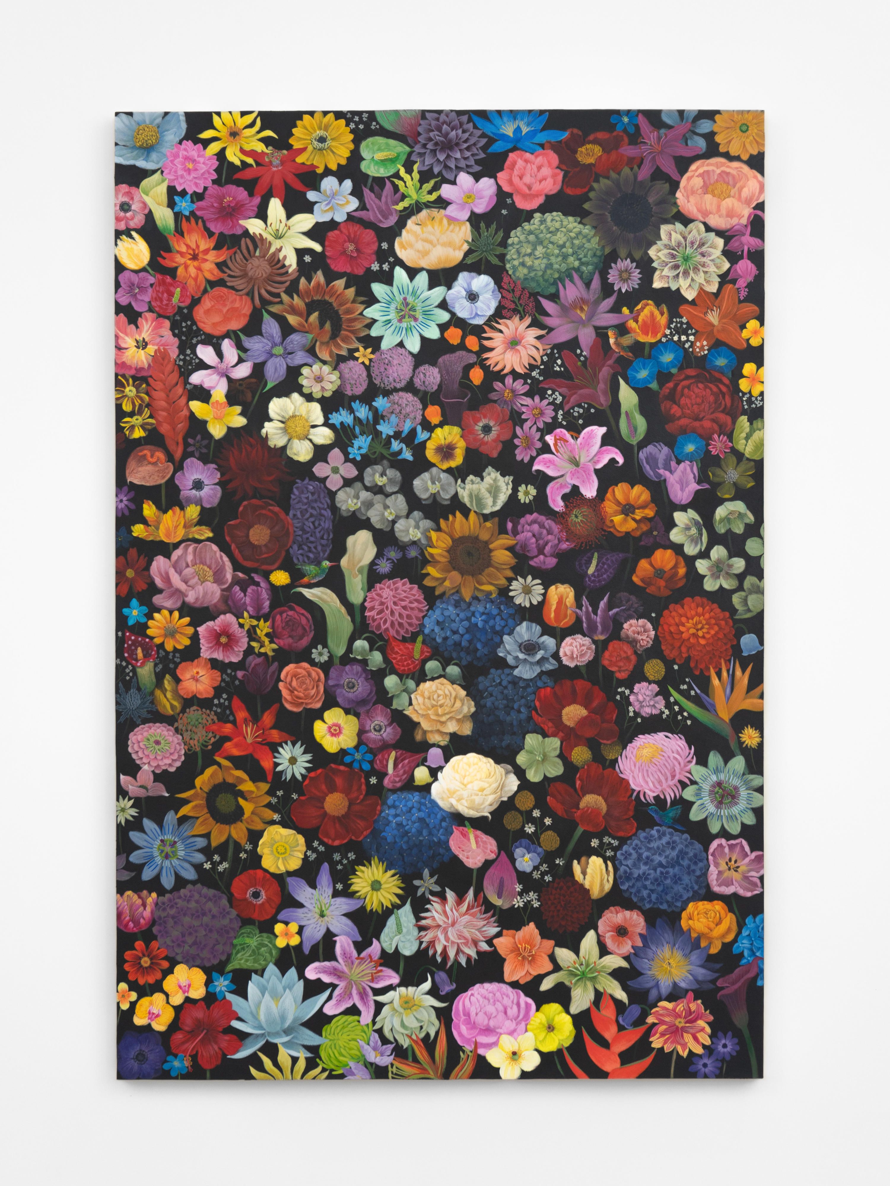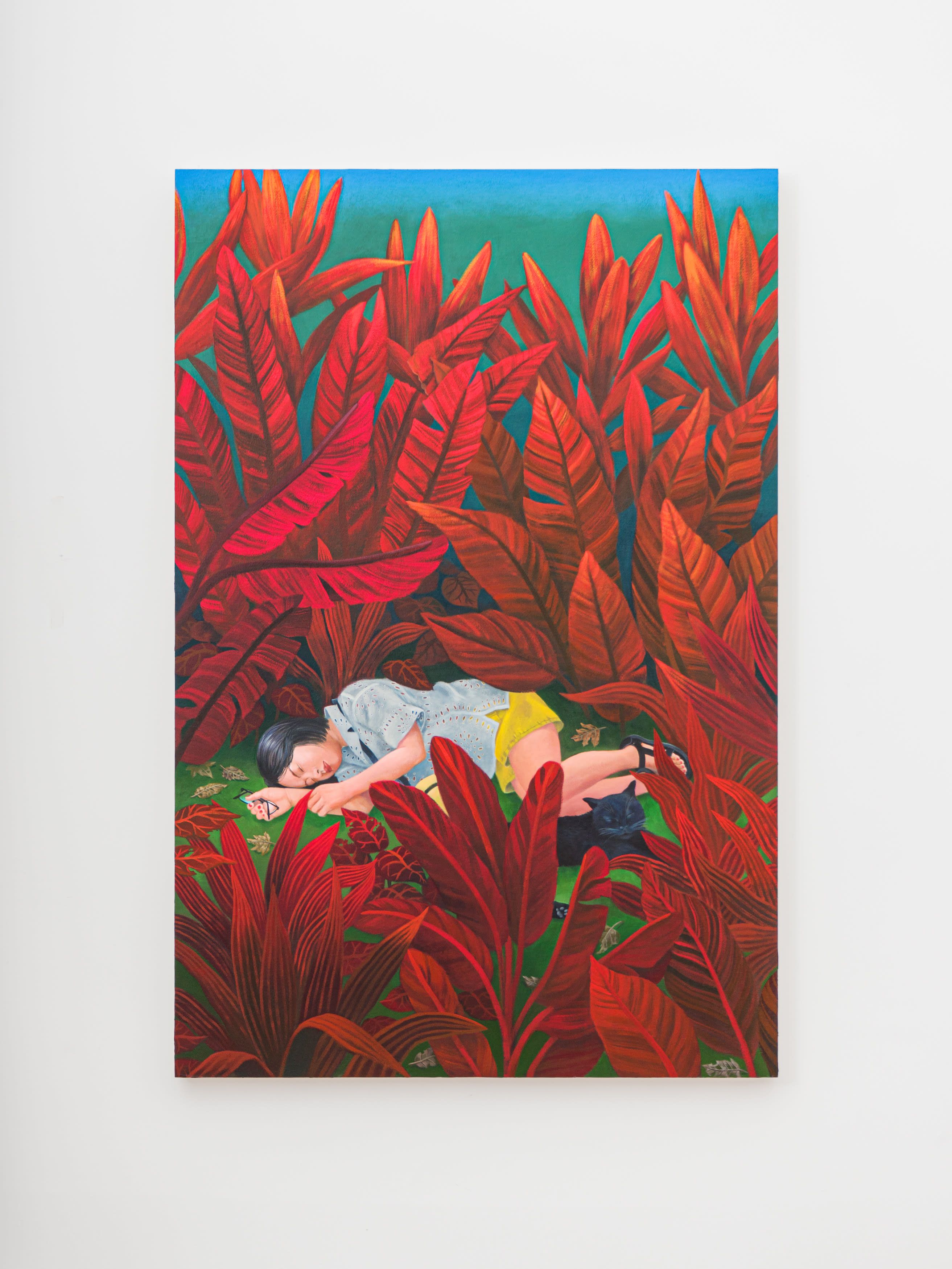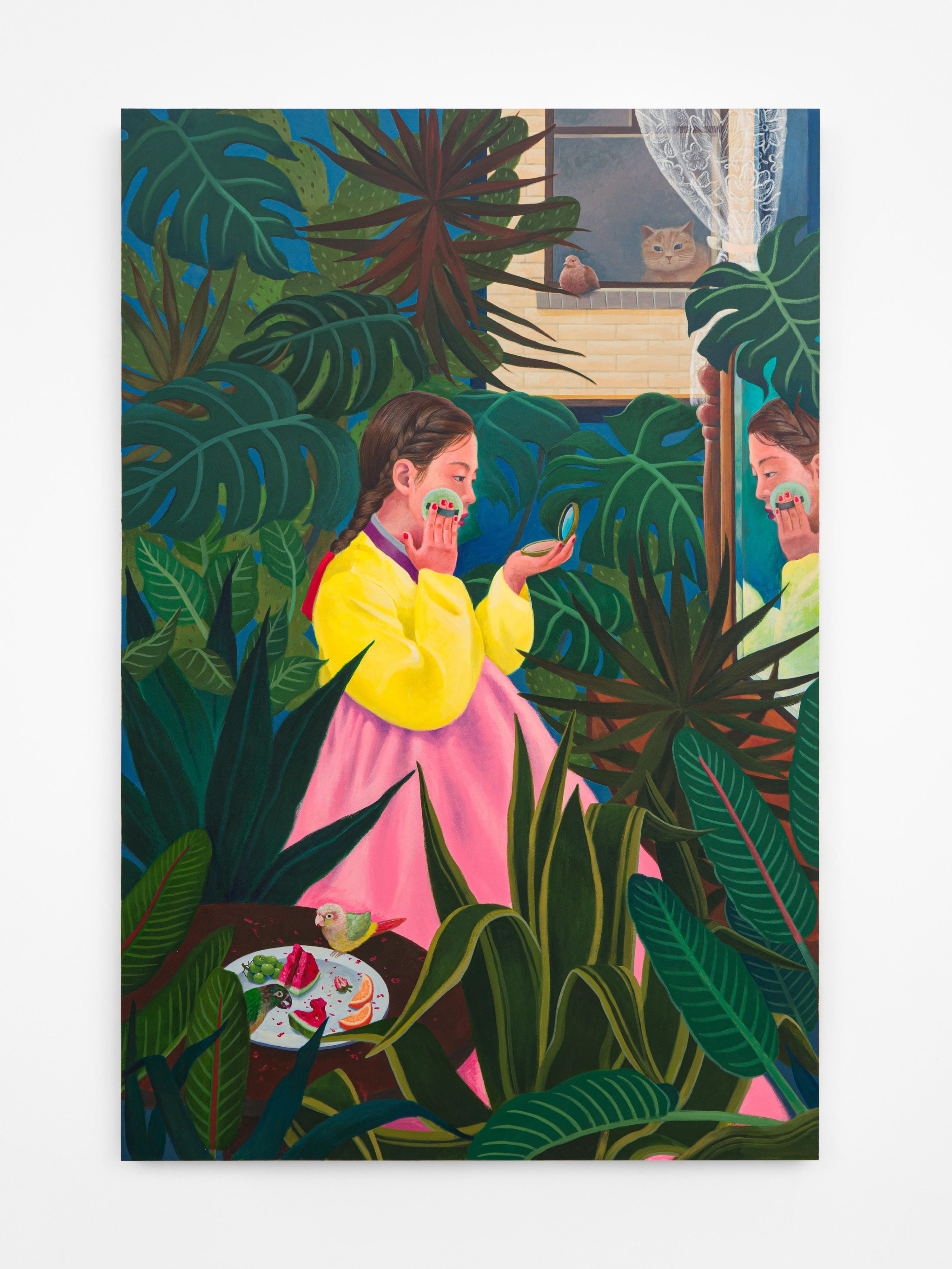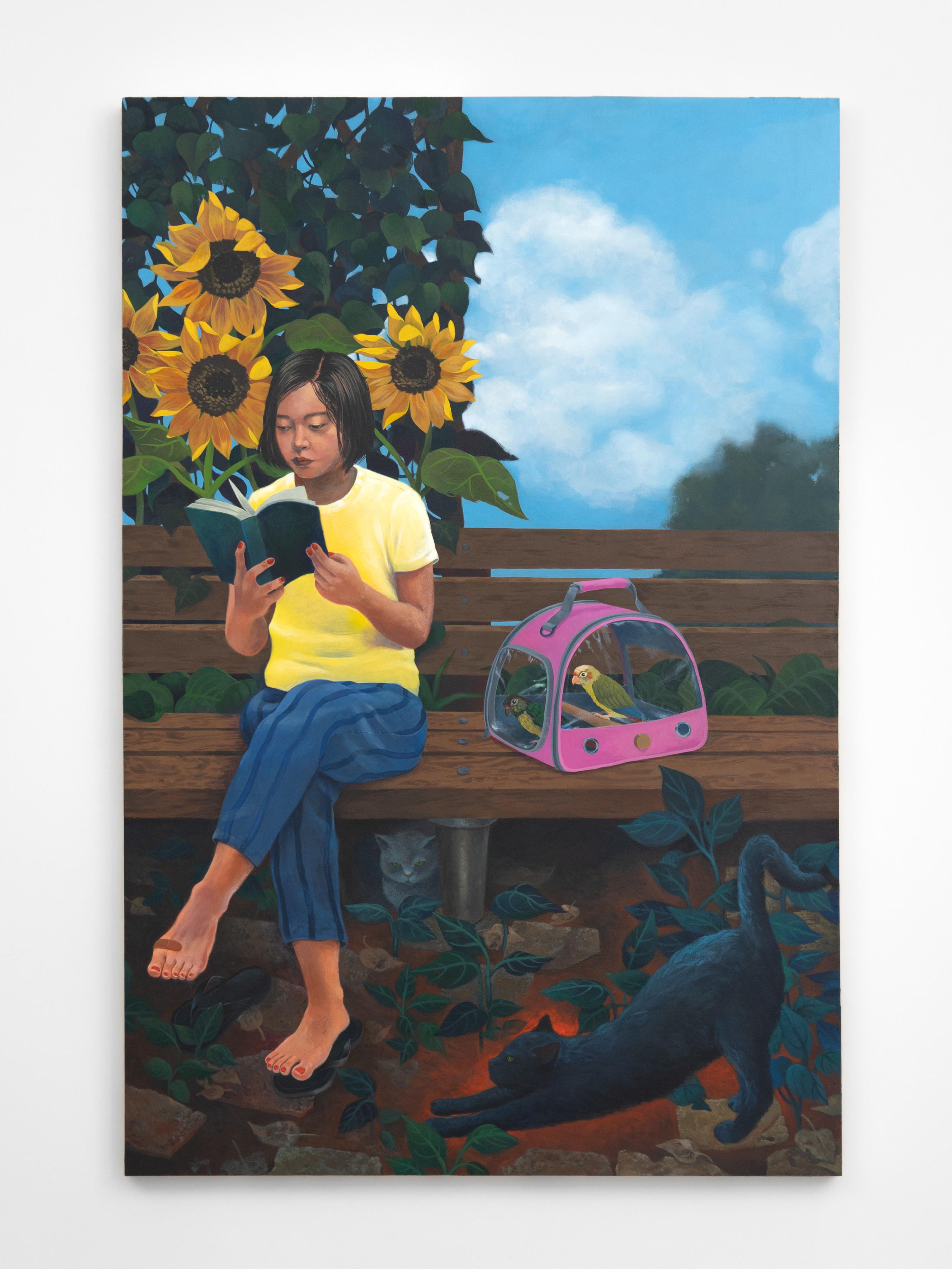 For Sally J. Han, painting is devotion, an act of reverence for the everyday. Like flowers expressing the inexpressible, Han rarely offers explanations for her work; instead, the experience unfolds on us. We are guided by the details she paints: blossoms, lush foliage, birds, mirrors, books, the hands that hold them, a Band-Aid on a foot, bruised fruit, and the way light touches braided hair. Her work is bare before us, inviting us to simply be with what is depicted. Han bookmarks an inventory of New York City from her memory bank: floral displays, playful bodega cats, birdsong-filled gardens, readers on benches, and window-gazing felines. Han’s environment was not always New York; she was born in China as a Joseon-jok (ethnic Korean), but spent most of her early youth in South Korea before settling in the US as a high school student. She hints at this cultural history in Fiesta, where the figure wears a Hanbok, traditional Korean attire with a rich 1,600-year history. In Fiesta, Siesta, and Sunday at the Park, Han’s likeness recurs, but these are not self-portraits. Instead, she embraces ambiguity, suggesting it could be her or another. Her paintings invite us to look beyond the perceivable and into an interior world.