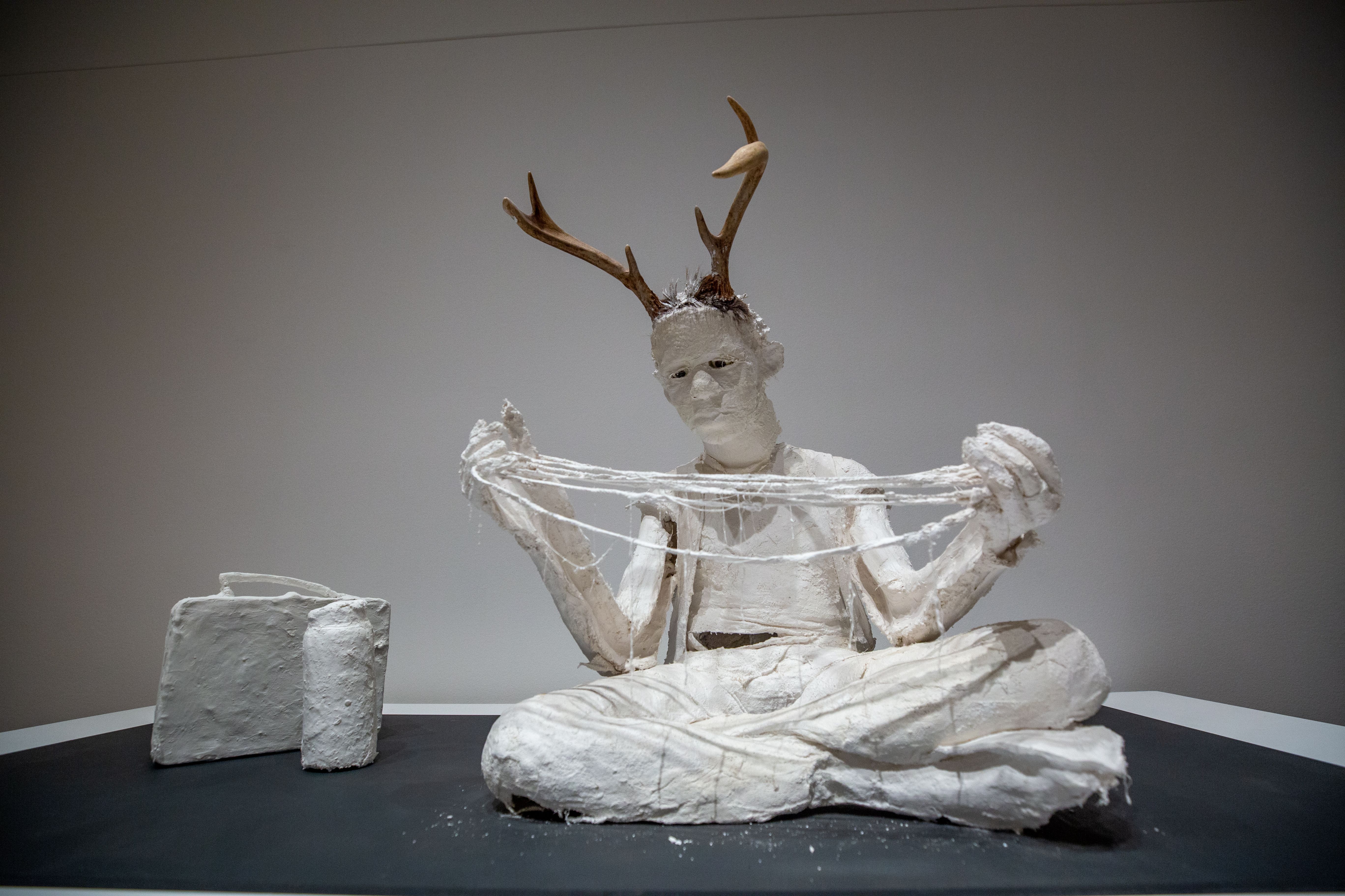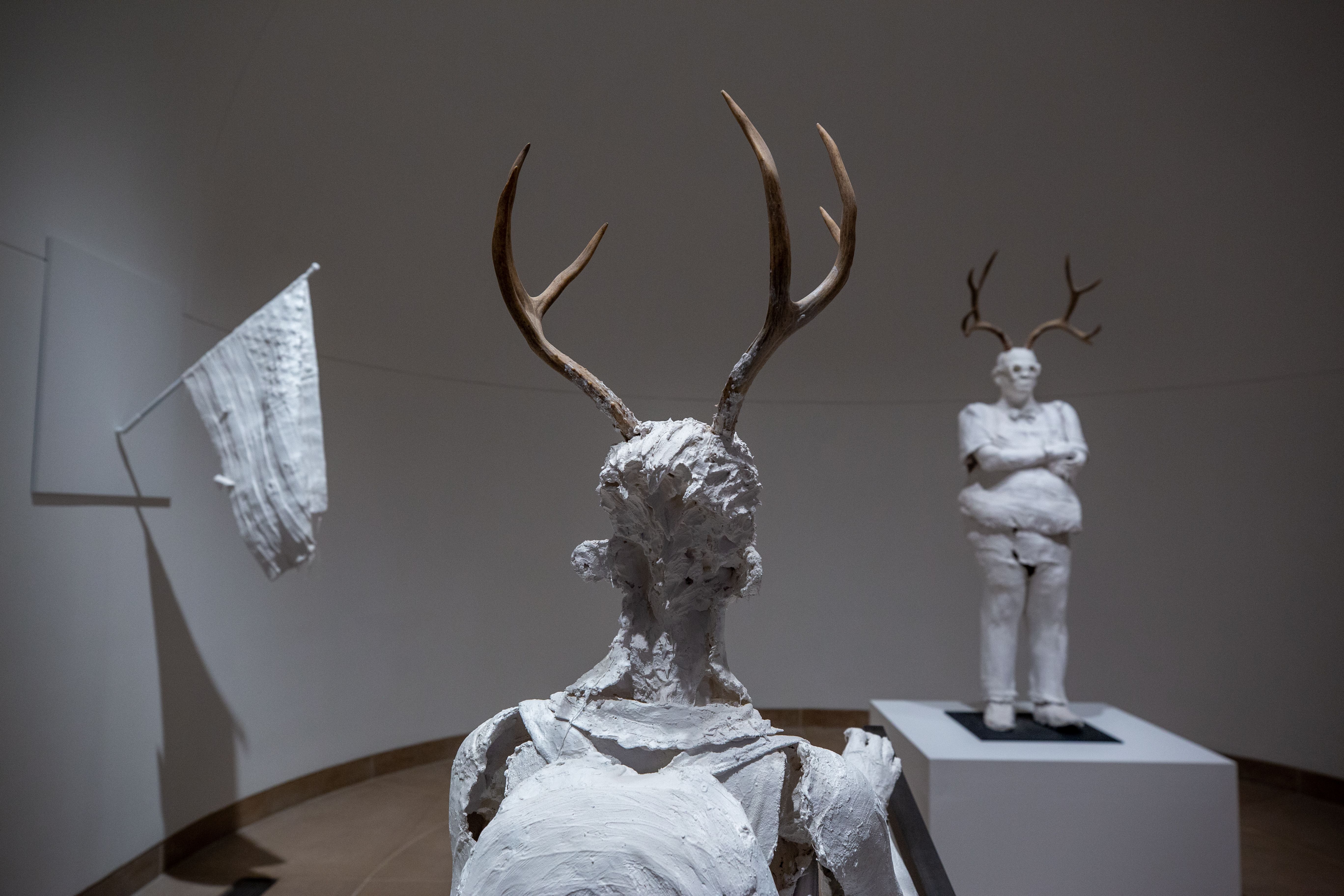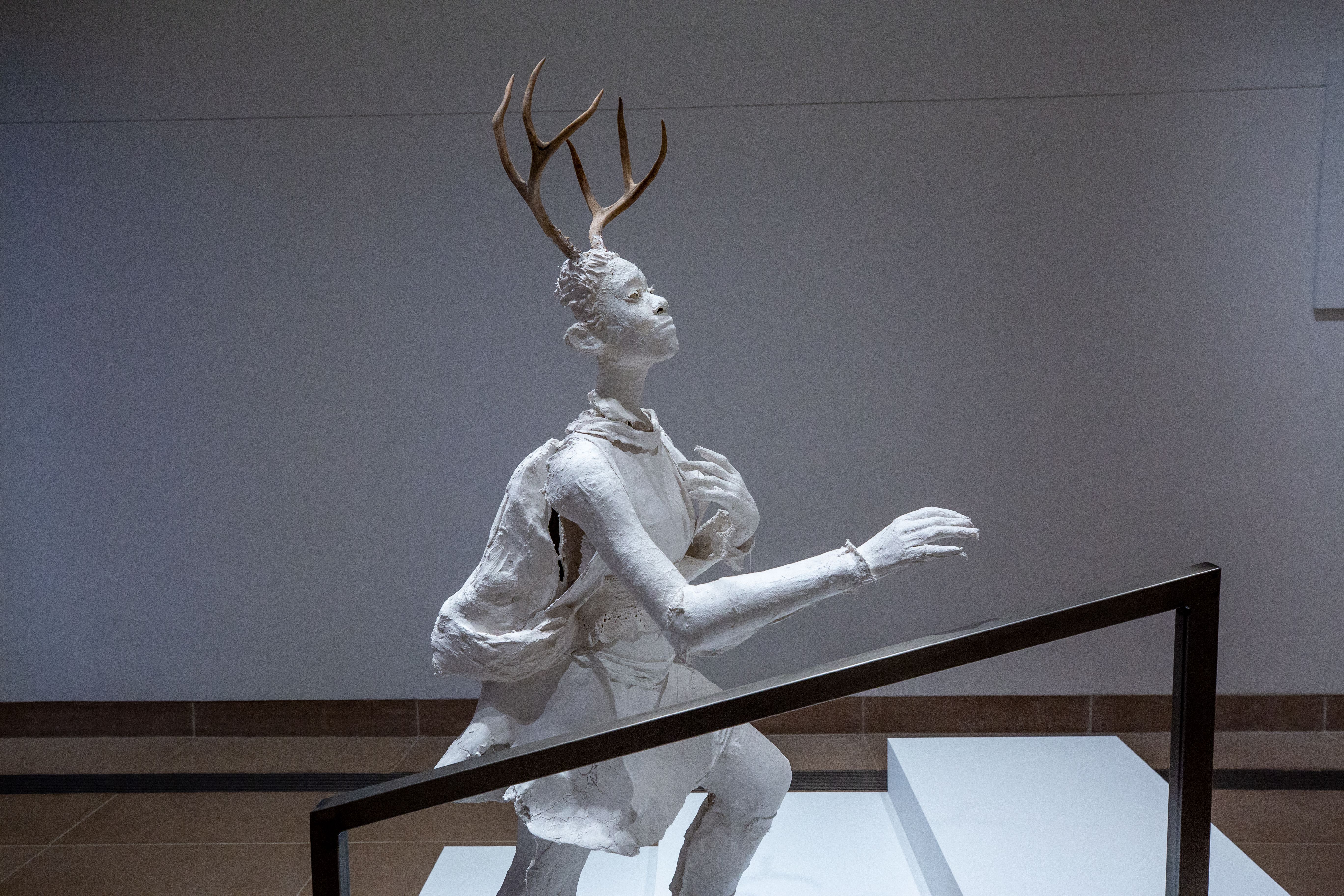 Karon Davis (b. 1977, Reno, Nevada) creates sculptures and multimedia installations that touch on issues of history, race, and violence in the United States, using materials as varied as plaster strips, chicken wire, glass, and readymade objects. Drawing on her background in theater and film, Davis creates haunting tableaux inhabited by protagonists both historical and imagined. The figures are created using the artist’s unique plaster method, amalgamations of life-size casts taken from friends and family as well as her own body. The material reflects her longtime interest in ancient Egyptian mummification practices, using wrapping to memorialize different bodies and their complex histories.