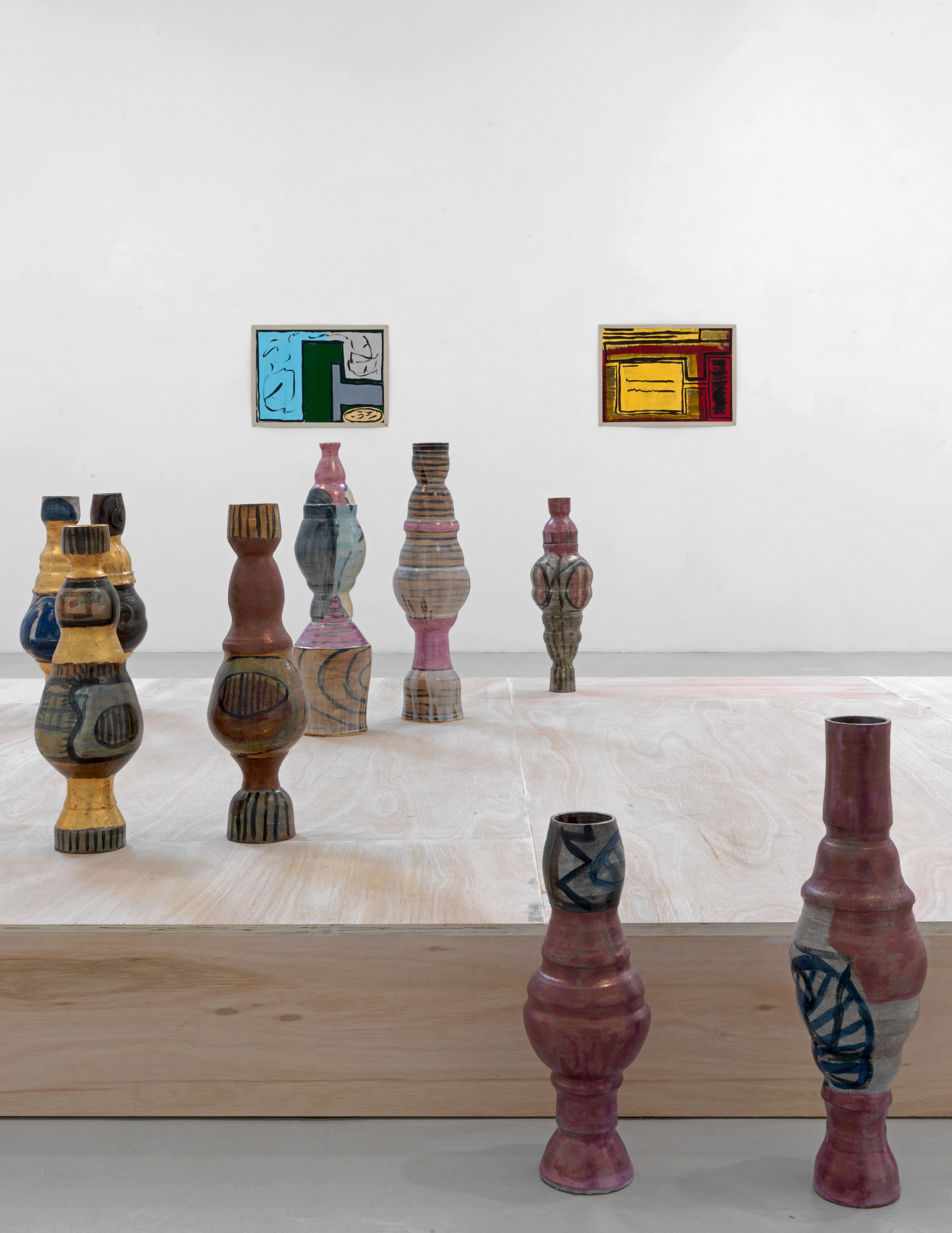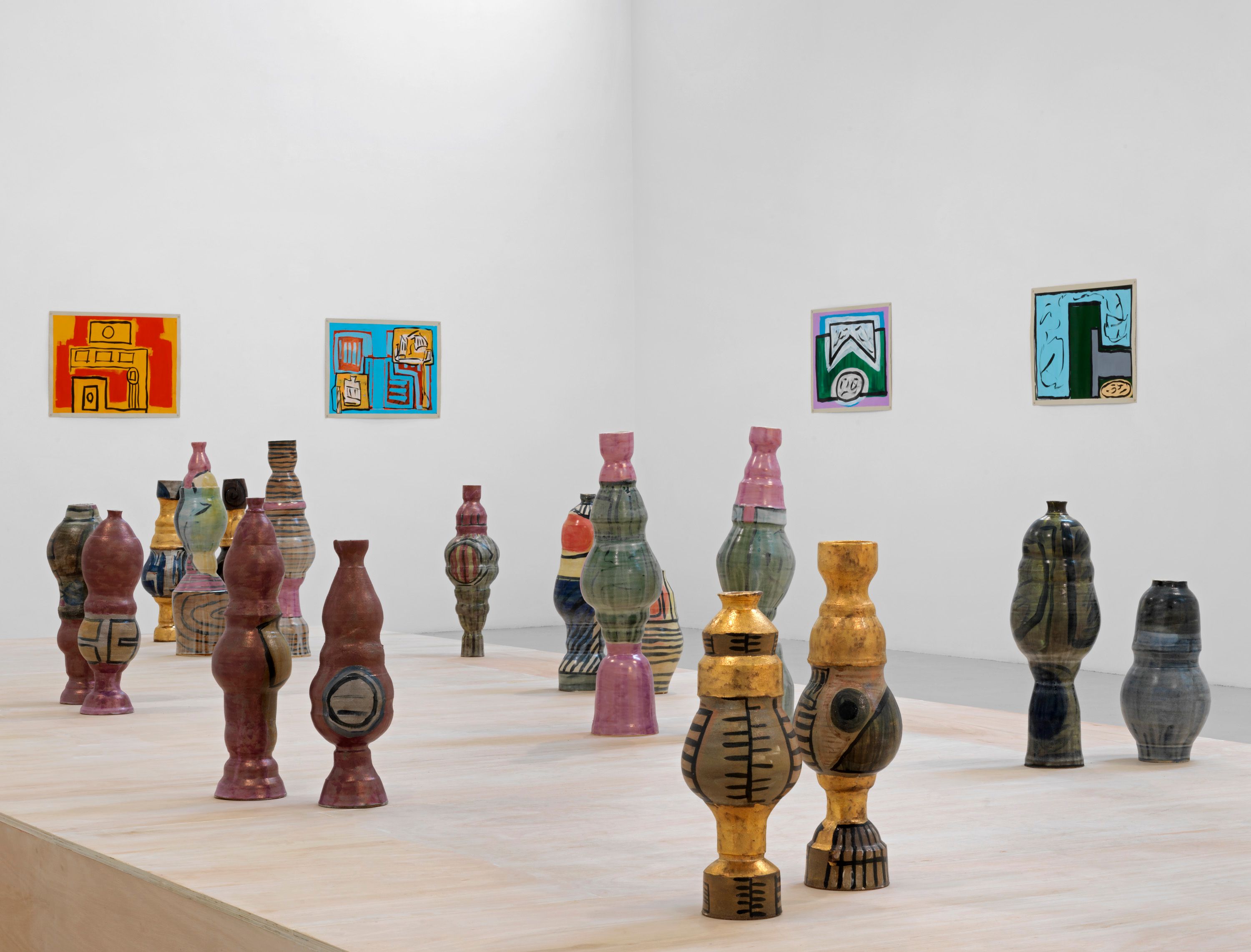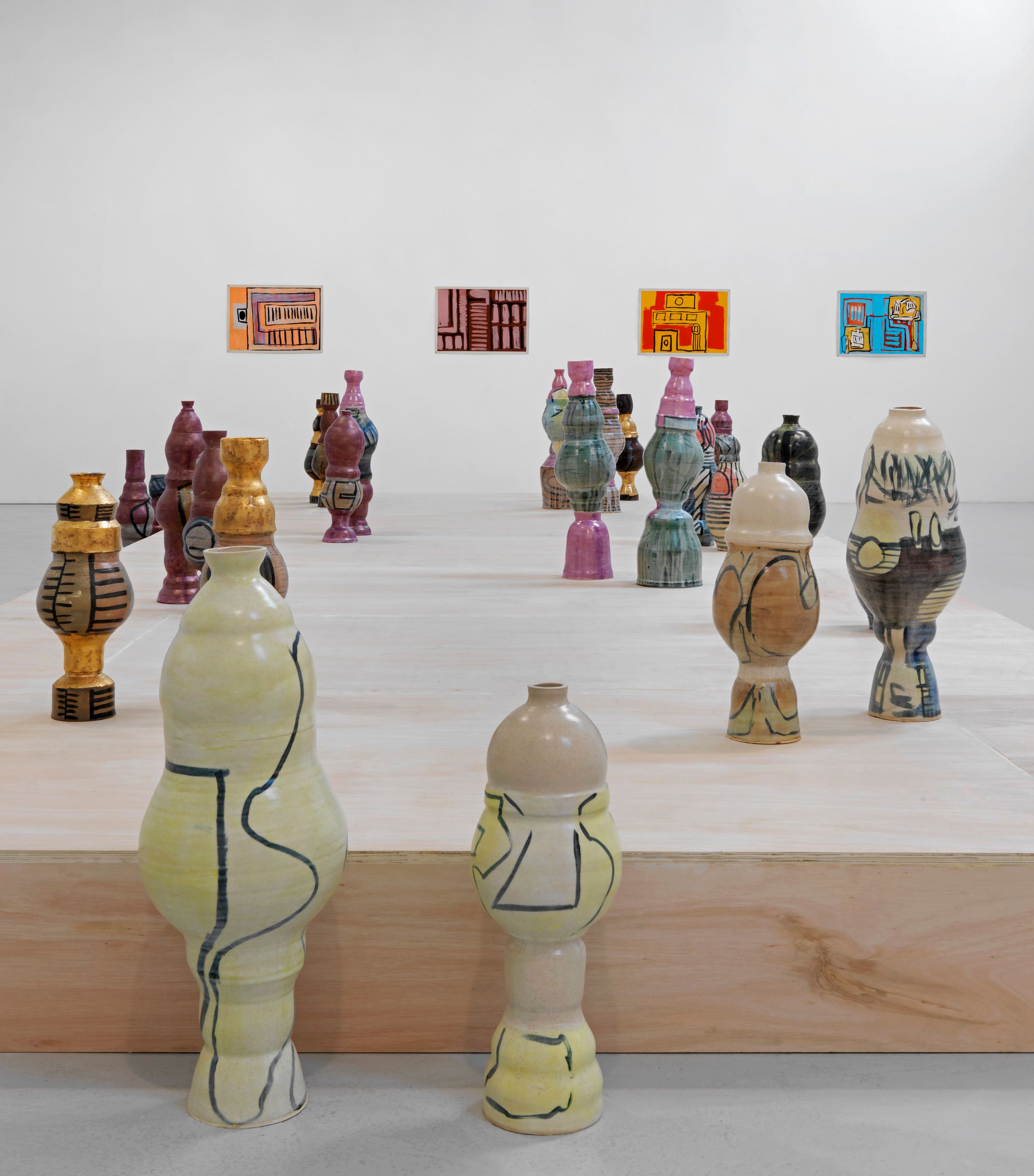 The ceramics explore common tropes from “the Hood”: characters that are often invisible or reduced to stereotypes. The desire is to give them a dignity and humanity that they seldom have in mainstream perceptions. The ceramics are in pairs: one suggesting the personality, the other the appearance of each character. The decoration on the body of the ceramics was painted to different jazz musicians’ music, in an intuitive and improvisational way: the patterns and shapes are the documentation of a dance performed by the artist around the ceramics. Luster and gold are employed to emphasize the worth and status of certain characters in the artist’s eyes.