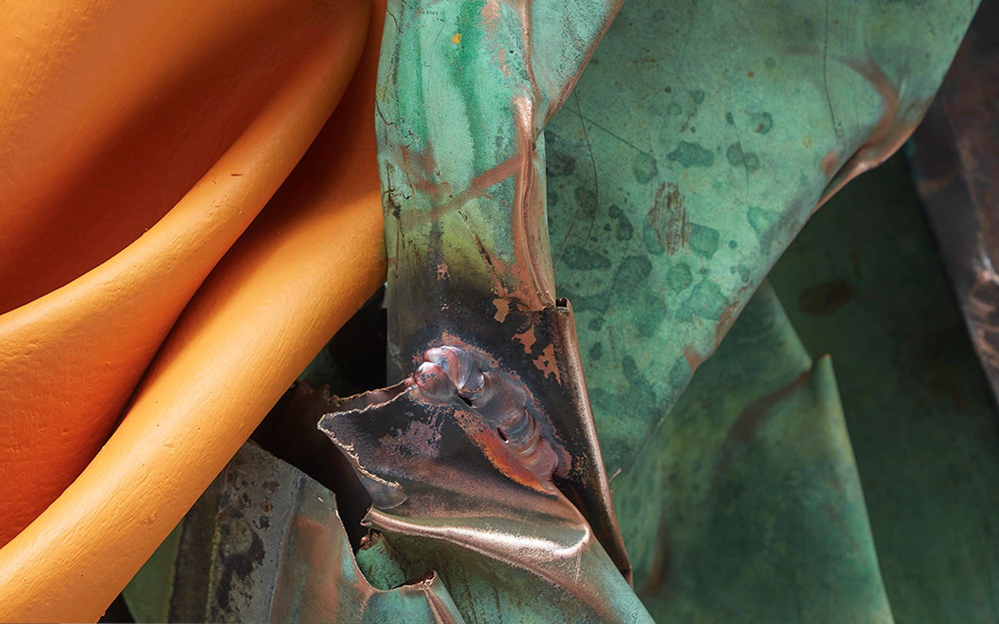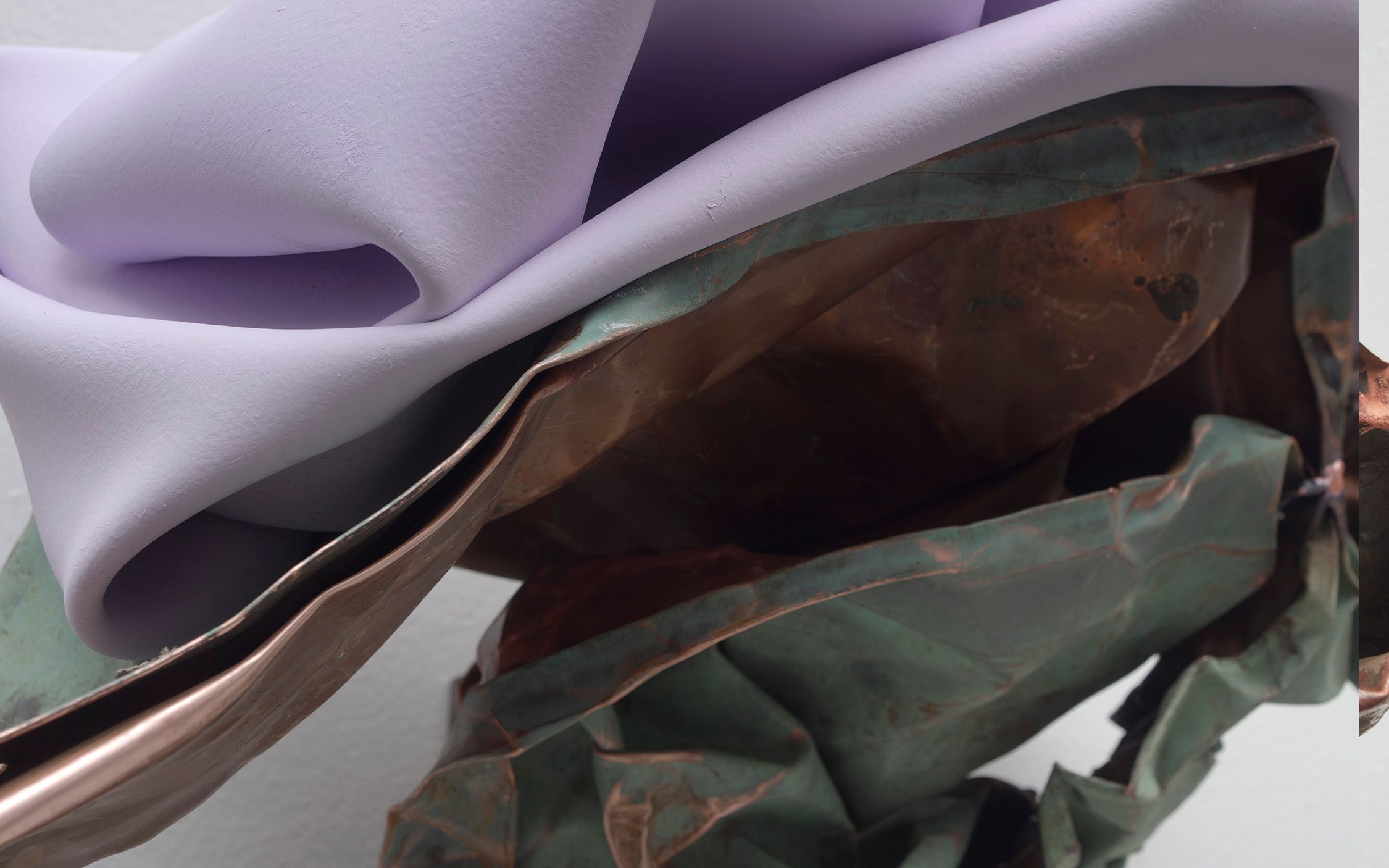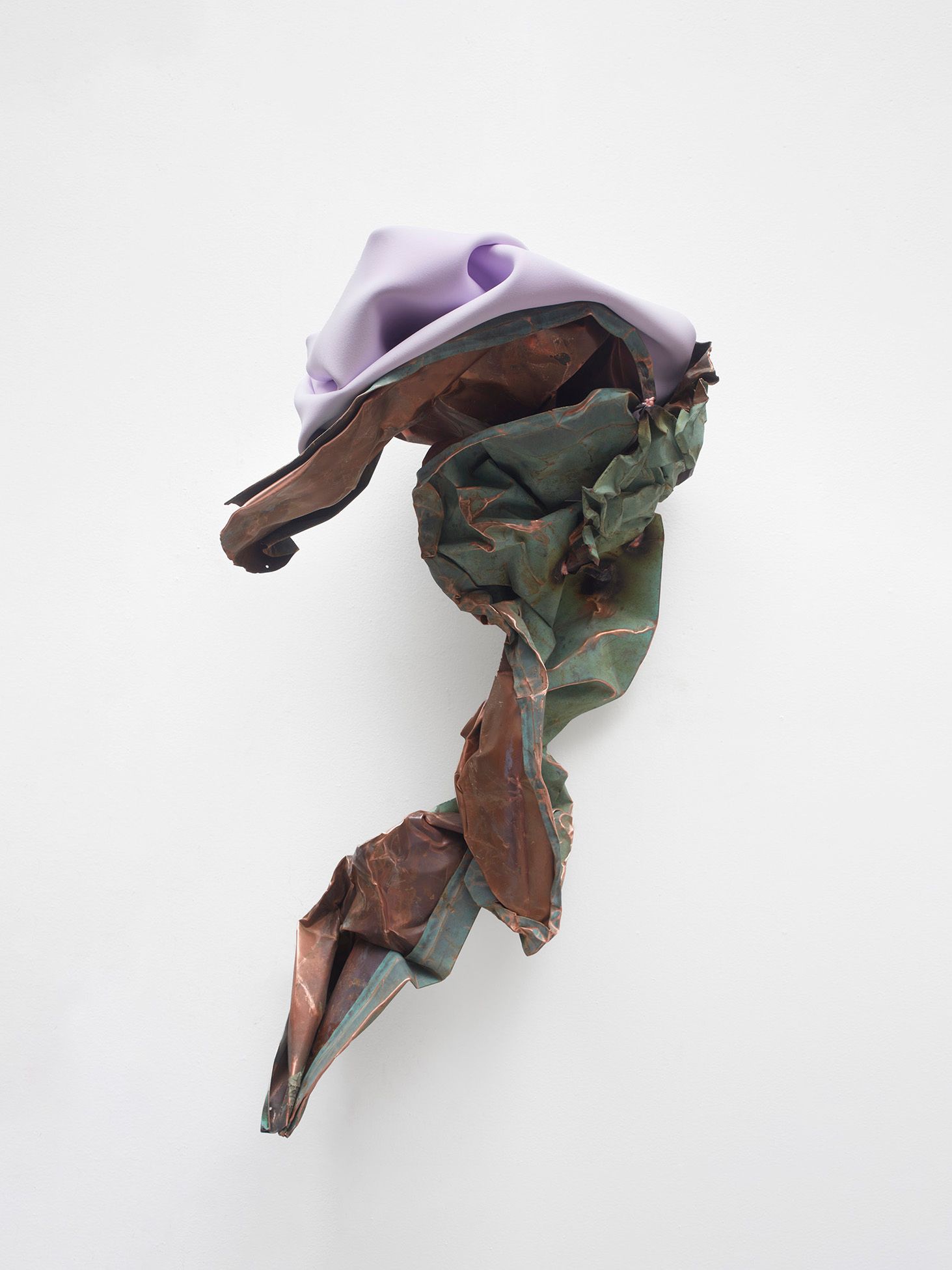 While Yanko has previously ventured into experimentation with a range of materials, including aluminum, copper, steel, and zinc, "She is a Verb" stands out for its exclusive embrace of copper, marking a continued exploration of this metal. Following her debut with Three Generations (2021) at Salon 94 in New York, a powerful storm sheared sections of the gallery’s original copper roof, sending portions of it flying onto the street below. Confronted with the shock of this twisted material, we asked Yanko to give it new life on the occasion of this exhibition.