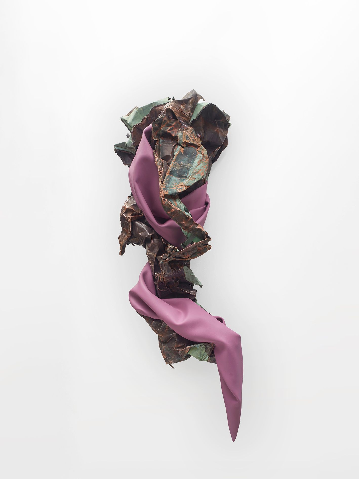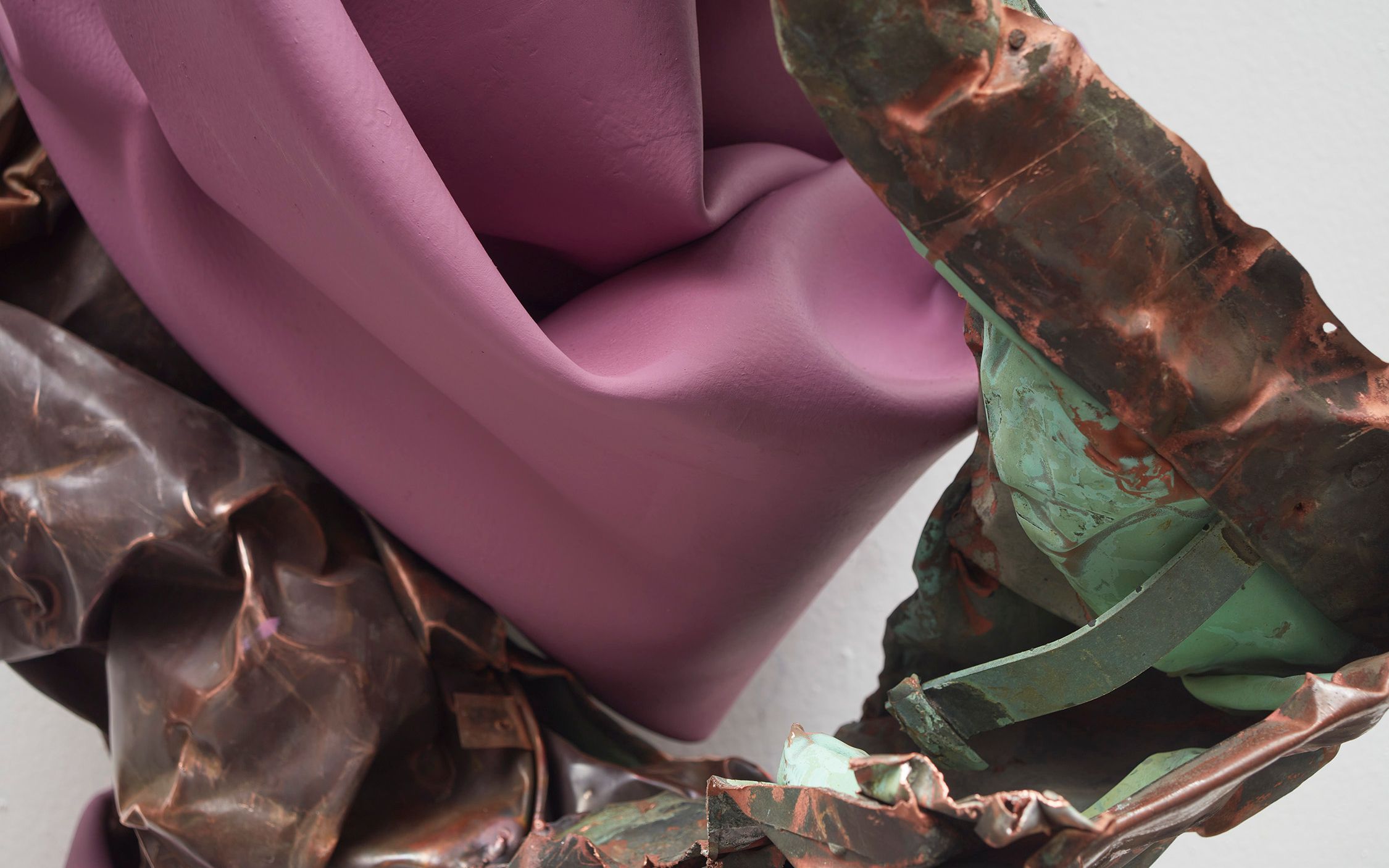 Yanko drapes and bunches these skins like swaths of silk, their colors borrowed from the expansive range of distressed copper on which they rest. Brilliant hues of scarlet, tangerine, and magenta meet softer skins of lavender, mint, and moss green. Here, painting breaks free from the canvas and into our shared space.