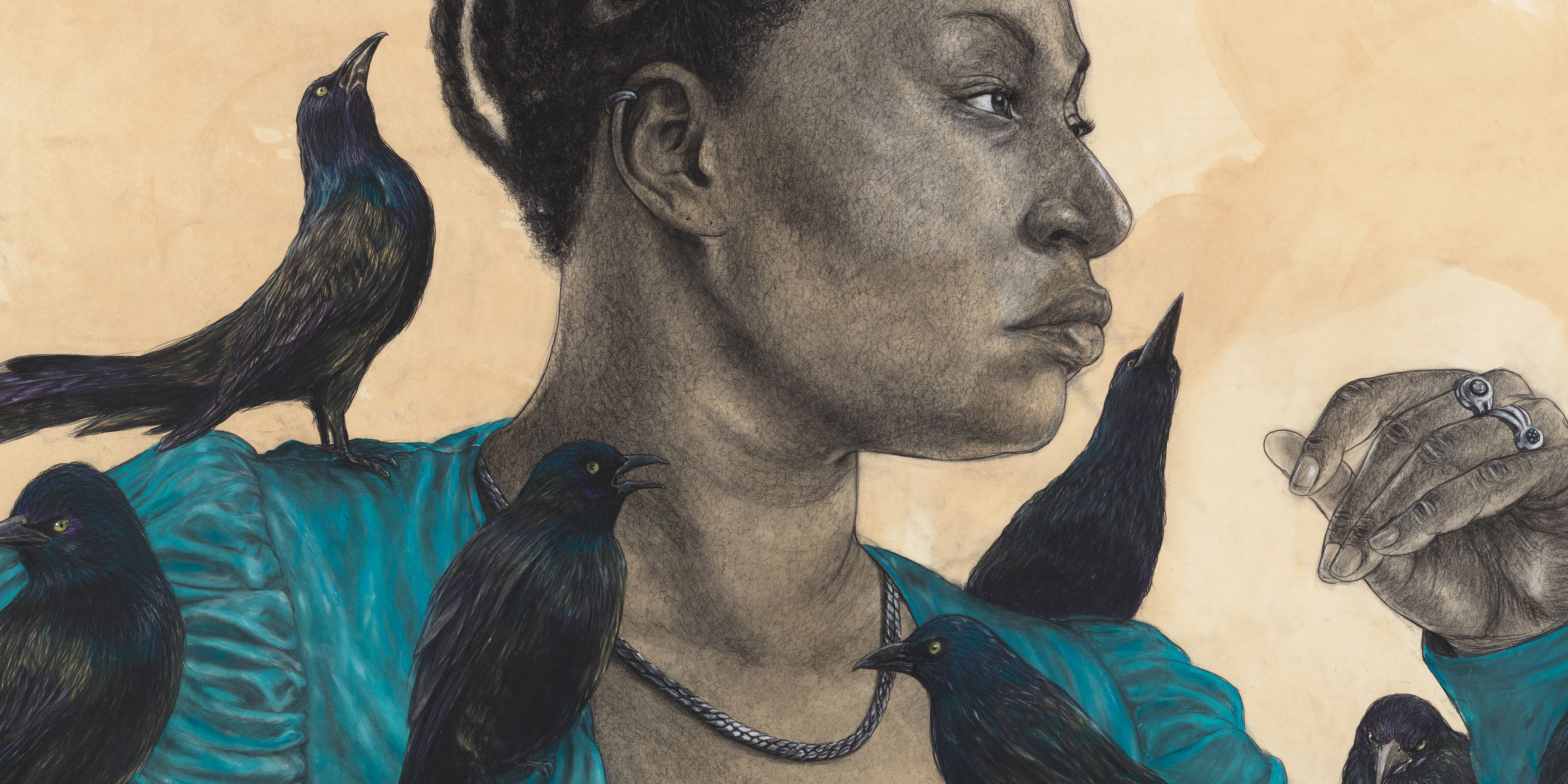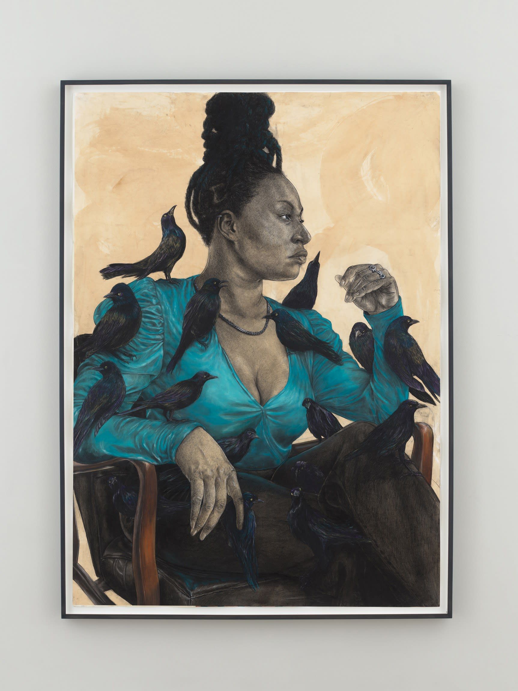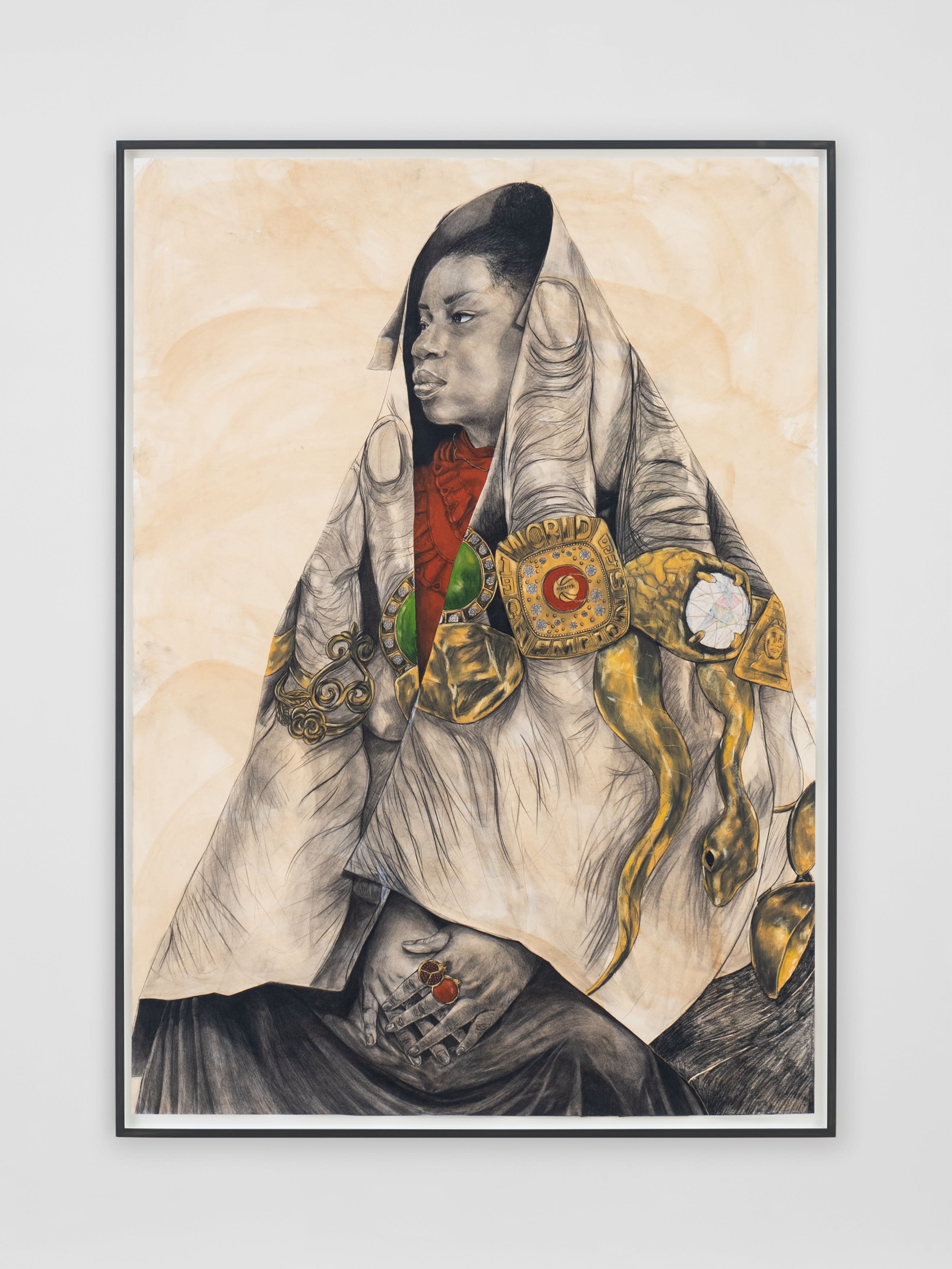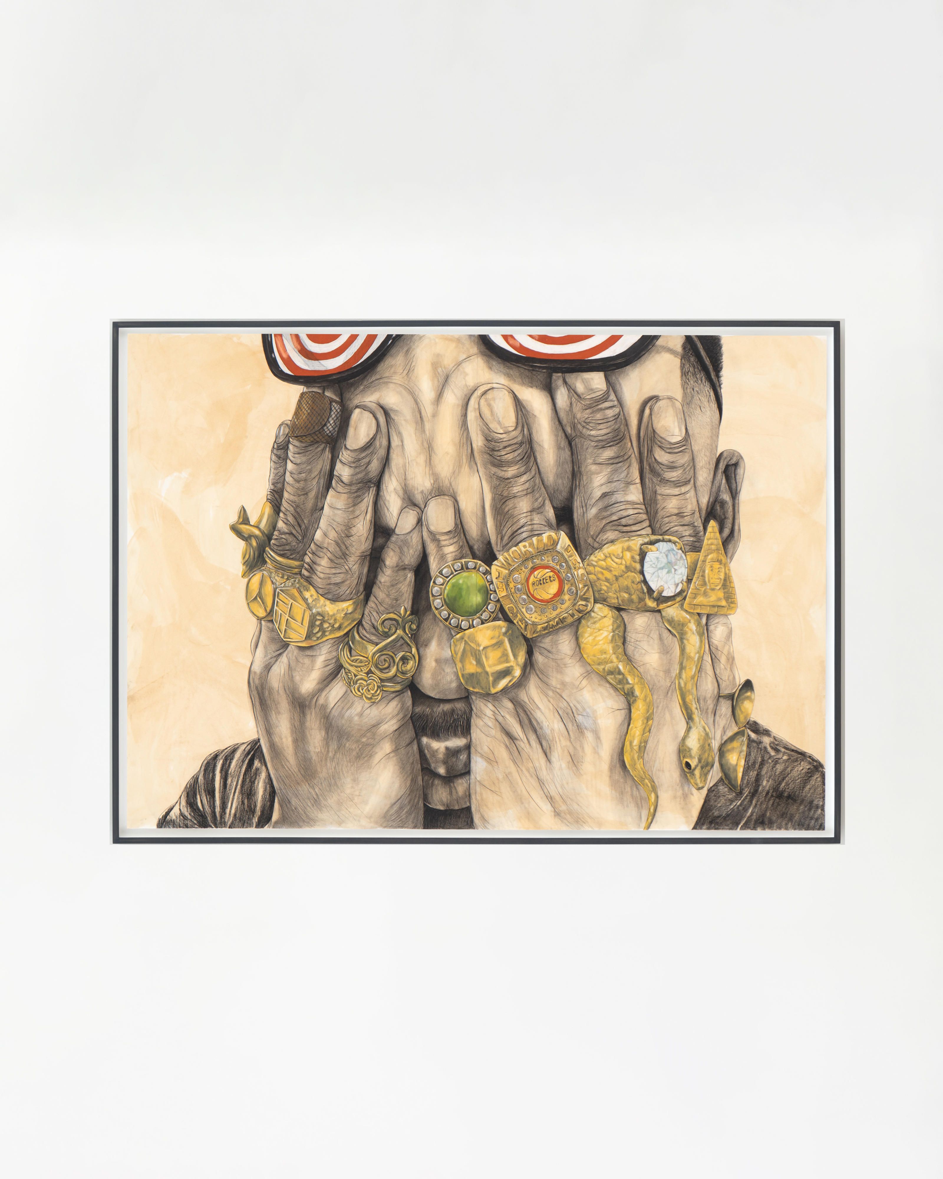 When drawing himself, Pruitt is usually identifiable by his signature X-ray sunglasses. Here, they sit on top of his head almost completely outside of the frame. Turned inward, seemingly fatigued, the artist refuses the gaze of the viewer, with his hand/s becoming the subject of the portrait. This is an example of a visual double entendre. Instead of the sunglasses, his hand or technical ability is foregrounded, obscuring his face in the portrait. Moreover, his hands are adorned with rings made with elements that traditionally function as amulets in several diasporic cultures: gold, peridot stone, and Sankofa symbols, stacked alongside a Houston Rockets championship ring for a good measure of contemporary swag. By casting himself as the antihero—aka Herman Smith, a character plagued by the constructed mythology that confined him—Pruitt calls into question our perceptions of what a “maker” is. Created in tandem, Held her firmly yet gentle as a soft seed (2024) shows Pruitt employing a storytelling device often used in classical oil painting, mise en abyme or the technique of composing a work within a work. This striking detail demonstrates Pruitt’s masterful draftsmanship evident throughout the artist’s oeuvre. Pruitt drapes Portrait of Herman Smith over the figure like a virtuoso protective covering; the self-portrait with amulets becomes the amulet itself, a motif that appears throughout the exhibition.