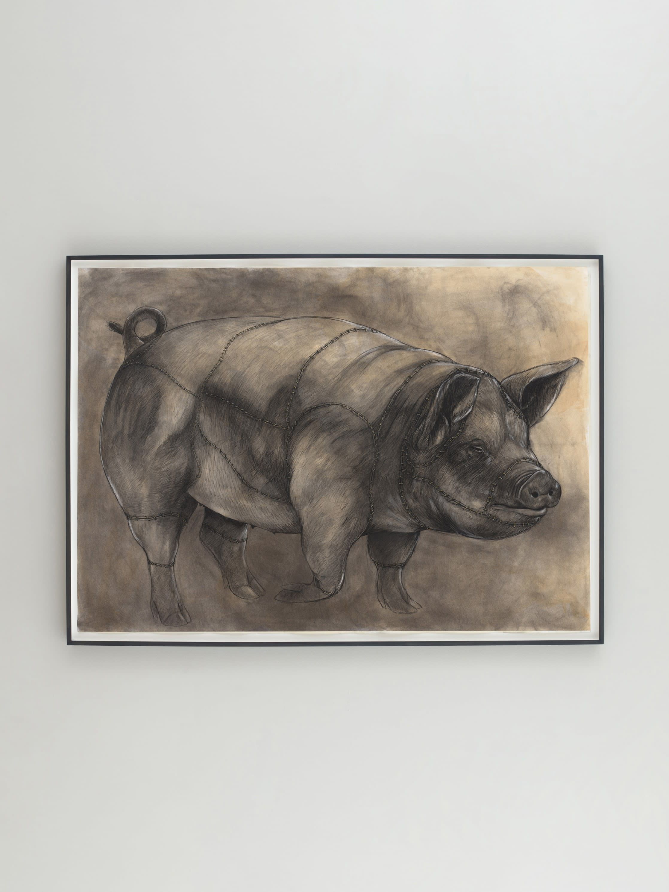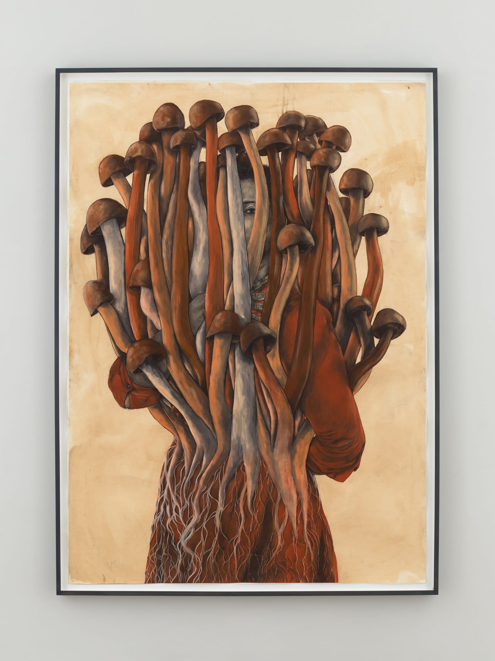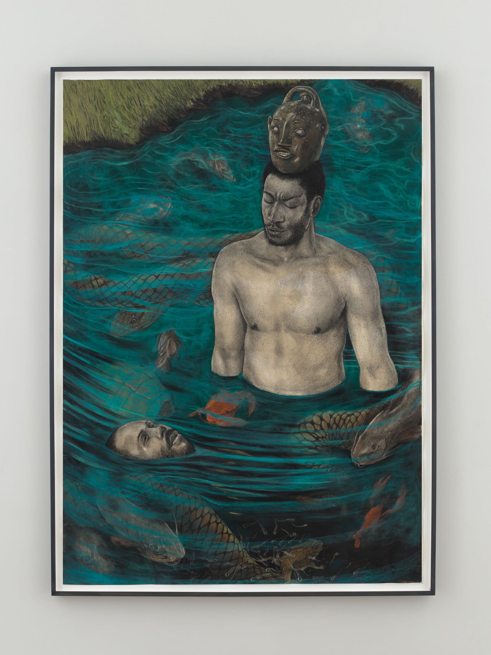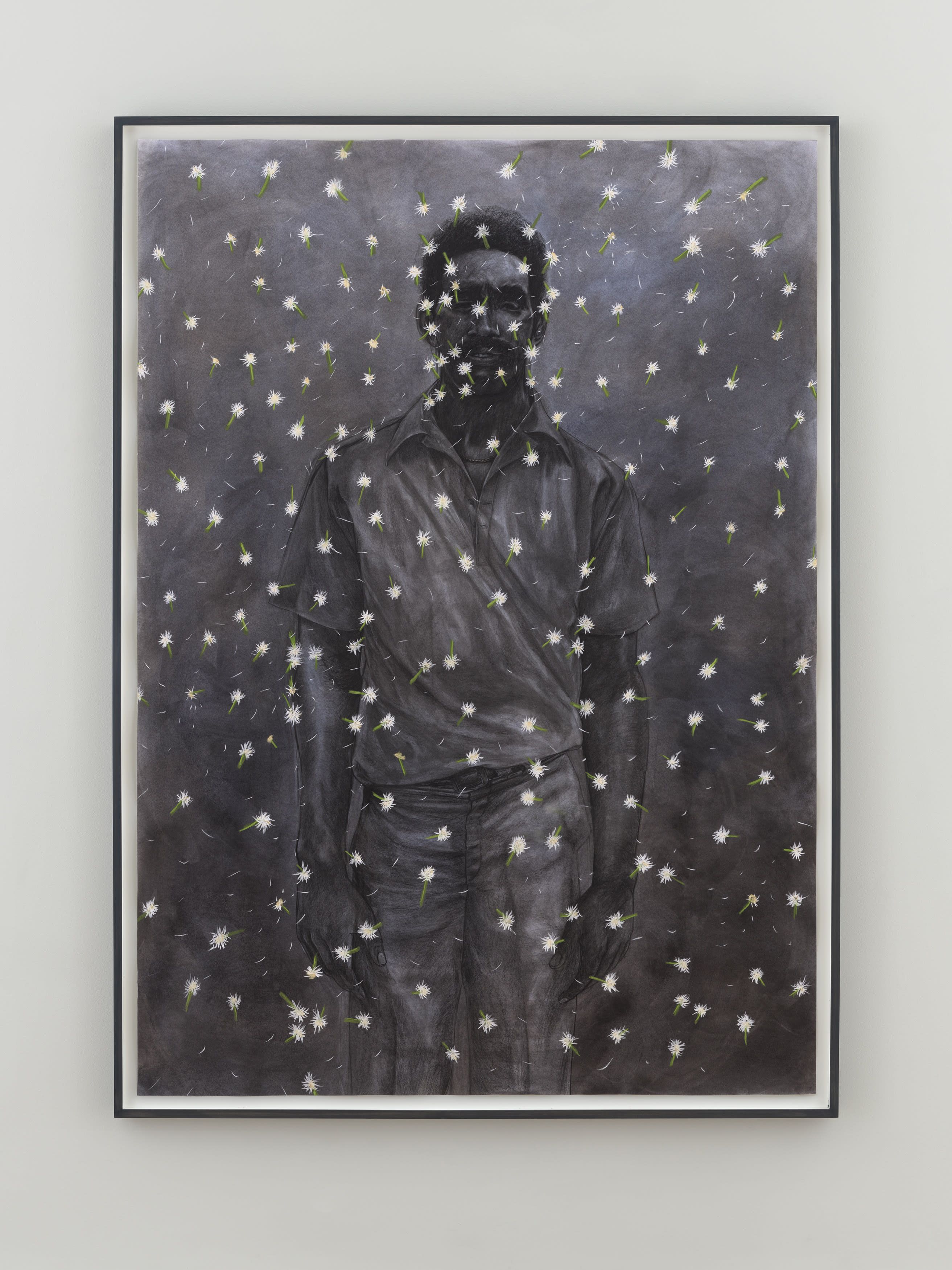 Pruitt, who was born and raised in Houston, Texas, where his family has lived for generations, centers his own origin story to construct iconography around an intimate narrative about life and loss, memory and love. (3) Rather than presenting art-historical themes or tropes, he references an array of influences related to a personal story: Black diasporic narratives, the South, food culture, and rituals. Pruitt photographs live models in bespoke costumes in his studio and then composes his drawings from the photographs, first dyeing the paper with coffee to achieve the nuanced color of his figures.