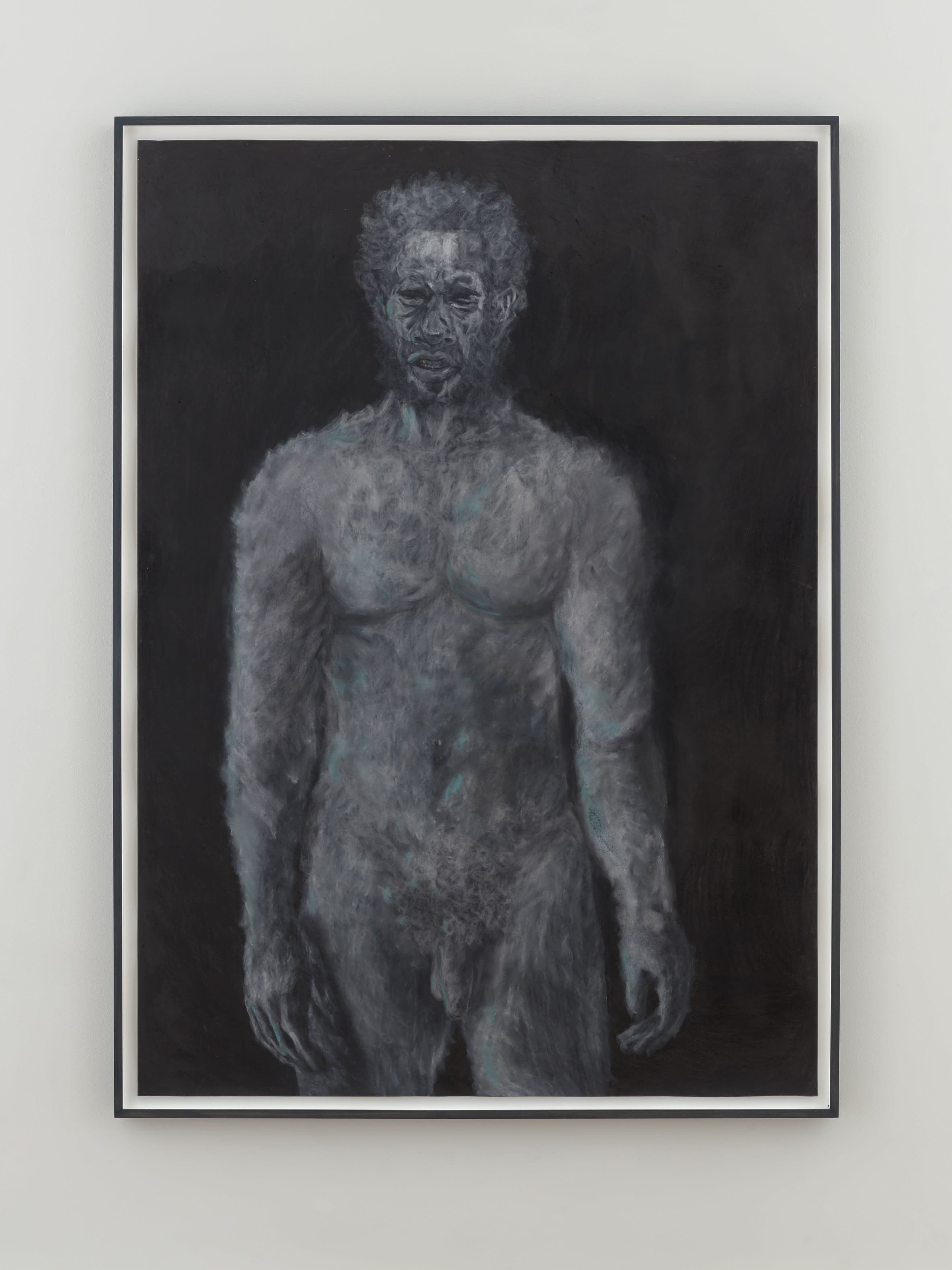 Continuing the theme, Man made of rain clouds (2024) and Monster on a 15 (2025) is another protagonist/antagonist pairing in dialogue. Man made of rain clouds is a portrait of a man in crisis; tender and finite. Pruitt strips away bravado and his trademark hyperrealism to portray a figure with emotional fragility and a deep need for care. It is a powerful reframing of male vulnerability within a society that often denies it. In this work, the nude figure is a field of gesture with hints of blue and a single gold tooth. In a surreal bloom, he is beautiful, eerie, indeterminate. The absence of eyes or clothing make the figure feel both divine and disconnected, like a symbol of authority that has lost its humanity—bizarre and strangely affecting. It made me think about inheritance, pressure, and how vulnerability is passed down or ignored altogether. The protagonist in Monster on a 15 is somber in his all-consuming children’s costume, his lit cigarette precariously close to the expressive strokes of his bright blue fur. Pruitt describes the work as a “play on contradictions: masculinity and scale, and the absurdity of fictional monstrosity.”(4)