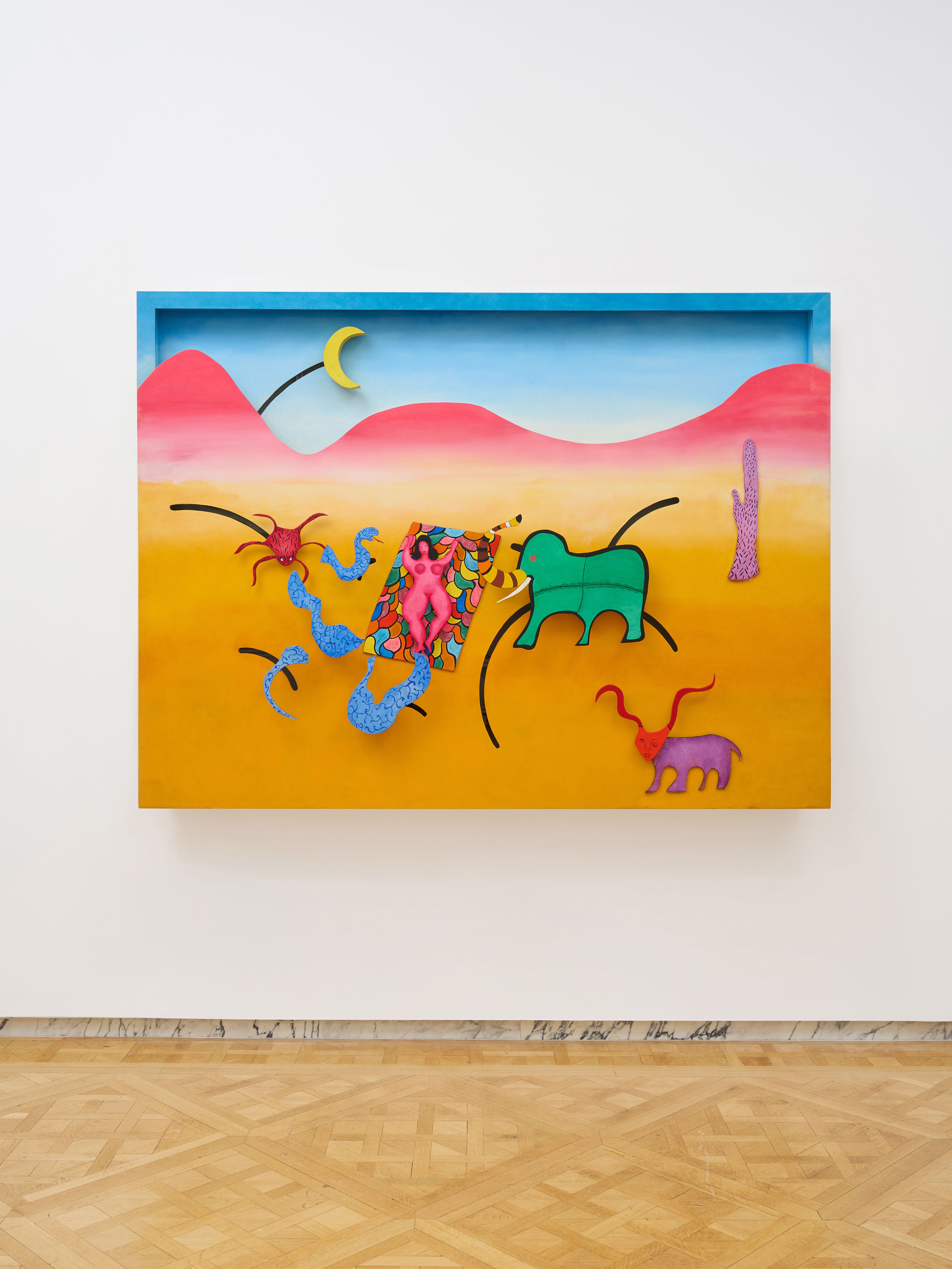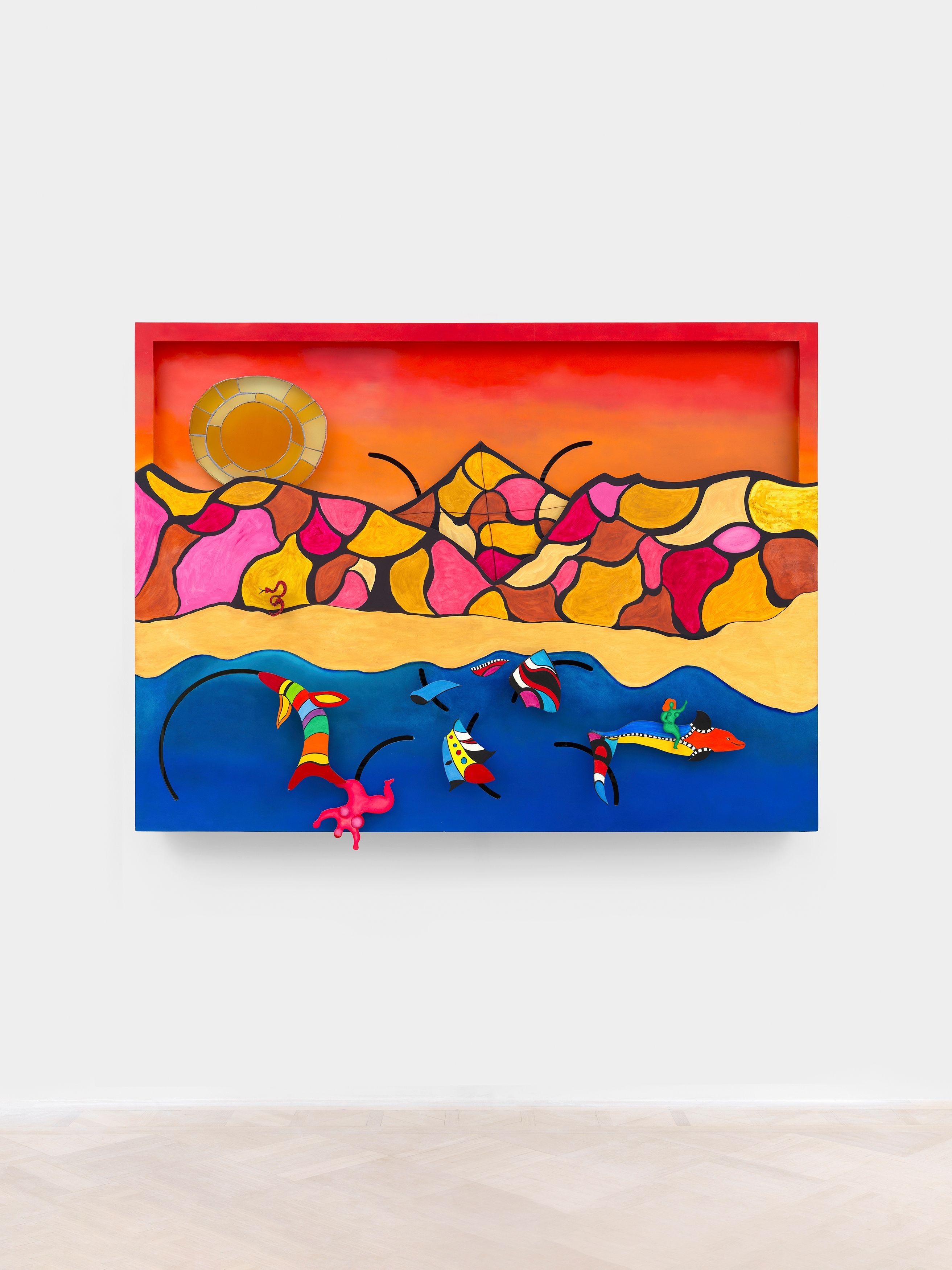 This April, Salon 94 is proud to present our second solo exhibition of French-American artist Niki de Saint Phalle, featuring five works of her late-career Tableaux Éclatés, the series first exhibited in her retrospective at the Musée d'Art Moderne de Paris in 1993. The dynamic Tableaux Éclatés (“Burst Paintings”) are vibrant, mechanized pictures depicting landscapes upon which animals and still lifes, as well as her trademark Nanas, dance across beaches, deserts, and seas. Each painting’s composition is animated through an intricate motorized armature activated through a photo sensor: when the artwork recognizes a viewer, internal motors trigger motion of the work’s disparate elements or illuminate the scene with brilliant electric bulbs.
