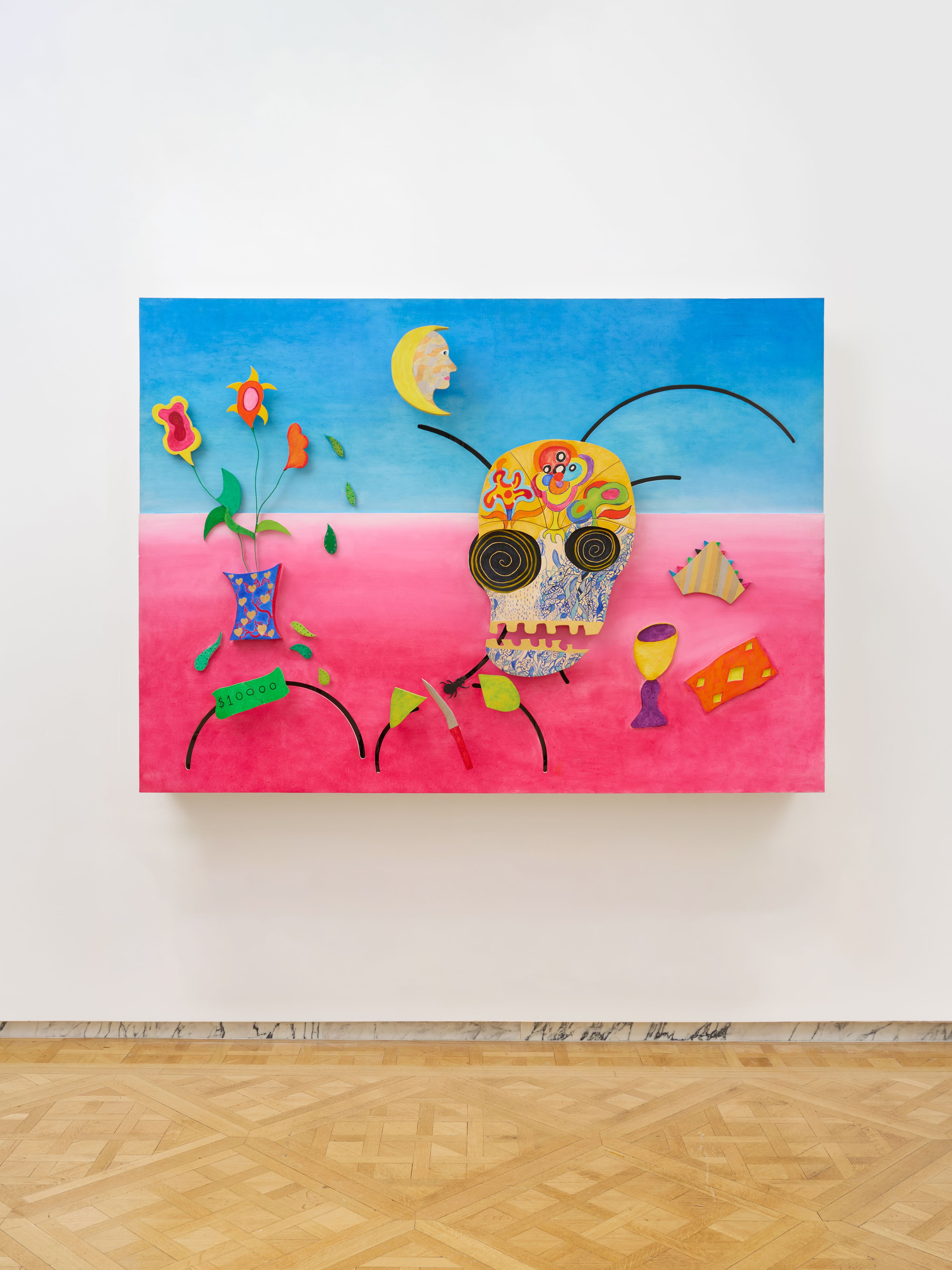 Performing in the Tableaux Éclatés are Saint Phalle’s iconic 1960s Nanas, emancipated women whose shapely bodies and colorful regalia profess a playful, assertive, and feminist affirmation in opposition to the passive odalisques common throughout Western art. Other Tableaux Éclatés are rife with art-historical symbols: the skull and flowers in I Woke Up Last Night (1994) recall vanitas paintings of European Old Masters that picture the fleeting pleasures of earthly life—though Saint Phalle’s interpretation is novel for its remixing of the still life as moving in perpetuity. Following the death of her husband, Swiss artist Jean Tinguely, in 1991, and the development of her own ailments, Saint Phalle also searched for answers about life after death across religions. She was taken by the story of the Hindu deity Ganesh, who lived after decapitation and came to represent rebirth in the face of hardship. The spiral—a recurring theme in the artist’s life and perhaps the oldest known symbol of life’s cycles of birth and death—finds eternal rotation in the belly of La Déesse Noire (1993), whose womb is a golden treasure and borrows its form from the tiniest strands of DNA to the immensity of galaxies, as well as the coils of her friend Alexander Calder—and, of course, the motors of Tinguely.