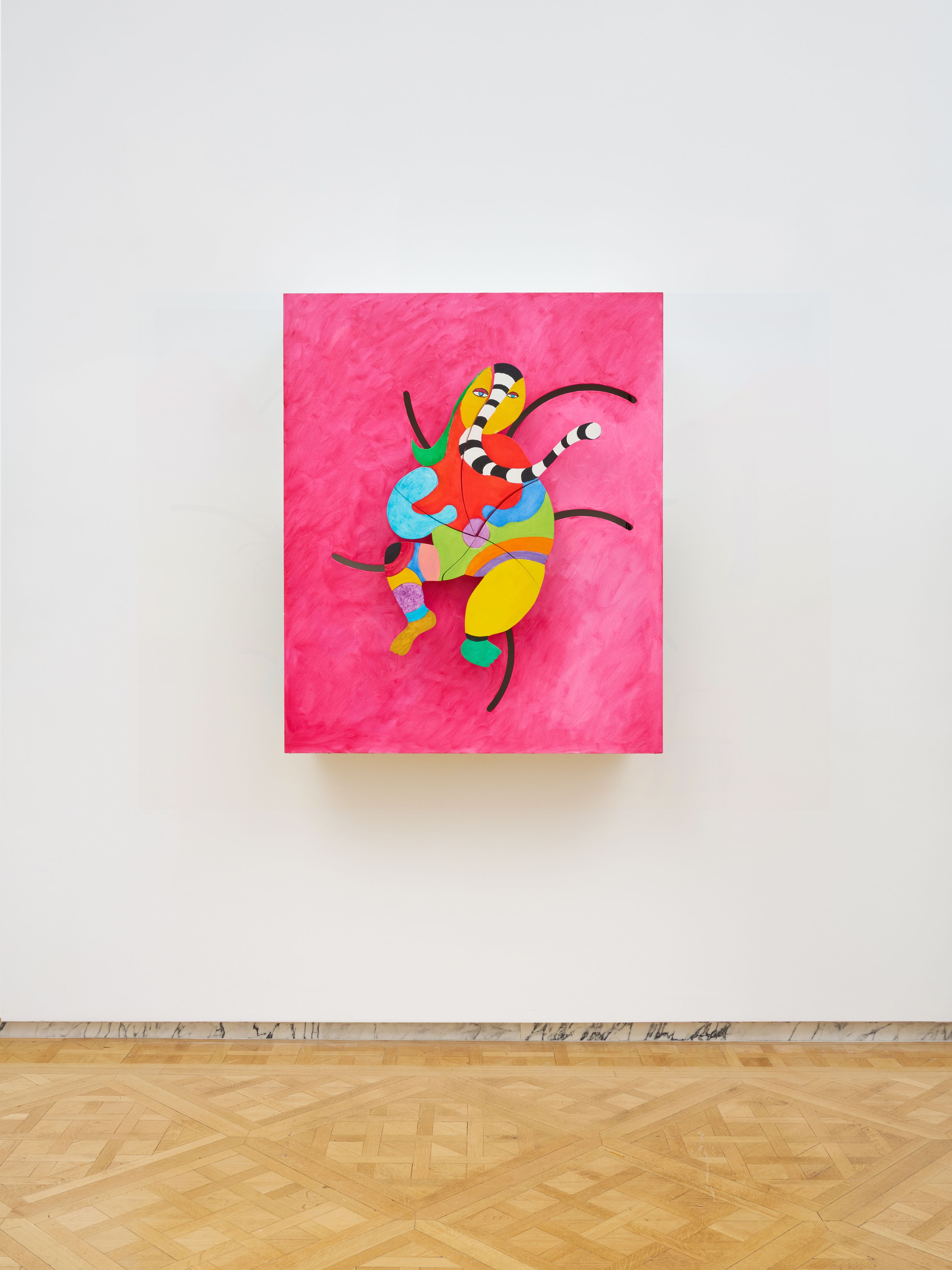Inspired by Tinguely’s practice of kinetic Méta-reliefs, Saint Phalle took up dynamic movement in her own work. She invented new strategies for animating two-dimensional relief paintings, as she did previously when she aimed her rifle at canvases in her Tirs (“shooting paintings”) of the early 1960s. She again found a way to go beyond the limits of the medium, making the framework burst and fragment and come back together again through the introduction of unexpected movement: to be rejoined. The Tirs series saw the artist’s spectacular creation of a painting by shooting a gun at the canvas, creating composition by exploding containers of concealed paint in happenings that evolved in their performative nature. Forty years later with the Tableaux Éclatés she revisits performance, this time in the work, allowing Saint Phalle to delightfully reveal dynamic, complicated narratives while metaphorically coming to terms with the immense loss of her partner.
