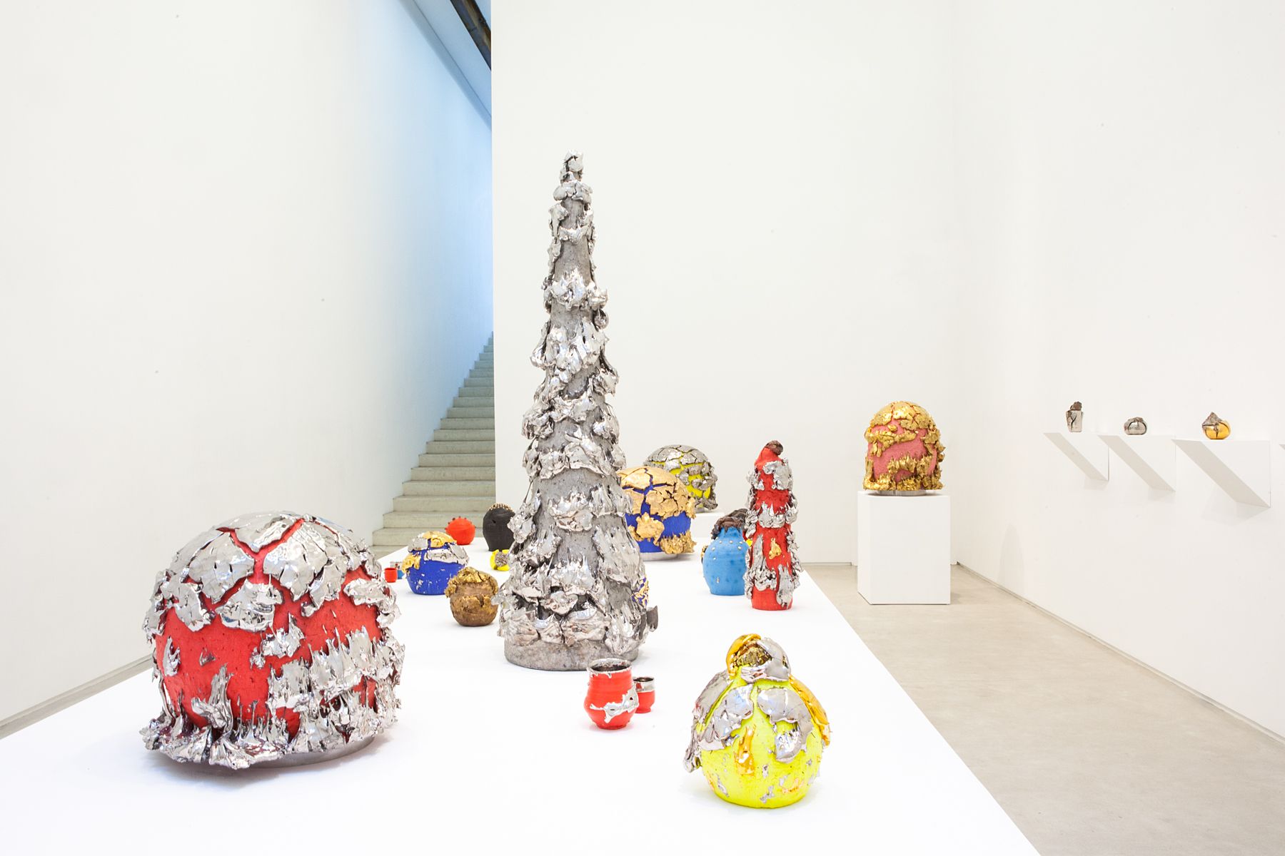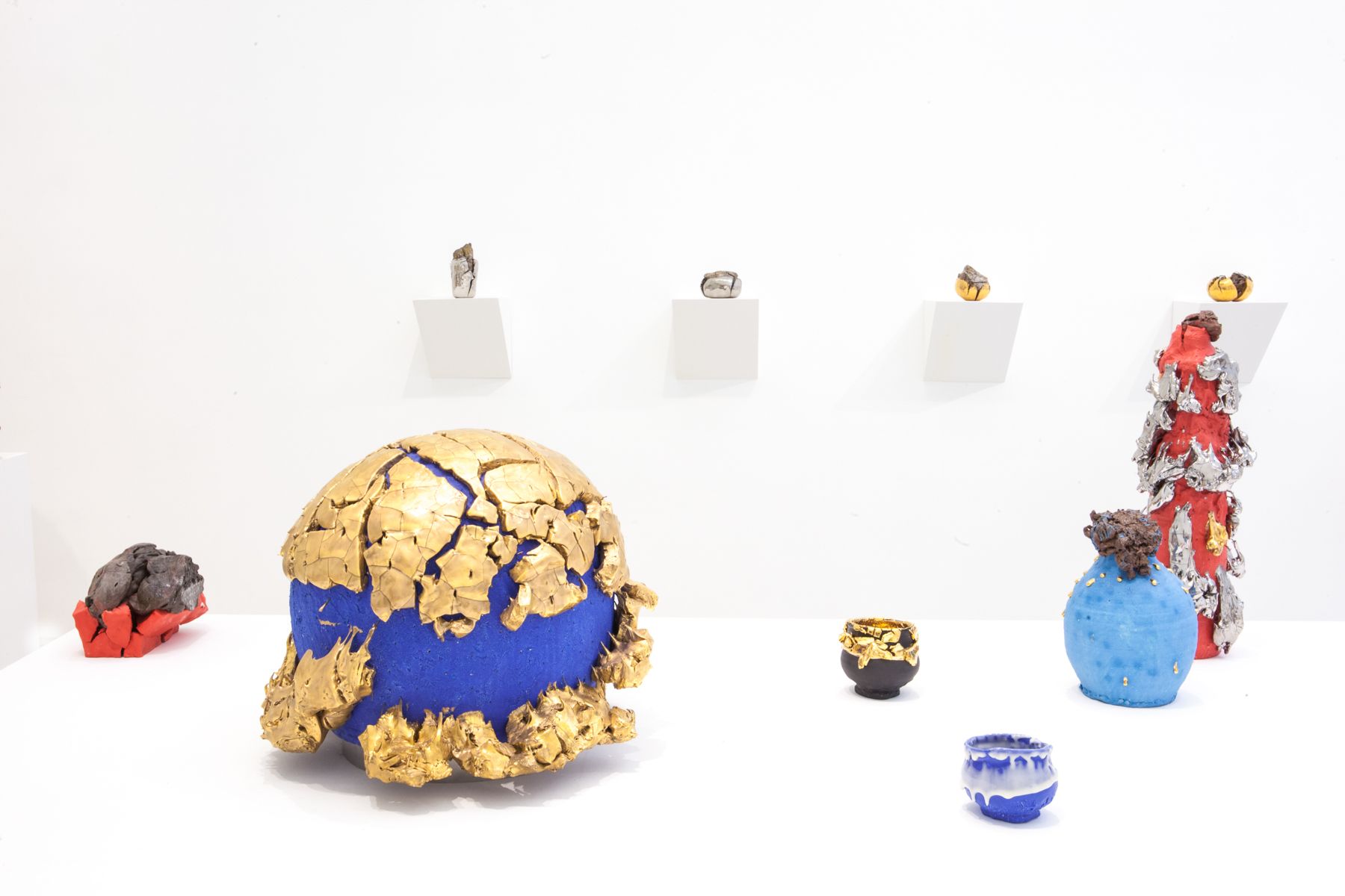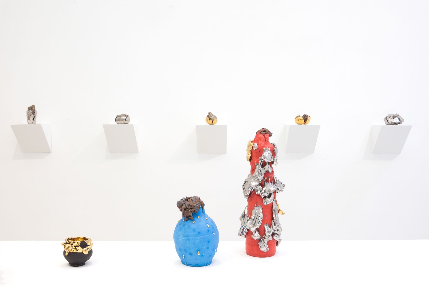 Kuwata also turns up the volume on Ishihaze or “stone explosion”. By adding stones to his clay mix, when fired, they puncture and burst through the clay, as if a tooth growing out of place. In his hands, the shrunken, crackled glaze of the Kairagi technique brings to mind exploded prehistoric eggs or plants dipped in metal. Kuwata actually adds powdered platinum and almost pure gold on top of the cracked white glazed and refires it. In other works, the cracked mercury surface breaks on top, and spikes of the metallic substrate pierce through the surface, to melt at the bottom. Kuwata has pioneered the incorporation of needles employed in the construction of kilns, using them in the ceramic works to catch the glaze on its slide down, creating a textural marvel and mystery. Some of the sculptures are functional; others stand as abstract totems—their origin and time slipping from East to West, past to future.
