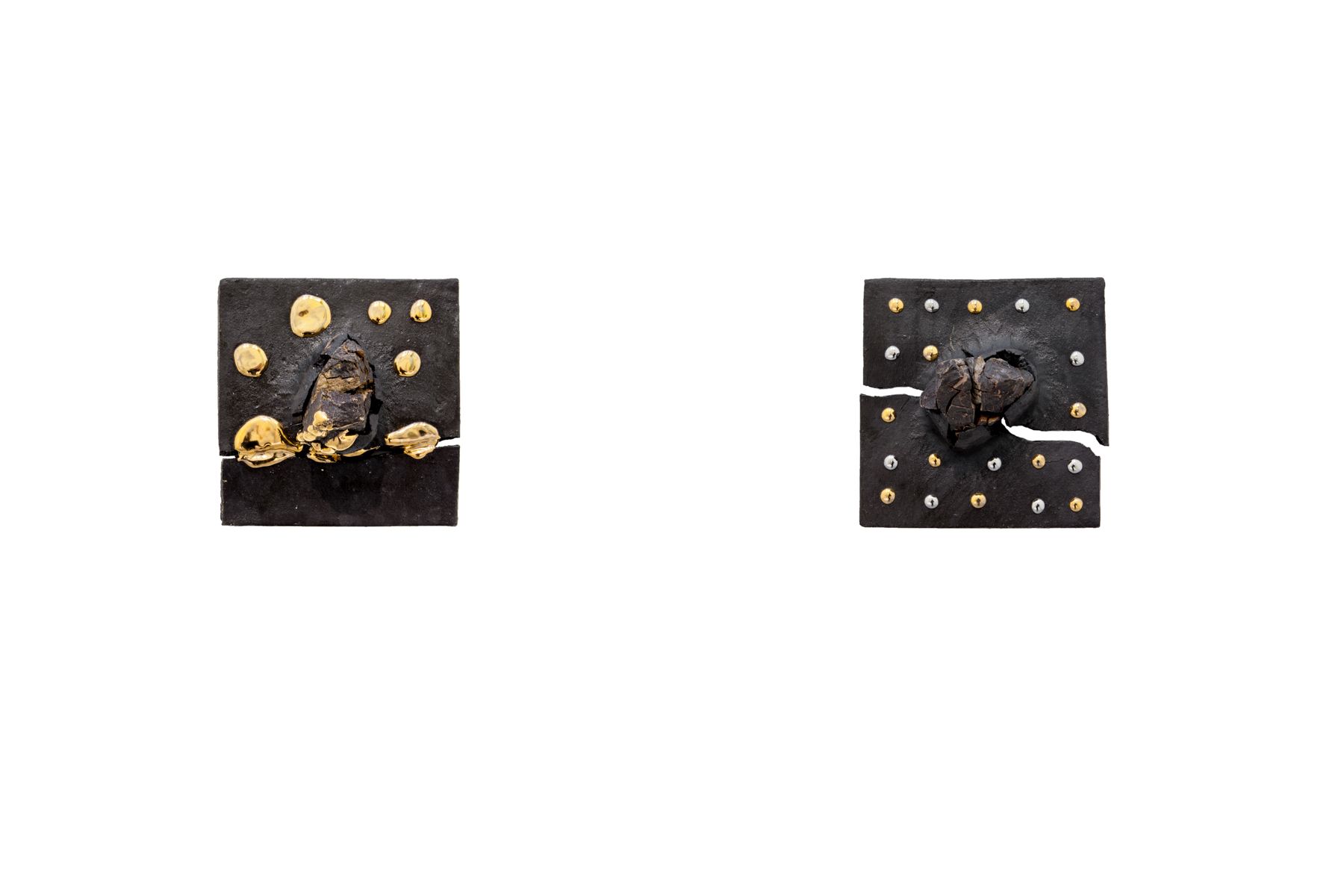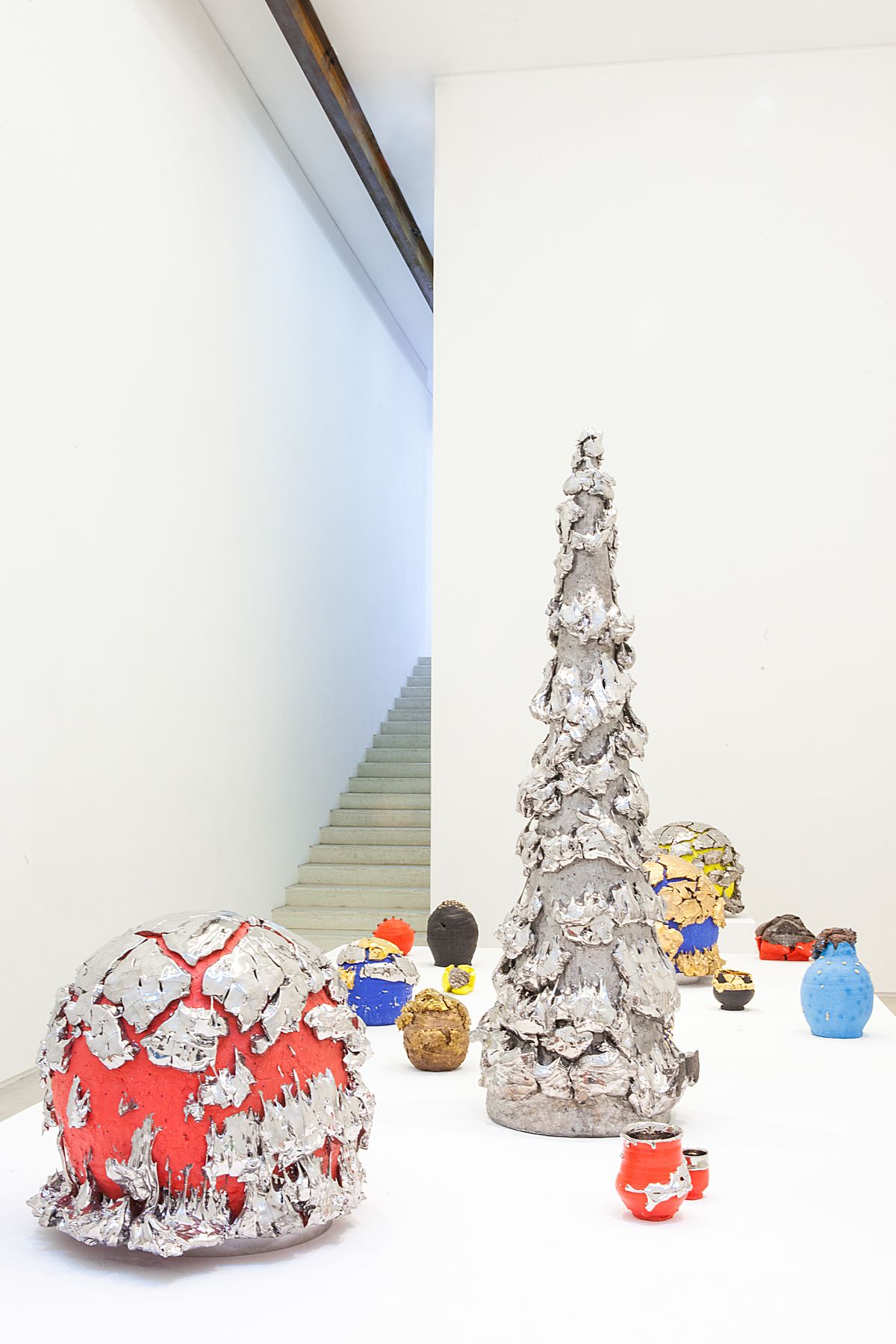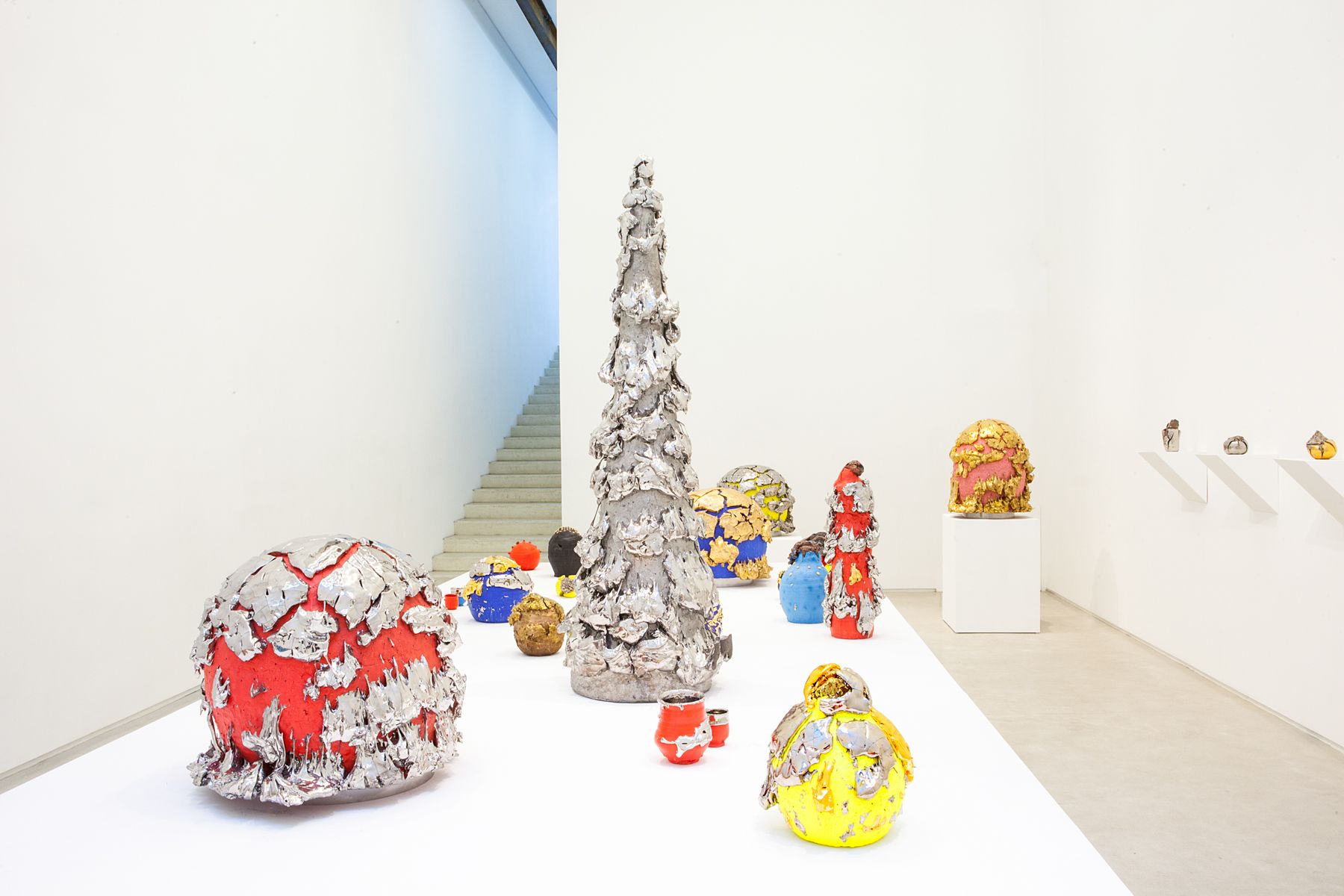 Kuwata also turns up the volume on Ishihaze or “stone explosion”. By adding stones to his clay mix, when fired, they puncture and burst through the clay, as if a tooth growing out of place. In his hands, the shrunken, crackled glaze of the Kairagi technique brings to mind exploded prehistoric eggs or plants dipped in metal. Kuwata actually adds powdered platinum and almost pure gold on top of the cracked white glazed and refires it. In other works, the cracked mercury surface breaks on top, and spikes of the metallic substrate pierce through the surface, to melt at the bottom. Kuwata has pioneered the incorporation of needles employed in the construction of kilns, using them in the ceramic works to catch the glaze on its slide down, creating a textural marvel and mystery. Some of the sculptures are functional; others stand as abstract totems—their origin and time slipping from East to West, past to future.