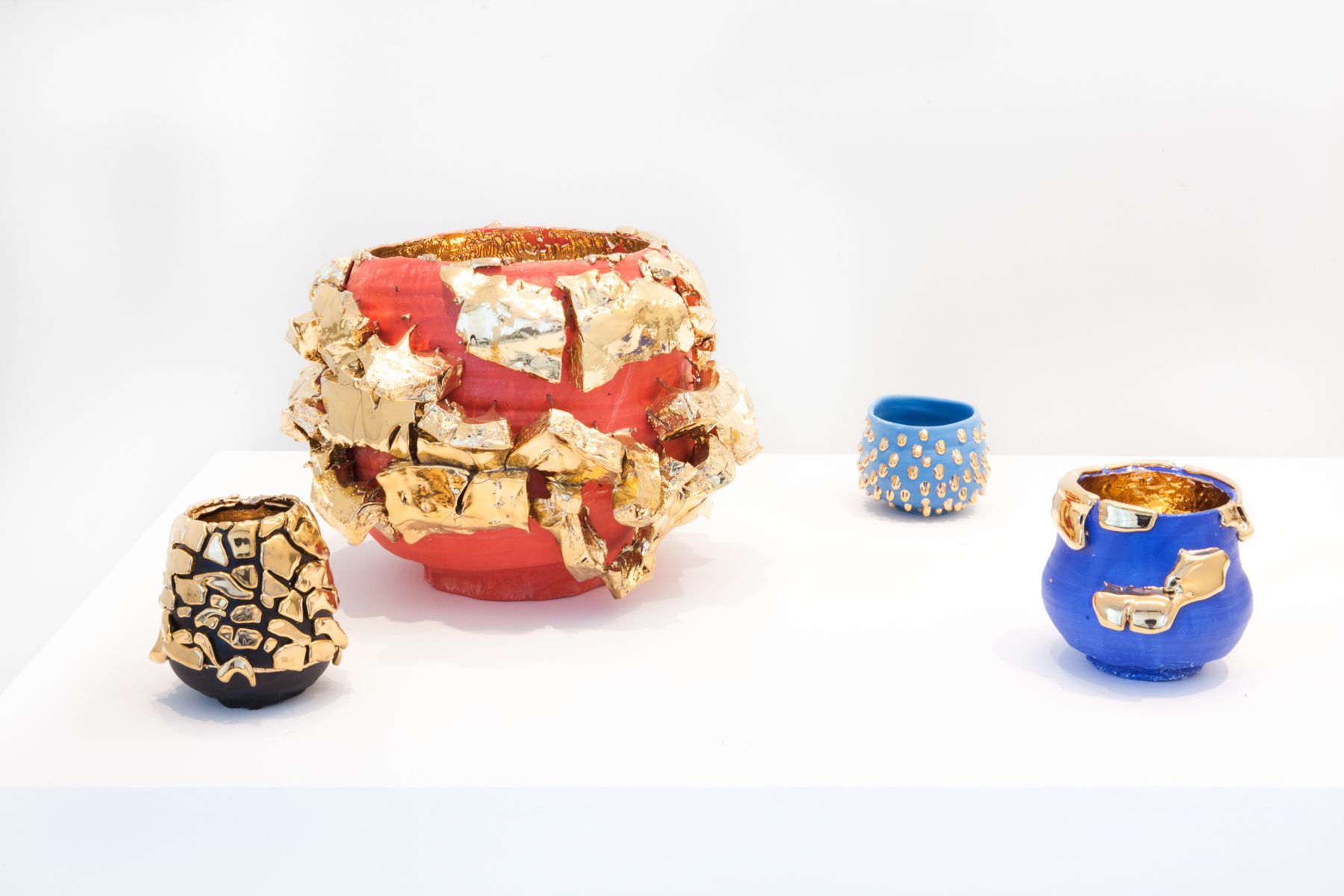 Riffing on the classical tea vessel, Kuwata plays freely with an intense chromatic repertoire: blue, red and gold are a favored palette—quoting Yves Klein and Yayoi Kusama with whimsy and sophistication. The vivid colors paired with the metallic glazes provide an at once rustic and futuristic update to the more austere wabi sabi aesthetic of traditional tea ceremony wares.
