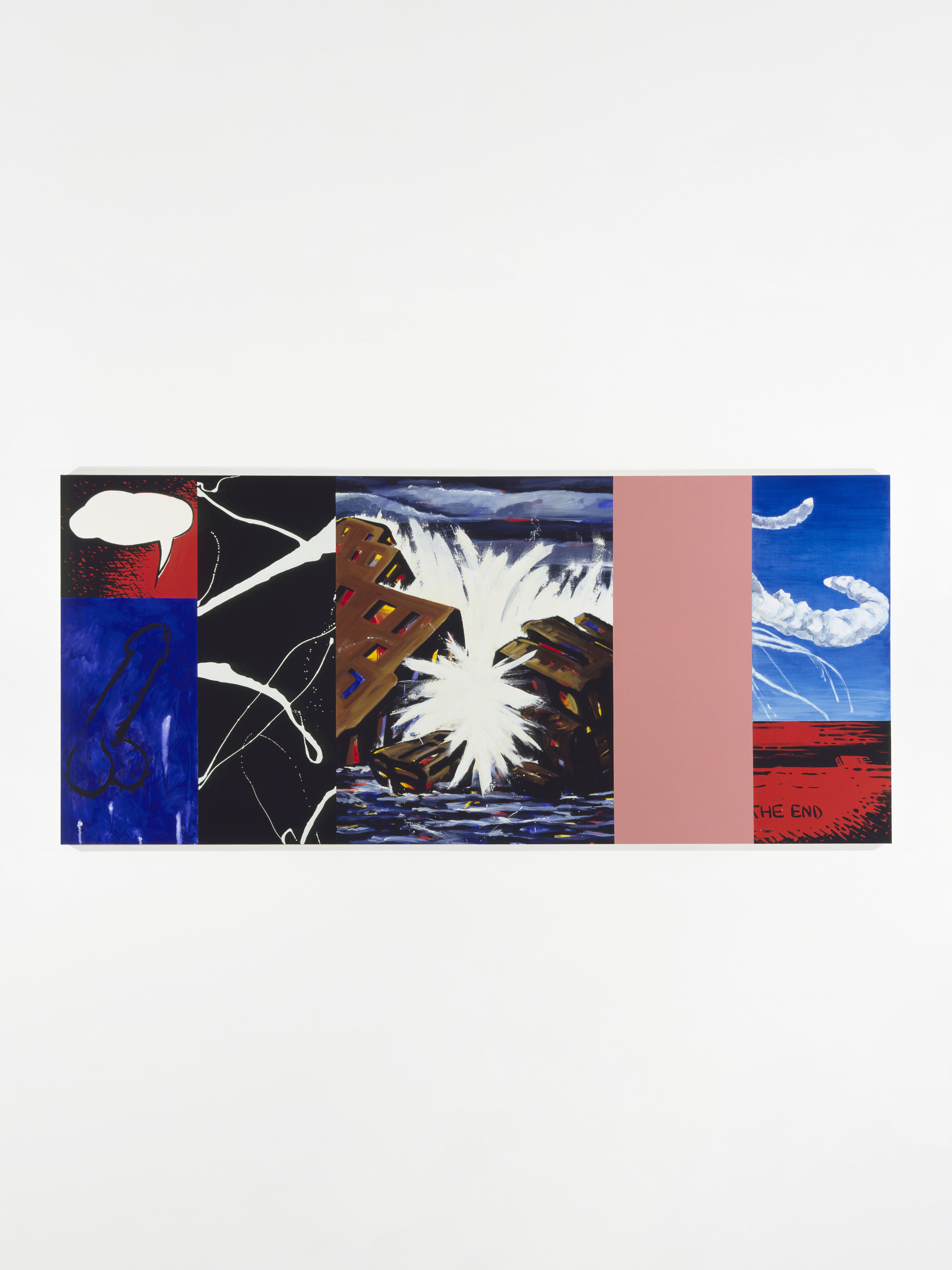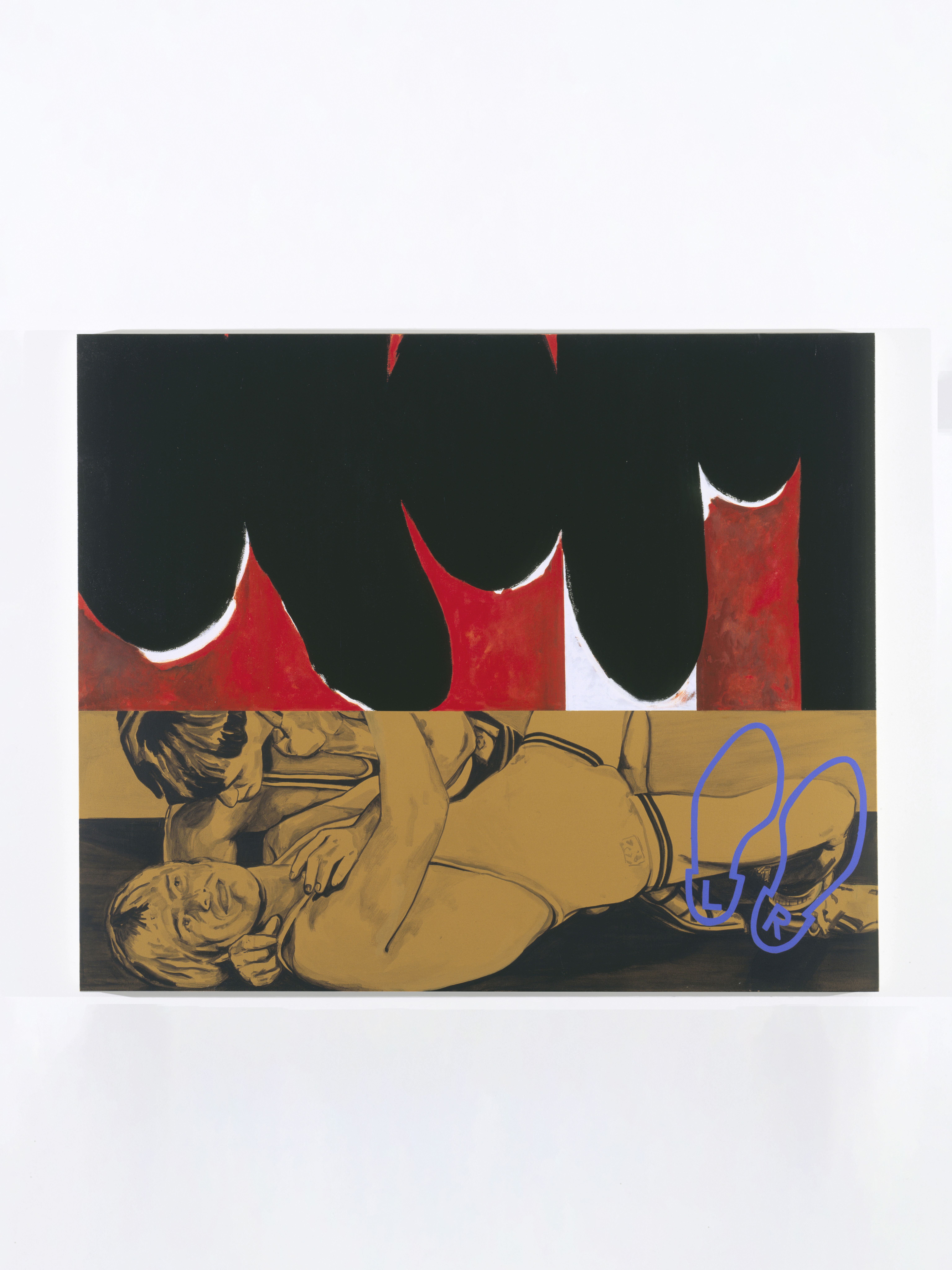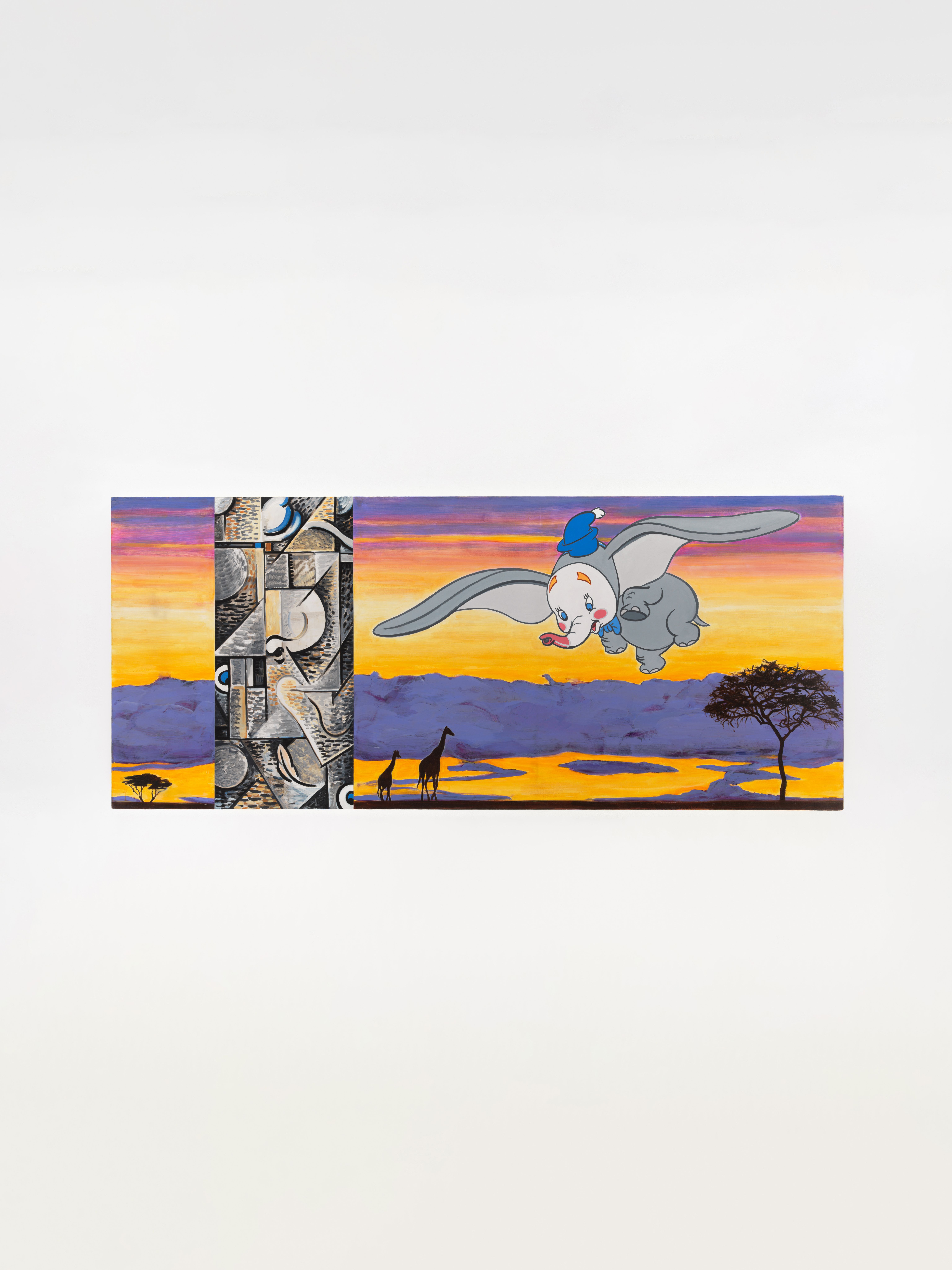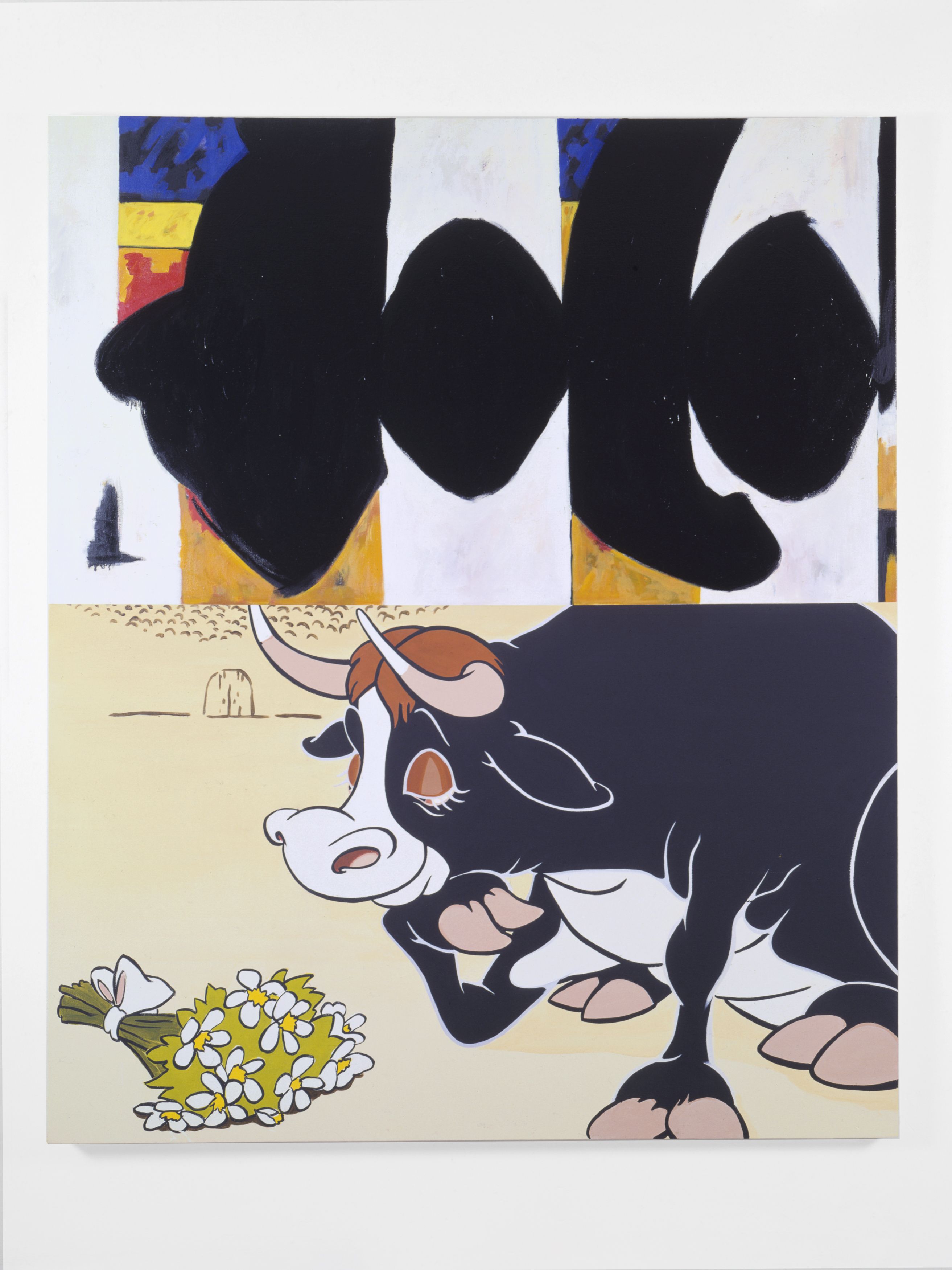 Injecting elements of popular culture—Walt Disney, Charles Schulz, wrestling manuals, and pornography—Kass introduces a new lexicon for interpretation. Kass conjoins Robert Motherwell’s Elegies to the Spanish Republic with Ferdinand—a “sissy” bull who preferred to smell flowers over fighting—and, in another painting, an image pulled from an instructional manual for young male wrestlers. In other paintings, Pollock and Picasso are reread together through male pornography; Warhol’s Before and After abuts Cinderella; Dumbo, the African savannah, and Cubism link together high art and pop culture versions of the continent… These juxtapositions make explicit underlying logics that structure the ways meaning in art, maintenance of power, and construction of value continue within a guarded and reactionary establishment.