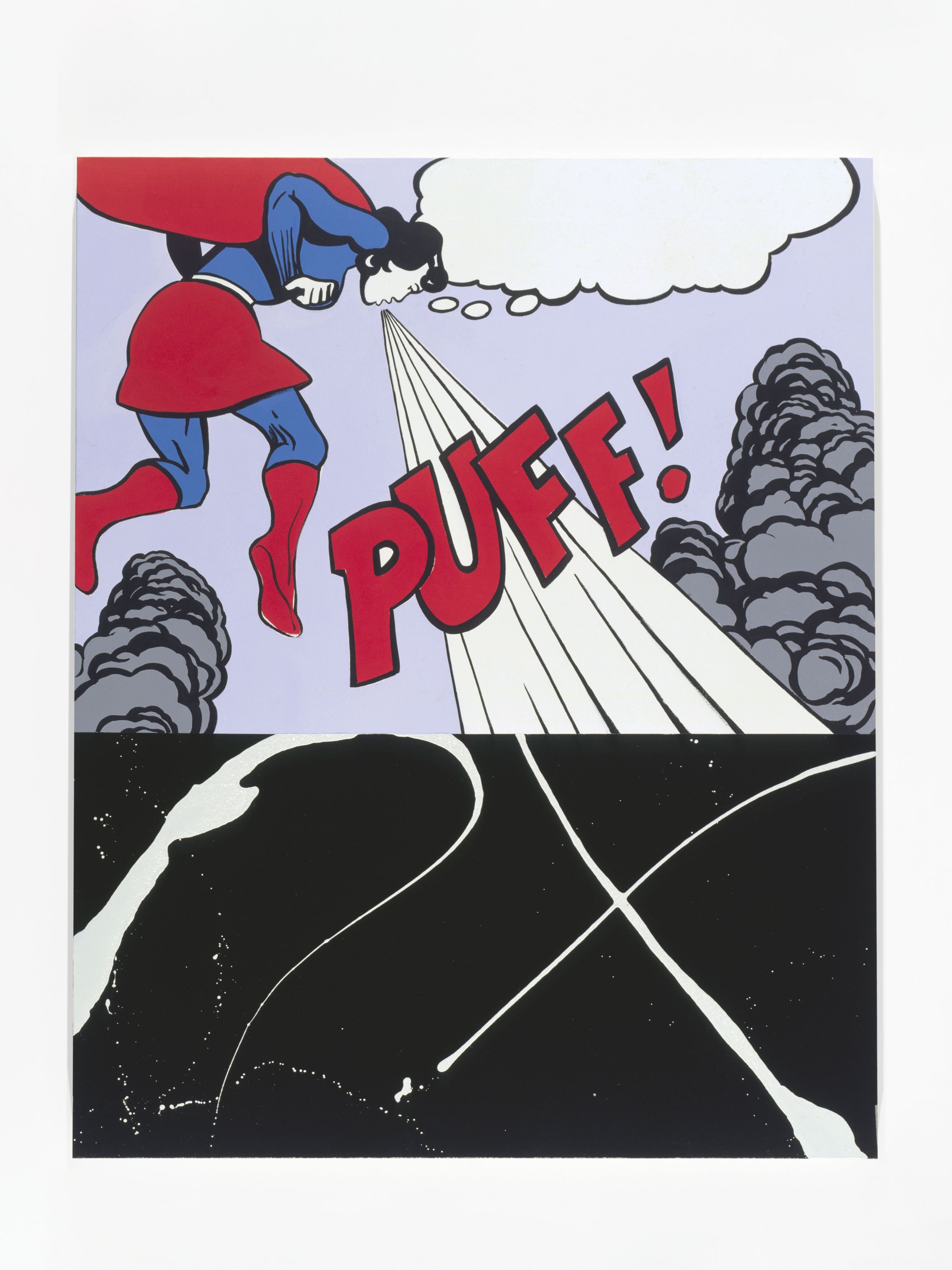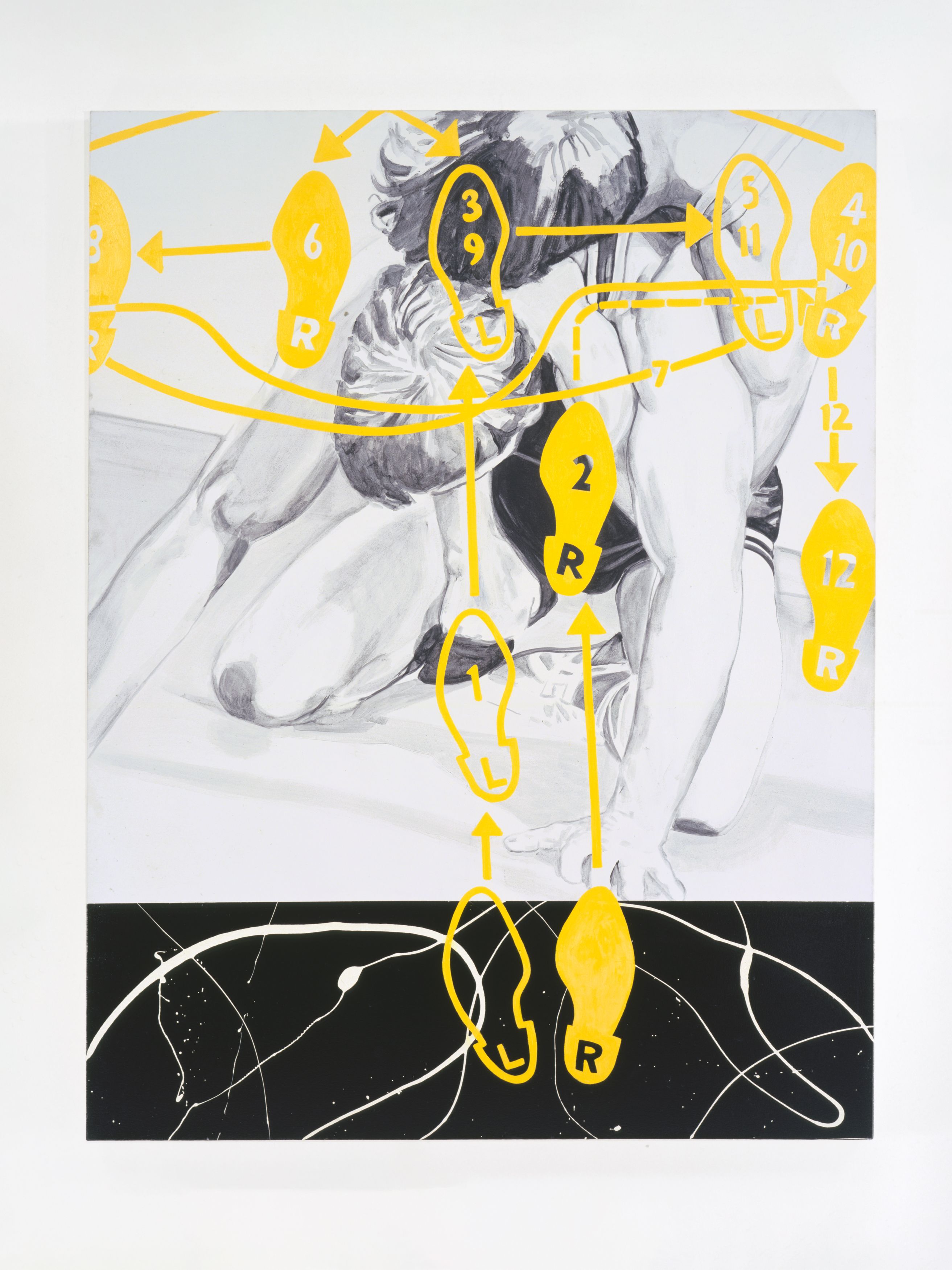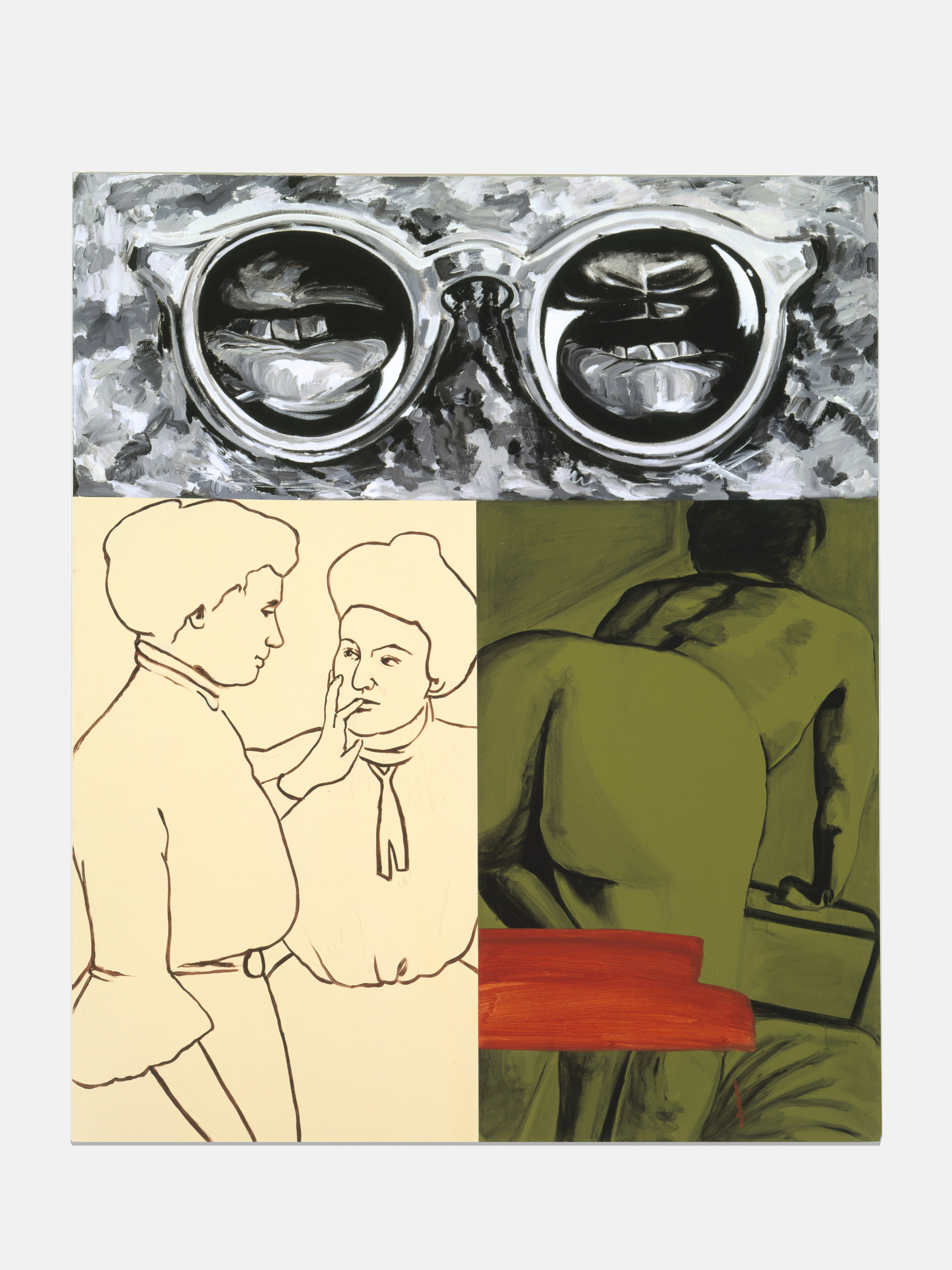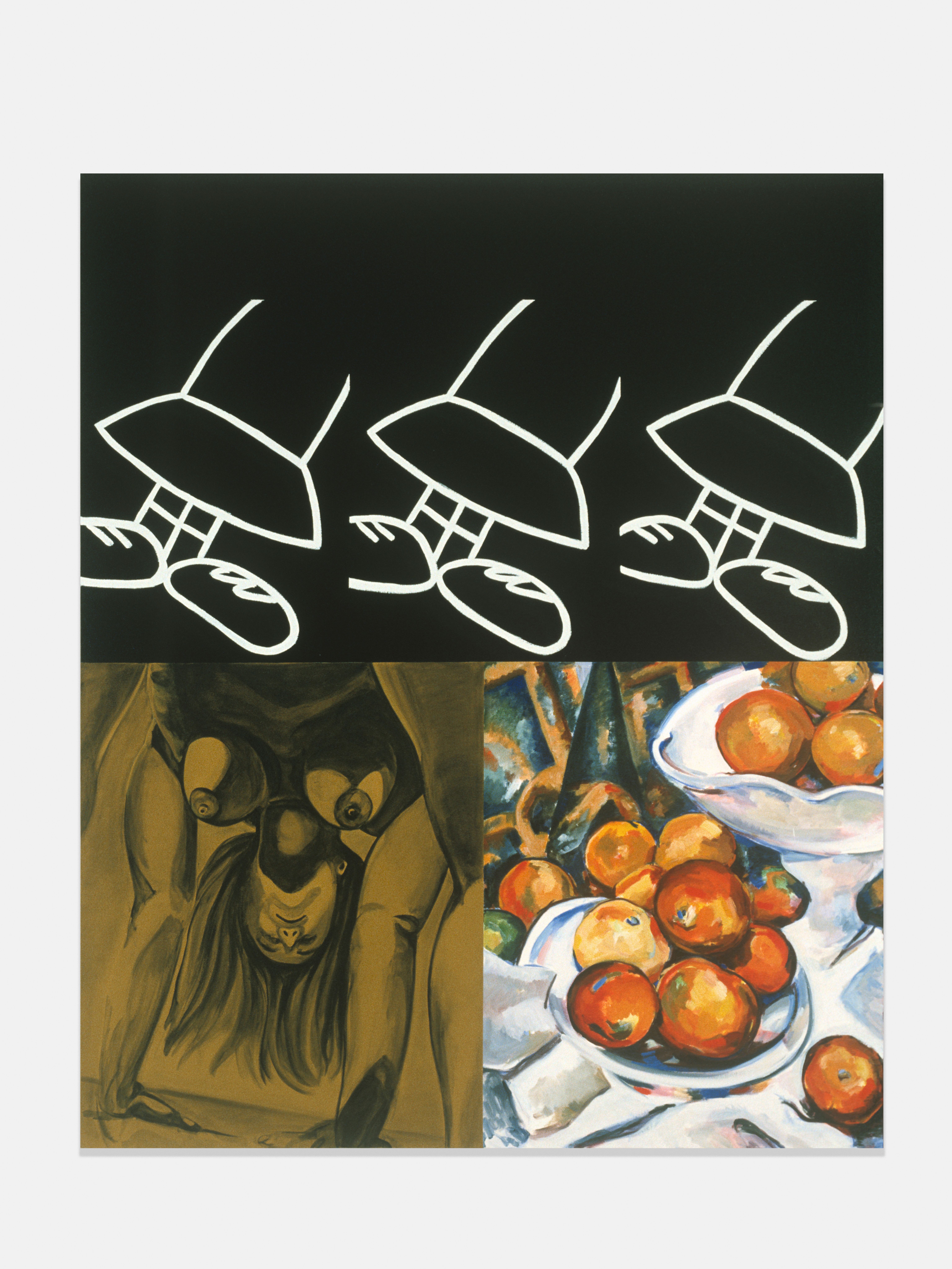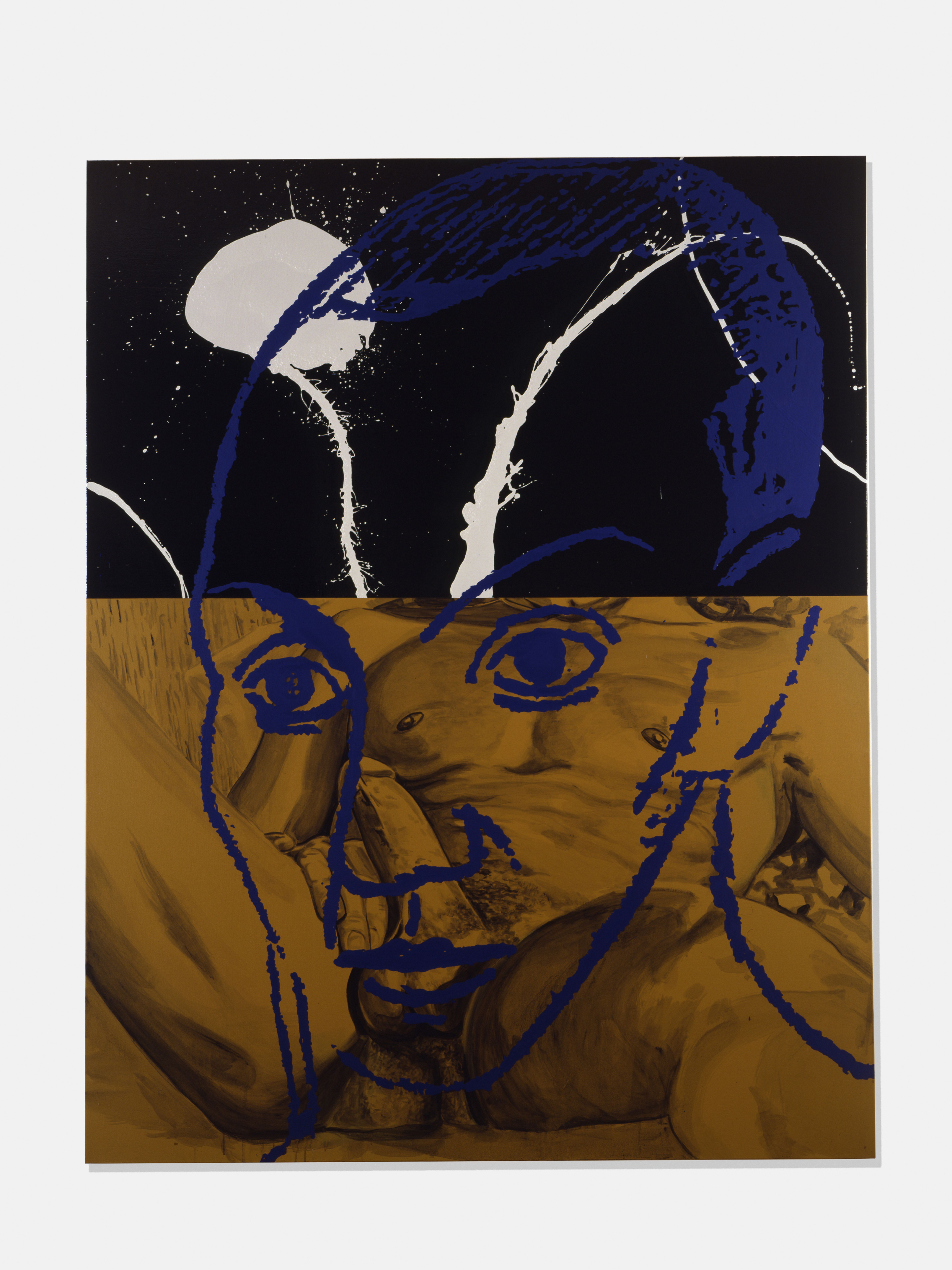 Injecting elements of popular culture—Walt Disney, Charles Schulz, wrestling manuals, and pornography—Kass introduces a new lexicon for interpretation. Kass conjoins Robert Motherwell’s Elegies to the Spanish Republic with Ferdinand—a “sissy” bull who preferred to smell flowers over fighting—and, in another painting, an image pulled from an instructional manual for young male wrestlers. In other paintings, Pollock and Picasso are reread together through male pornography; Warhol’s Before and After abuts Cinderella; Dumbo, the African savannah, and Cubism link together high art and pop culture versions of the continent… These juxtapositions make explicit underlying logics that structure the ways meaning in art, maintenance of power, and construction of value continue within a guarded and reactionary establishment.