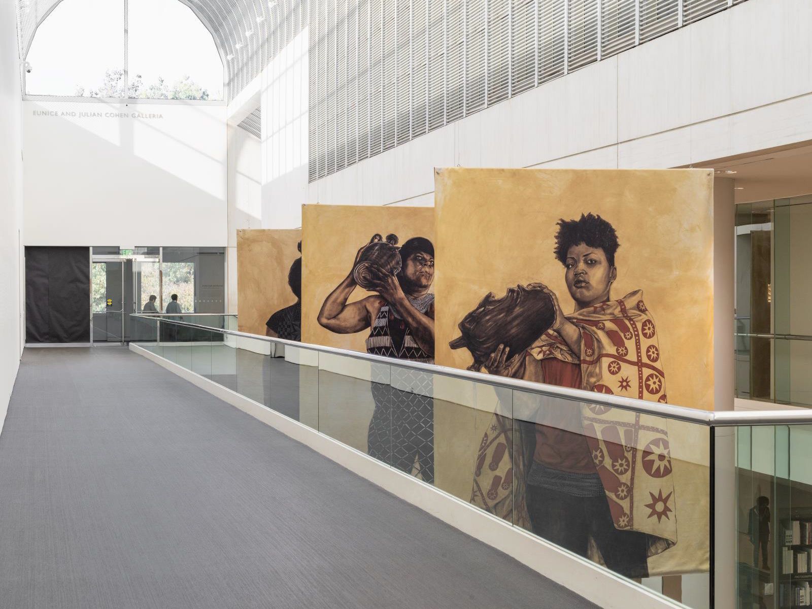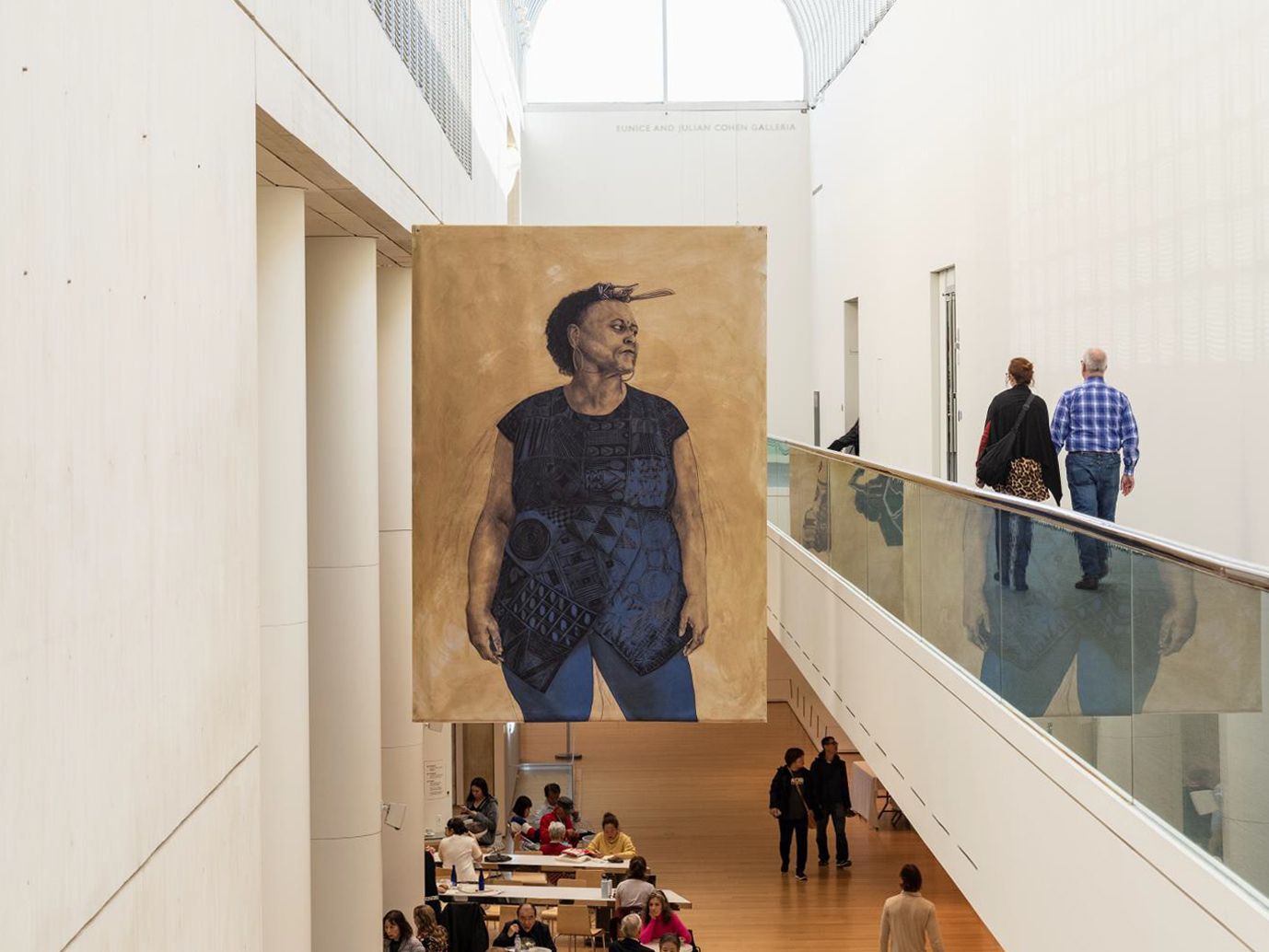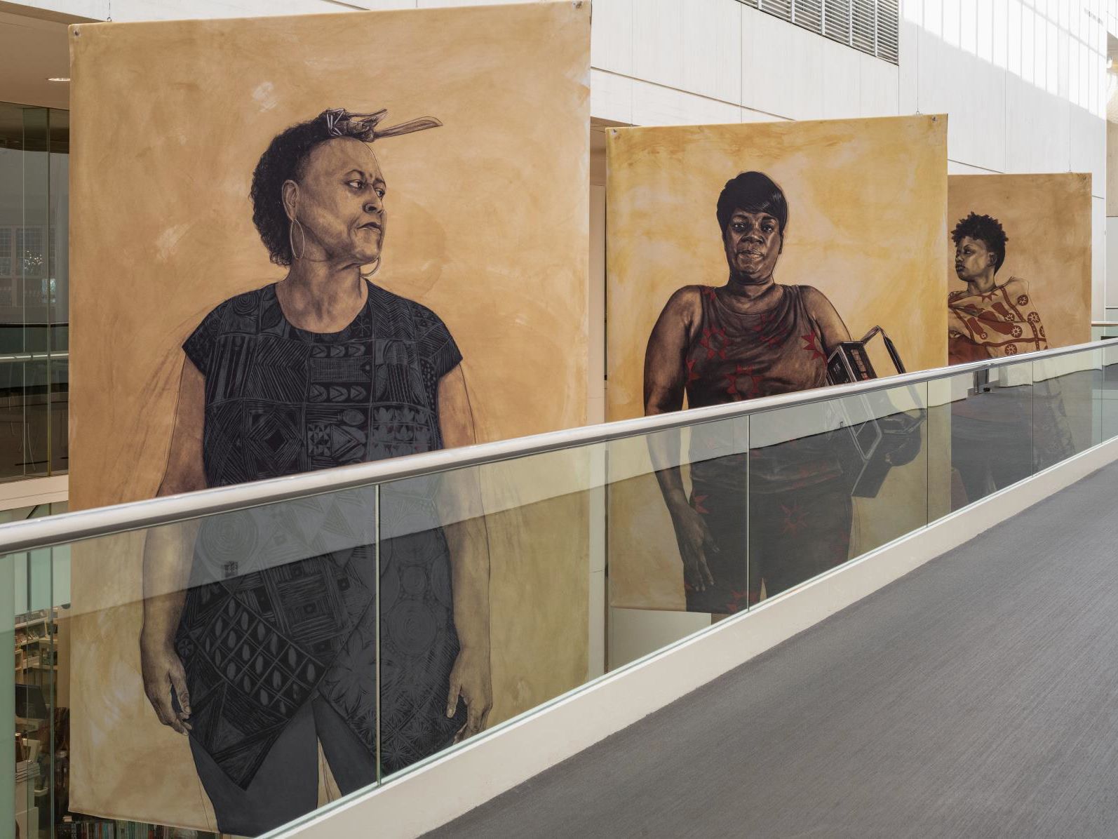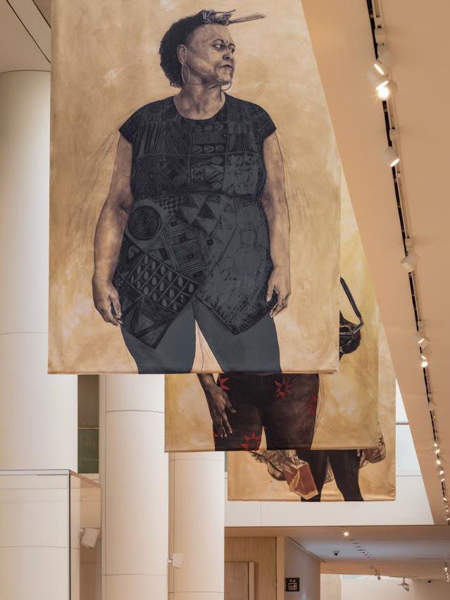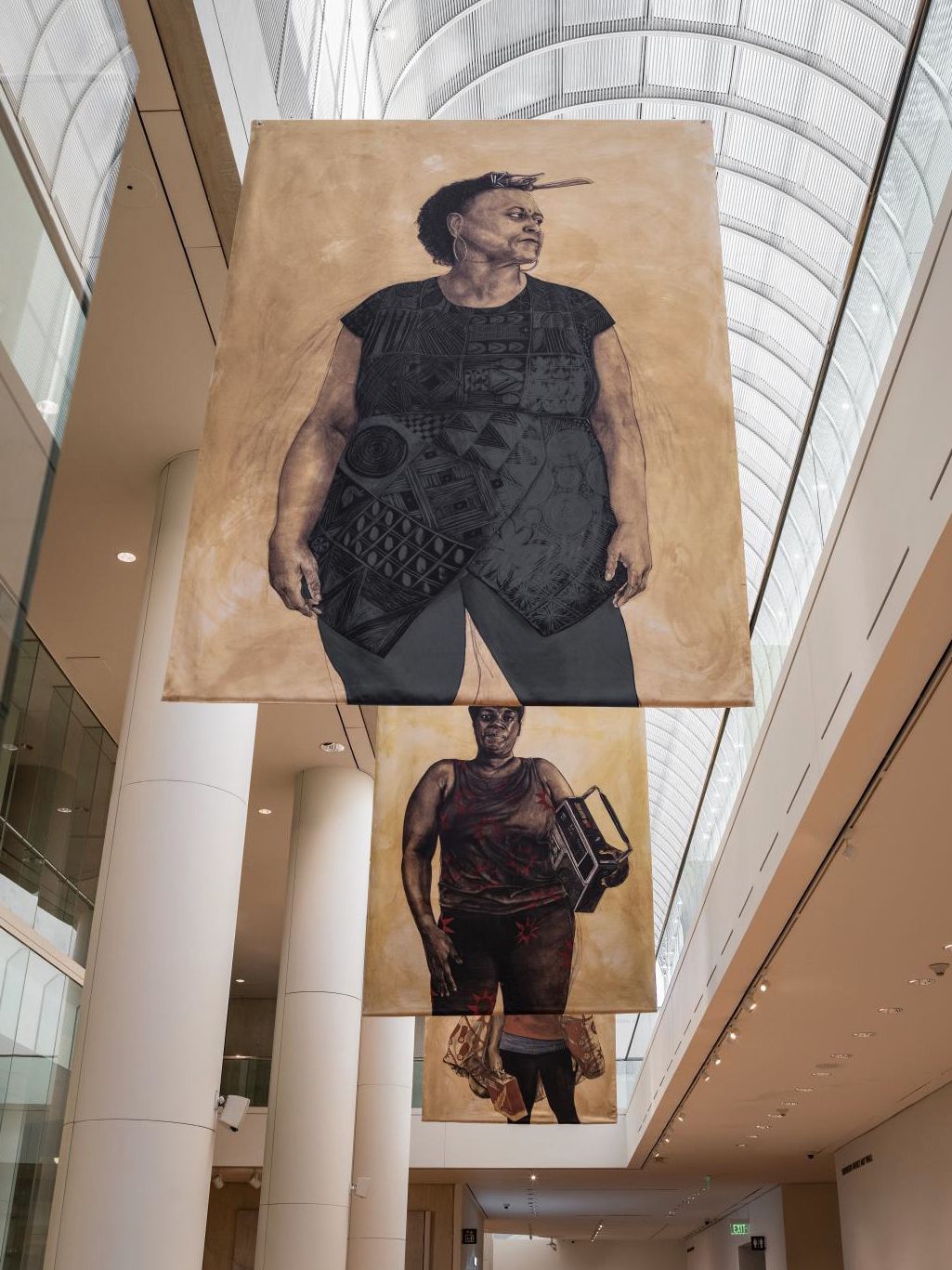 For the inaugural installation of the MFA’s “Banner Project,” the Museum invited artist Robert Pruitt to create three large-scale banners to hang from the ceiling of the Linde Family Wing for Contemporary Art. Pruitt is best known for his oversized figurative drawings that explore the diversity of the African Diaspora by juxtaposing contrasting cultural symbols. He has said that most of his works “have some reference to the Past, Present, and Future… This idea is to collapse time.”