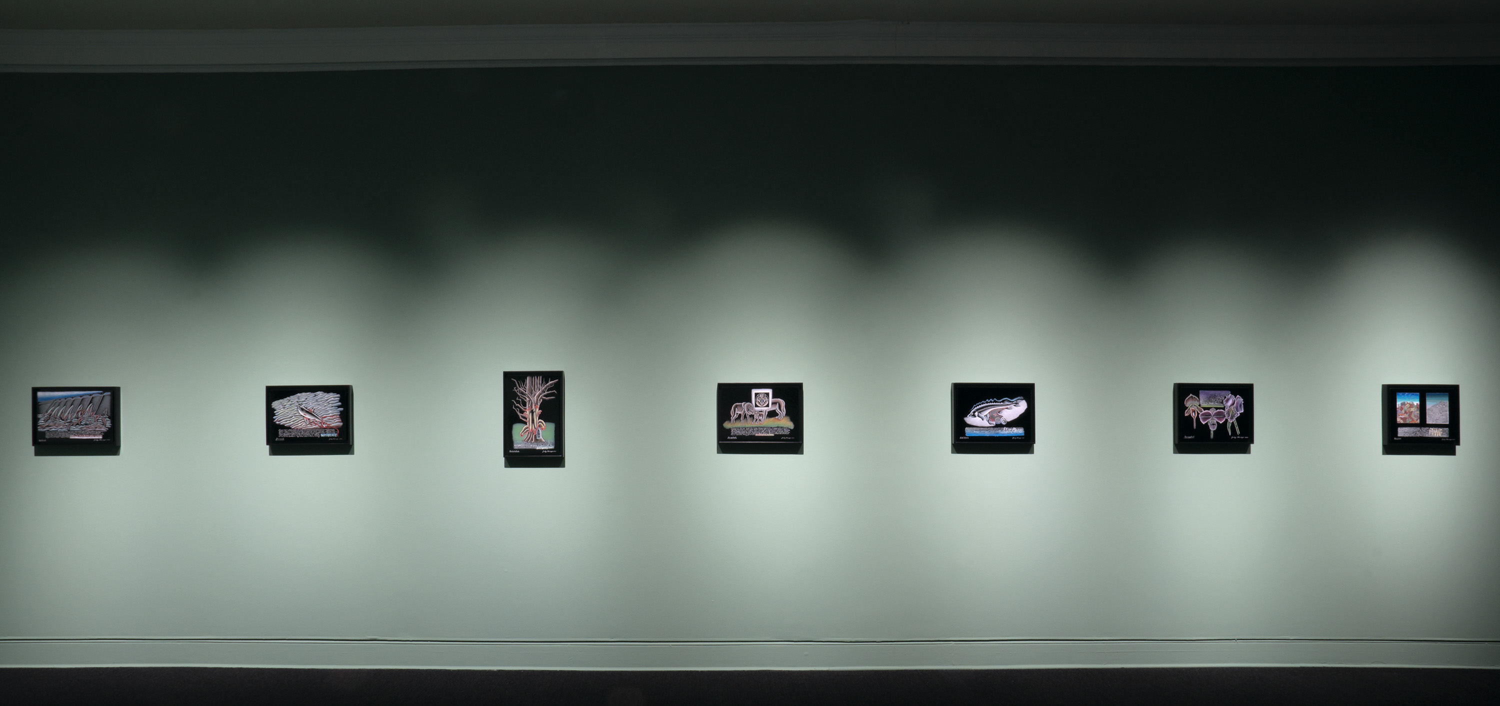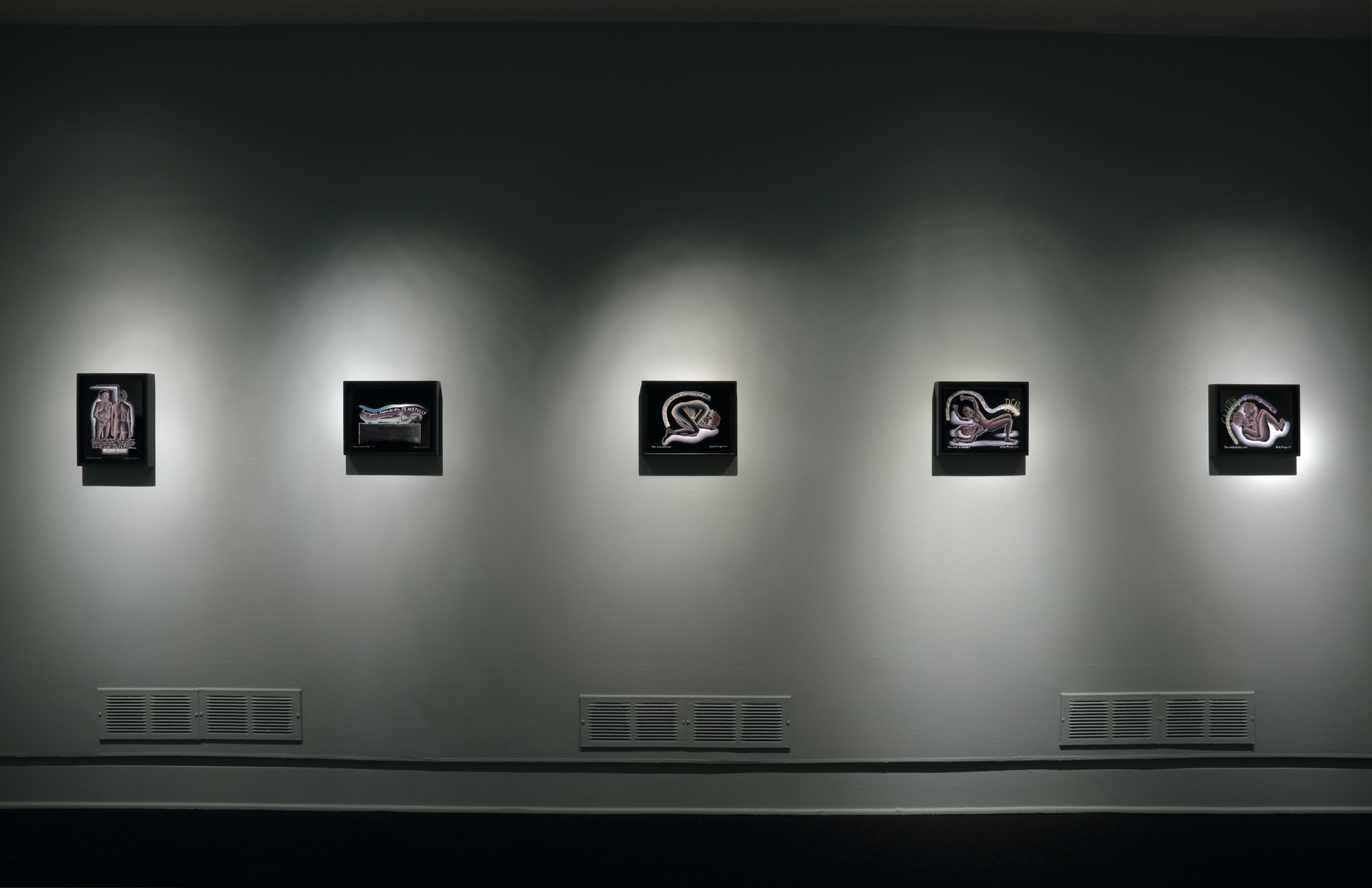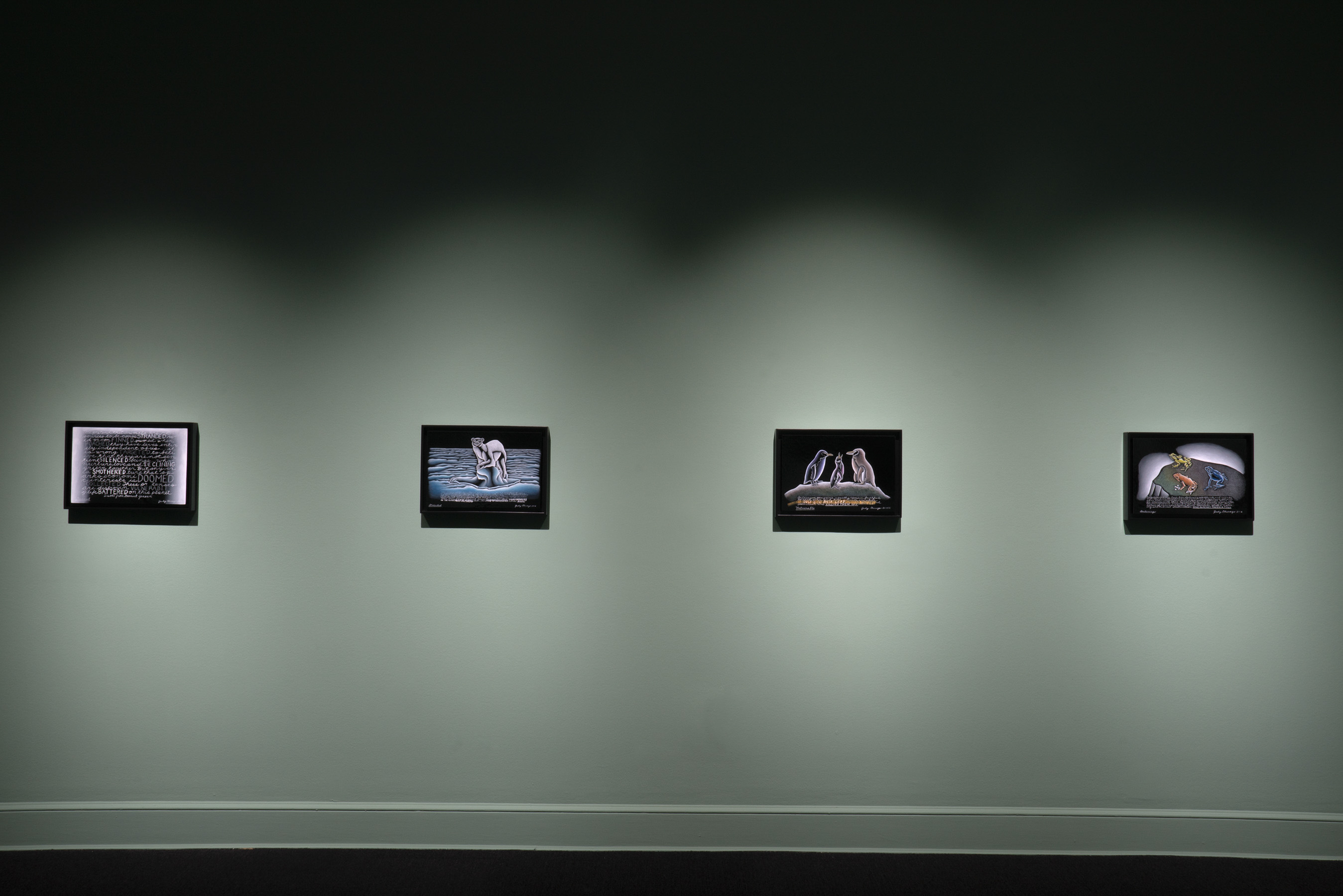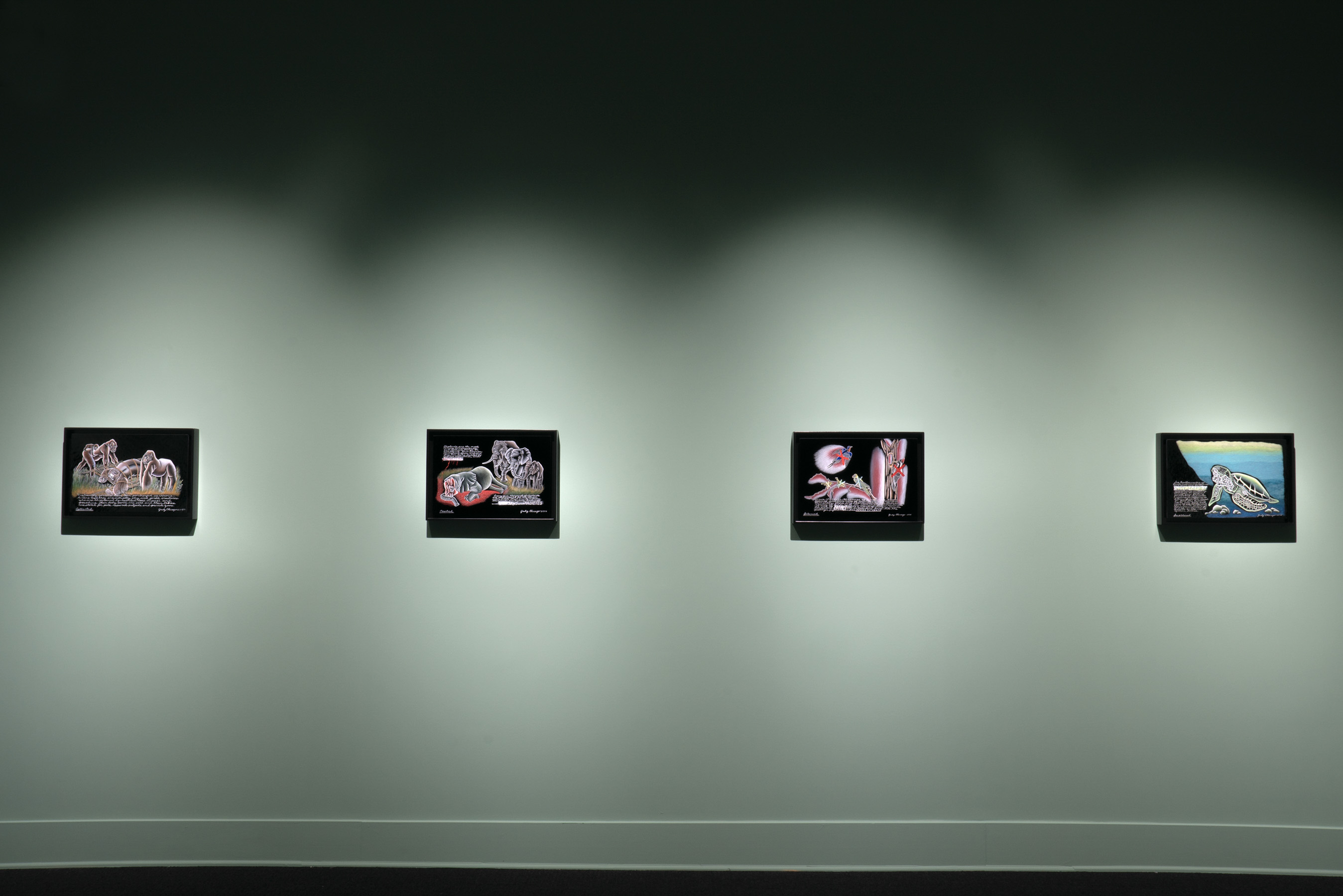 The second and third parts of the series, "Mortality" and "Extinction," are made from kiln-fired glass paint on black glass. Chicago expresses anxiety about how she might die in the "Mortality" contemplation, yet they are also intensely personal for a woman entering her ninth decade. A more collective sense of anxiety and sadness is expressed in the "Extinction" panels, which depict, in often graphic detail, groups of animals and plants that have been irrevocably harmed by humans, from elephants killed for their tusks to trees flayed for their bark. Chicago's handwritten script—a part of her practice since the early 1970s—appears in each part of the series.