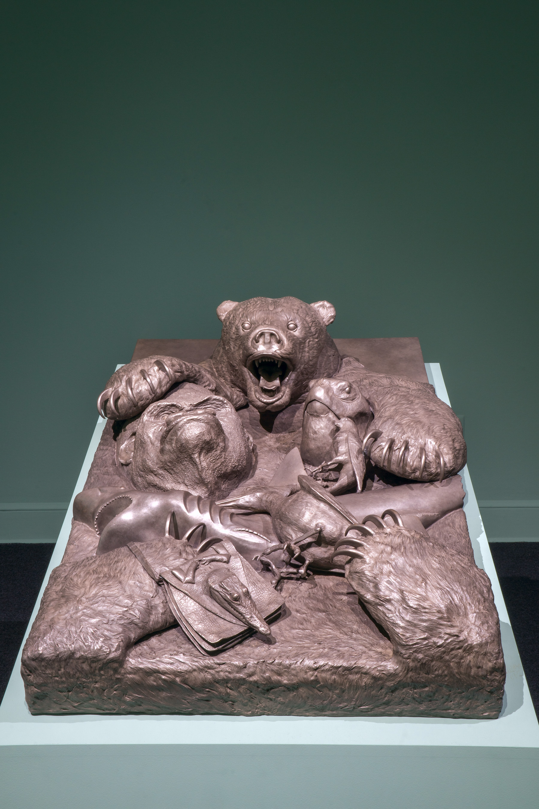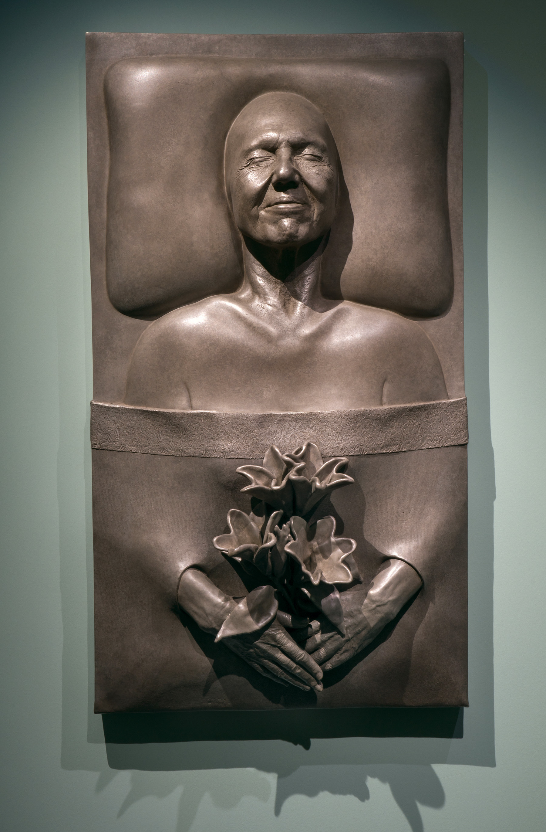 While porcelain and glass panels form the majority of this series. The End also includes two large-scale bronze reliefs. The first is a half-length image of Chicago—her head against a pillow, eyes closed and hands emerging from a shroud with a bouquet of lilies. This self-portrait is modeled directly from the artist's face and recalls the long tradition of death masks. The second, larger bronze is an assemblage of creatures threatened with extinction. The work evokes the visual language of mounted hunting trophies, calling into question the ethics of killing purely for sport. Chicago has previously worked in bronze, however, the works in The End are among her largest to date in the medium.