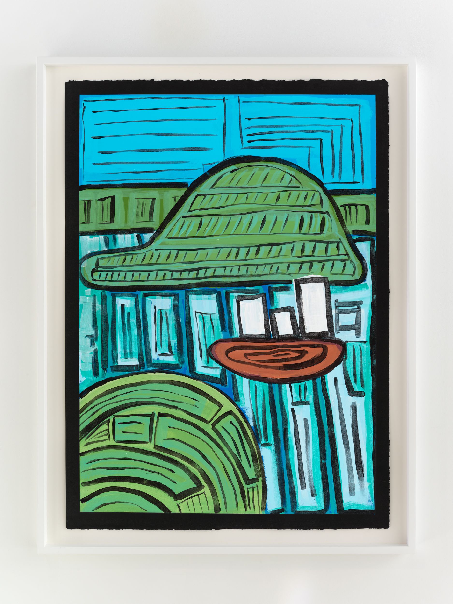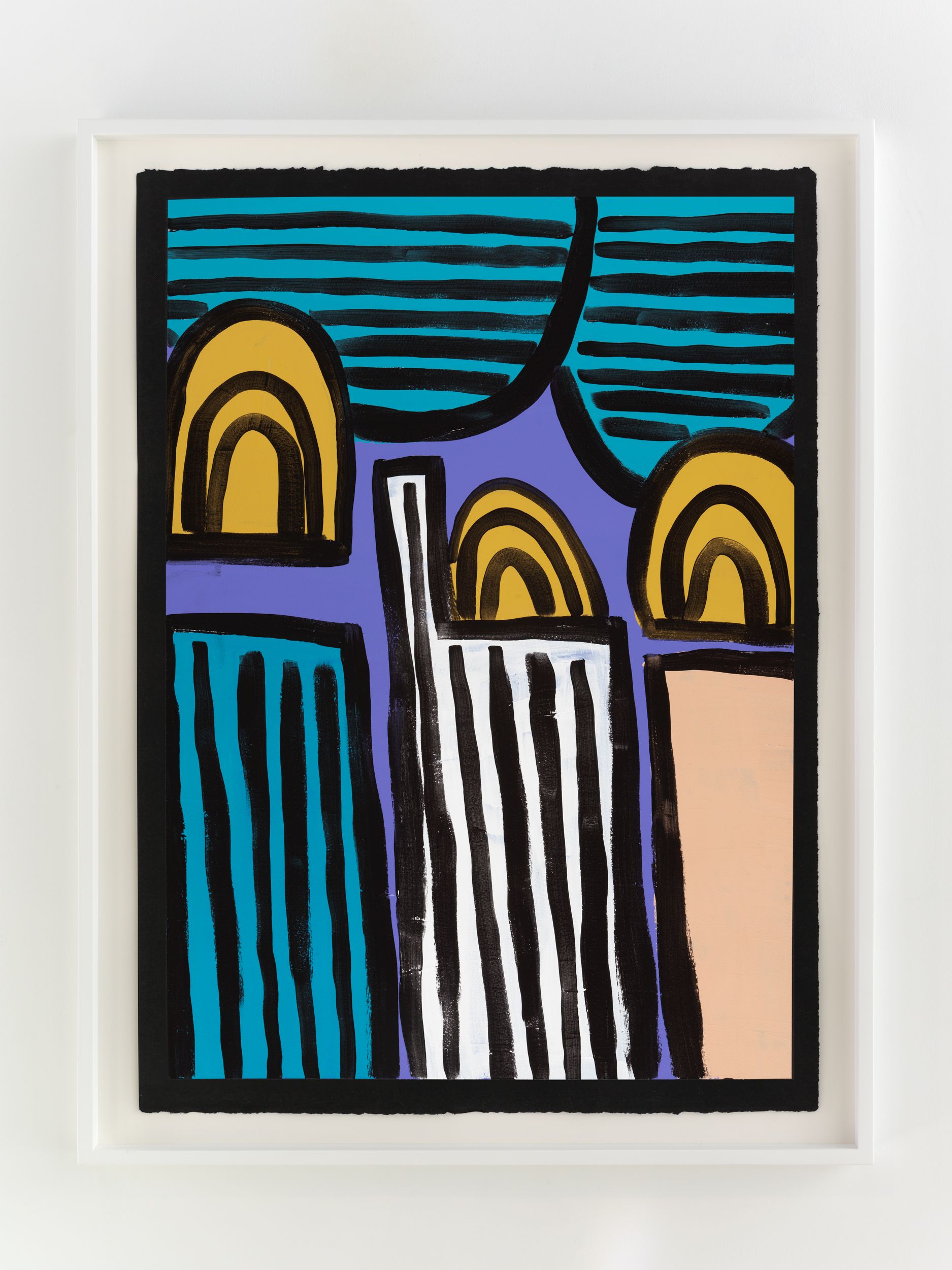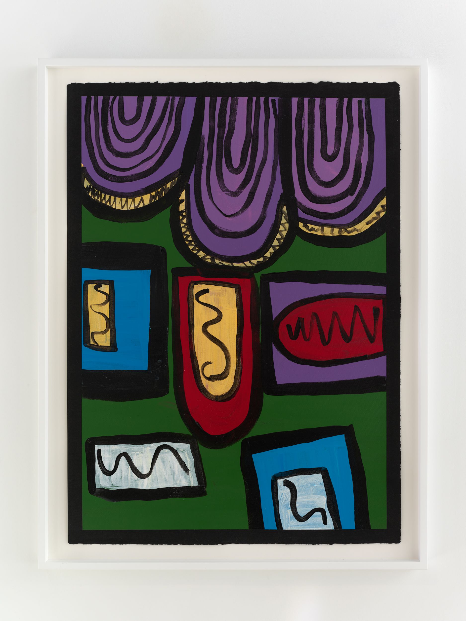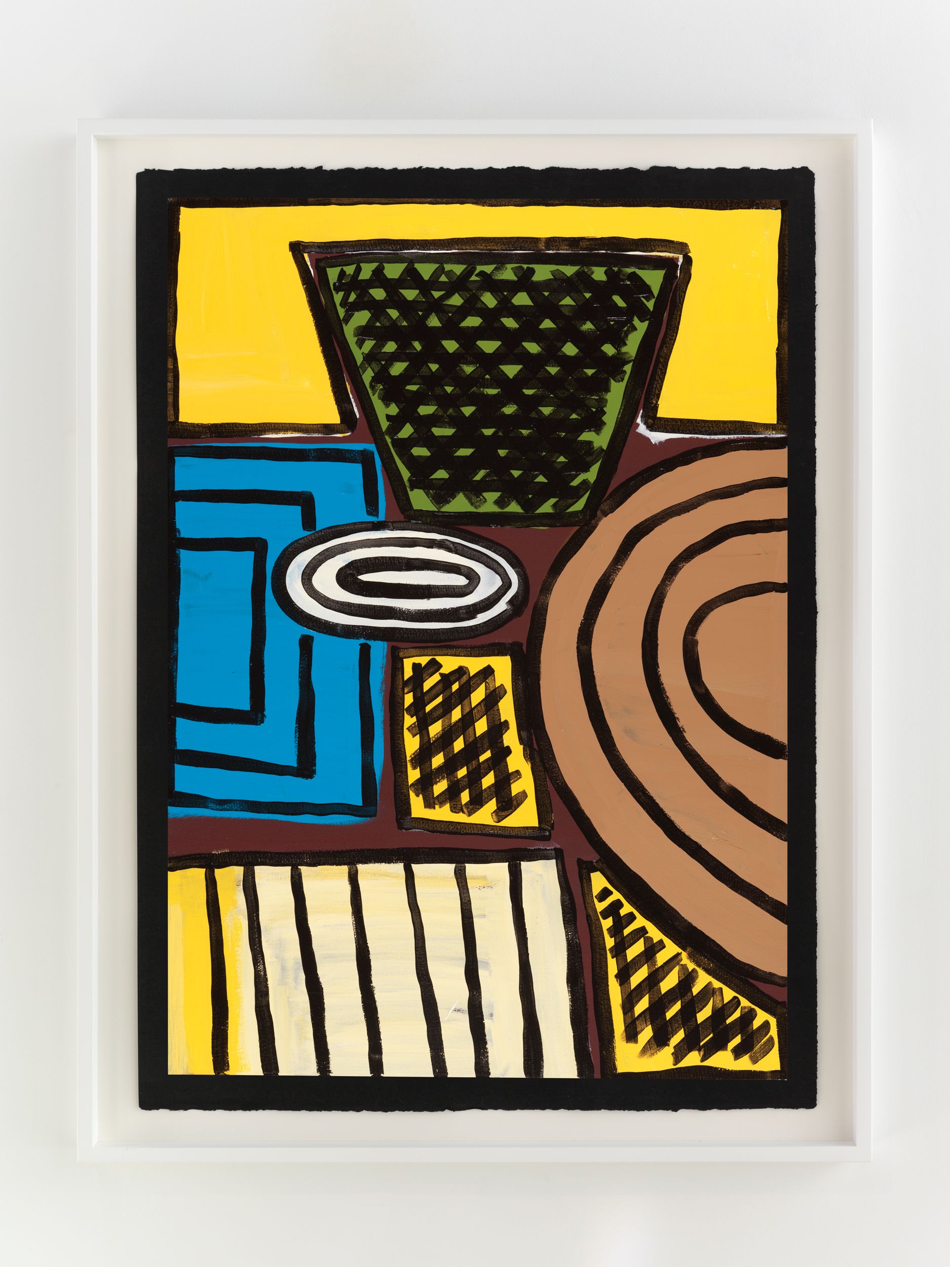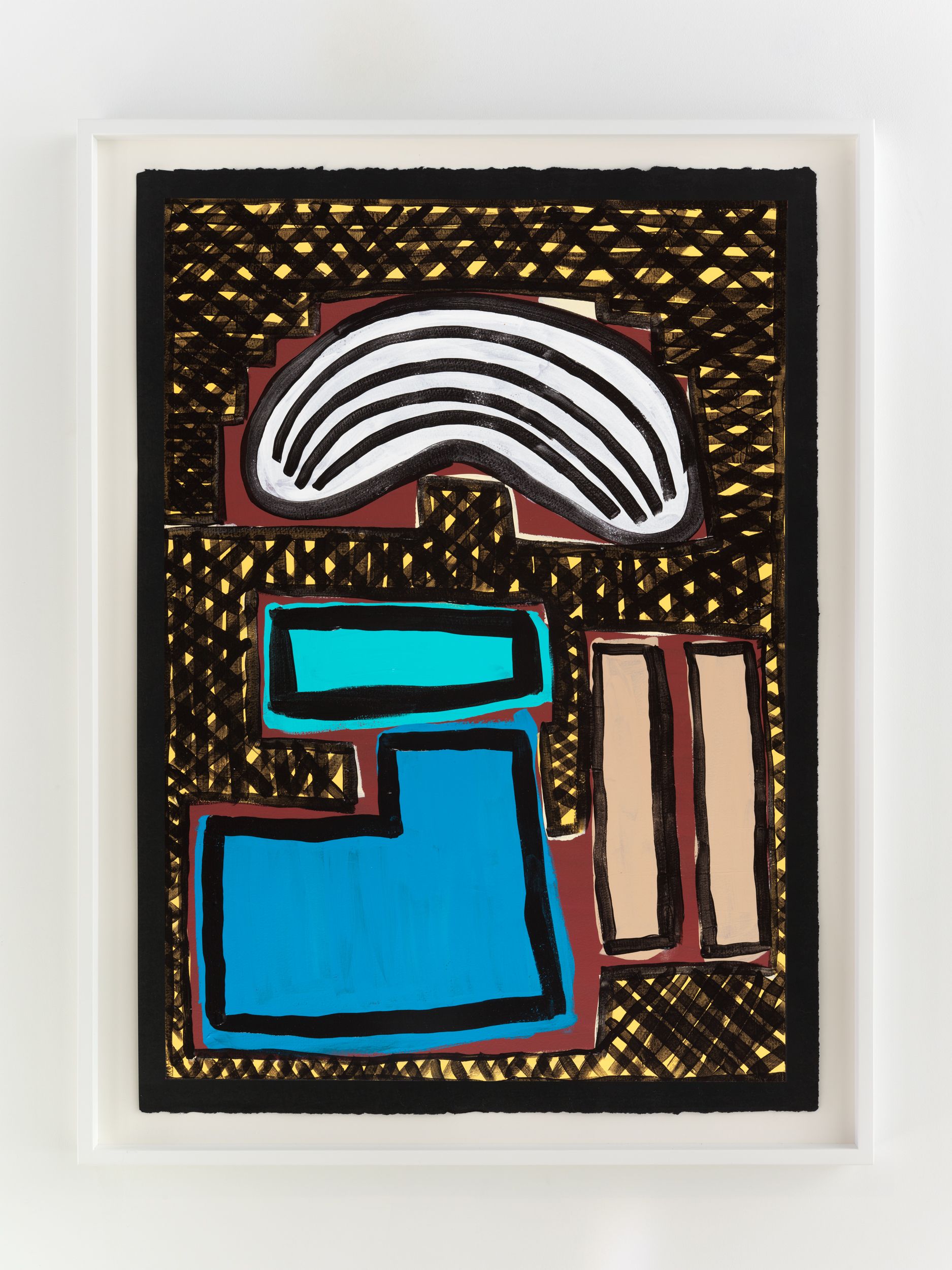 Alongside these sculptural objects are twenty joyous abstract paintings translating memories of childhood through a form of non-verbal storytelling expressed as vivid colors and thick black lines, shapes, and forms. Titles are also drawn from everyday expressions like “Carry on, son”, “Don’t give up just yet”, and “Baptize you in the name” (all works 2021). Corbett builds up layers of colors to create a visual analogue to musical notations used by various musicians. She adds, “black lines in the works serve as a graphic and expressive rendition of corporeal Blackness whilst, the use of black paper reflects what it means to be Black in different countries or the African diaspora.”
