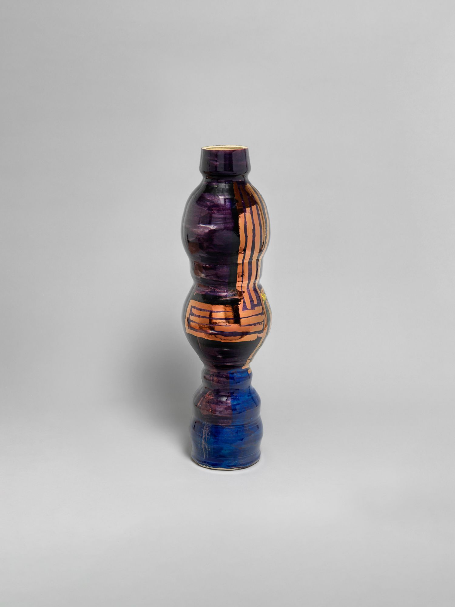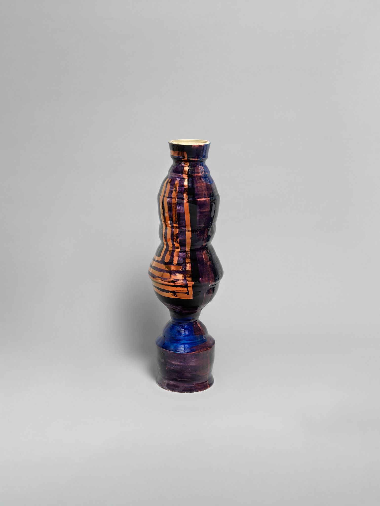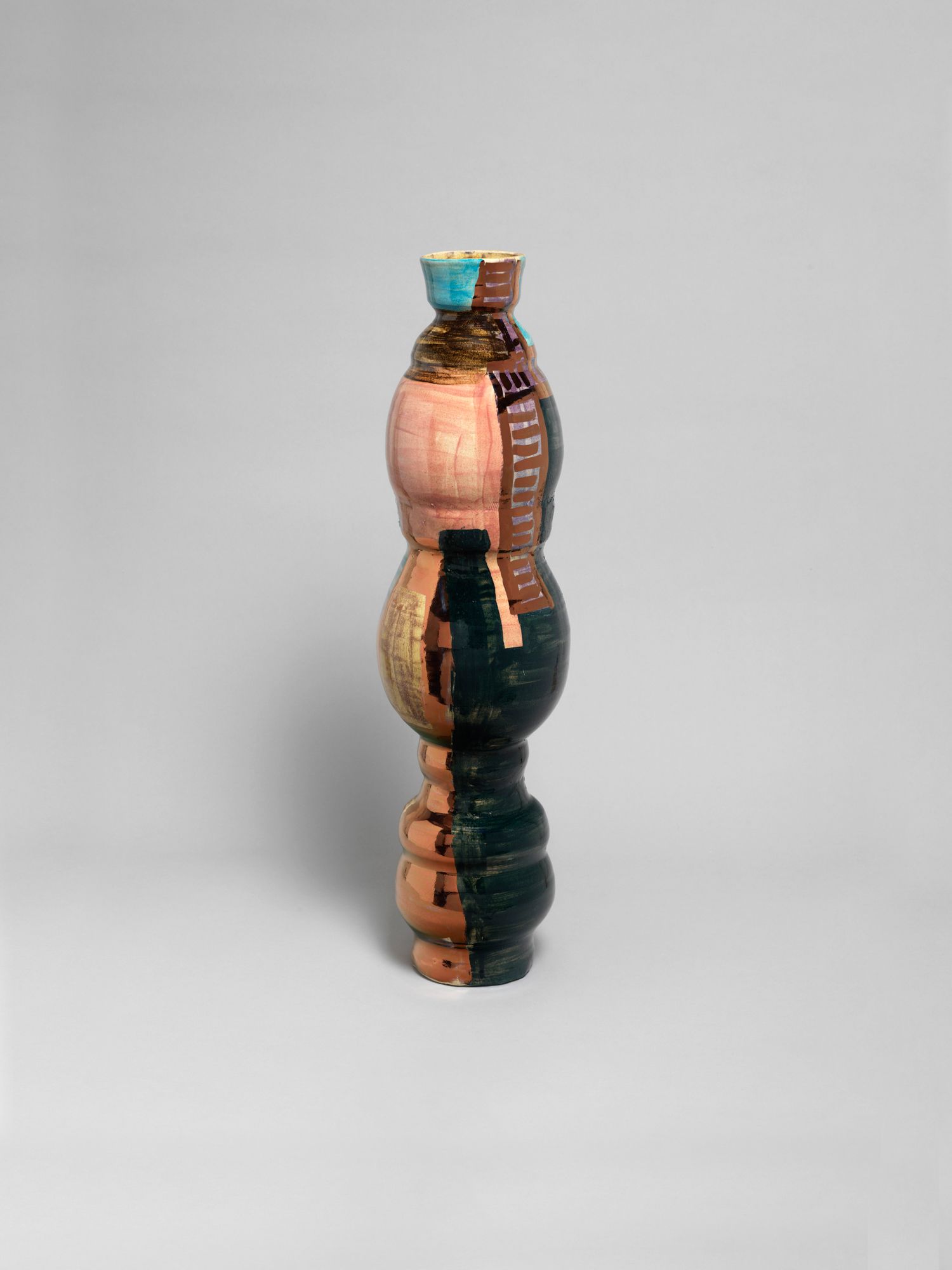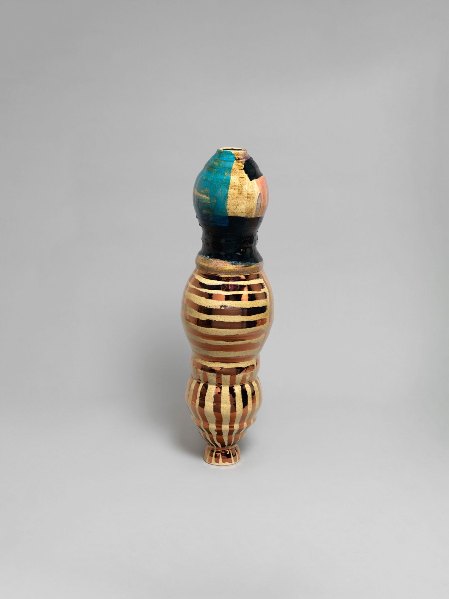 Corbett’s wider practice is deeply rooted in the personal and theoretical. She draws from childhood memories growing up in the American southern state of Mississippi, and later, the urban sprawl of New York, to personalize vessel-like objects she has previously described as being “just like bodies and stand-ins for people”. Embodied objects are differentiated by their formal qualities, i.e., height, shape, and colors, and further personified by a myriad of glazes, lacquers, and metallic lusters, painted on by brushstrokes scored to music and improvised dance and leaving traces of movement that mark her vessels’ surfaces.