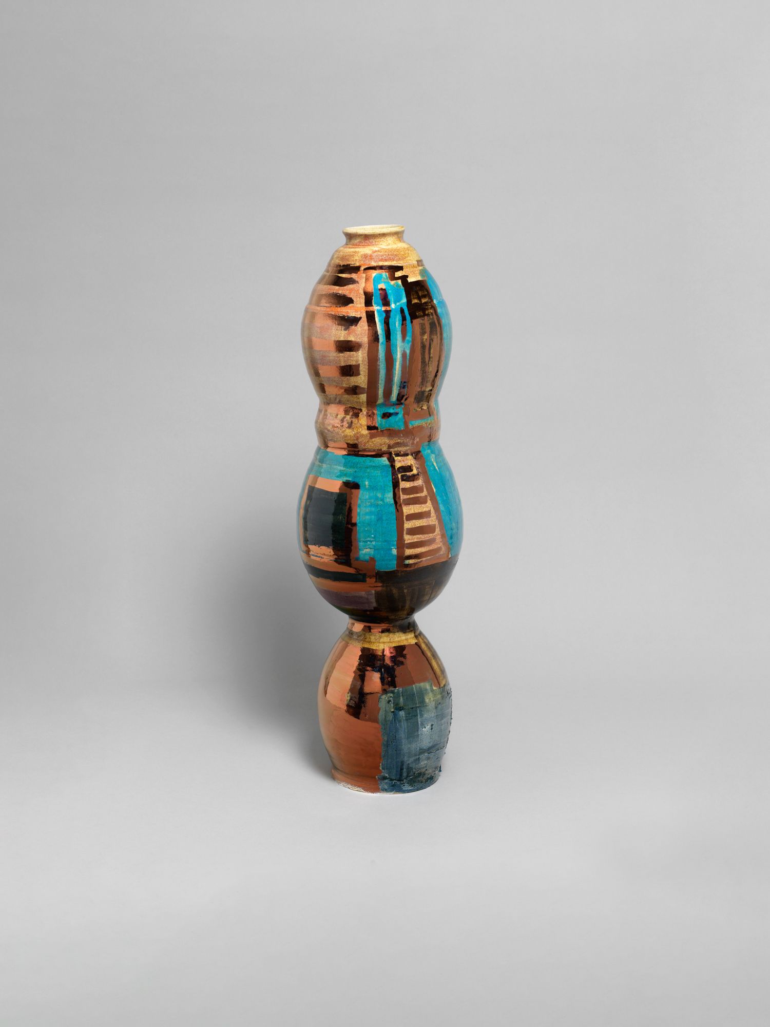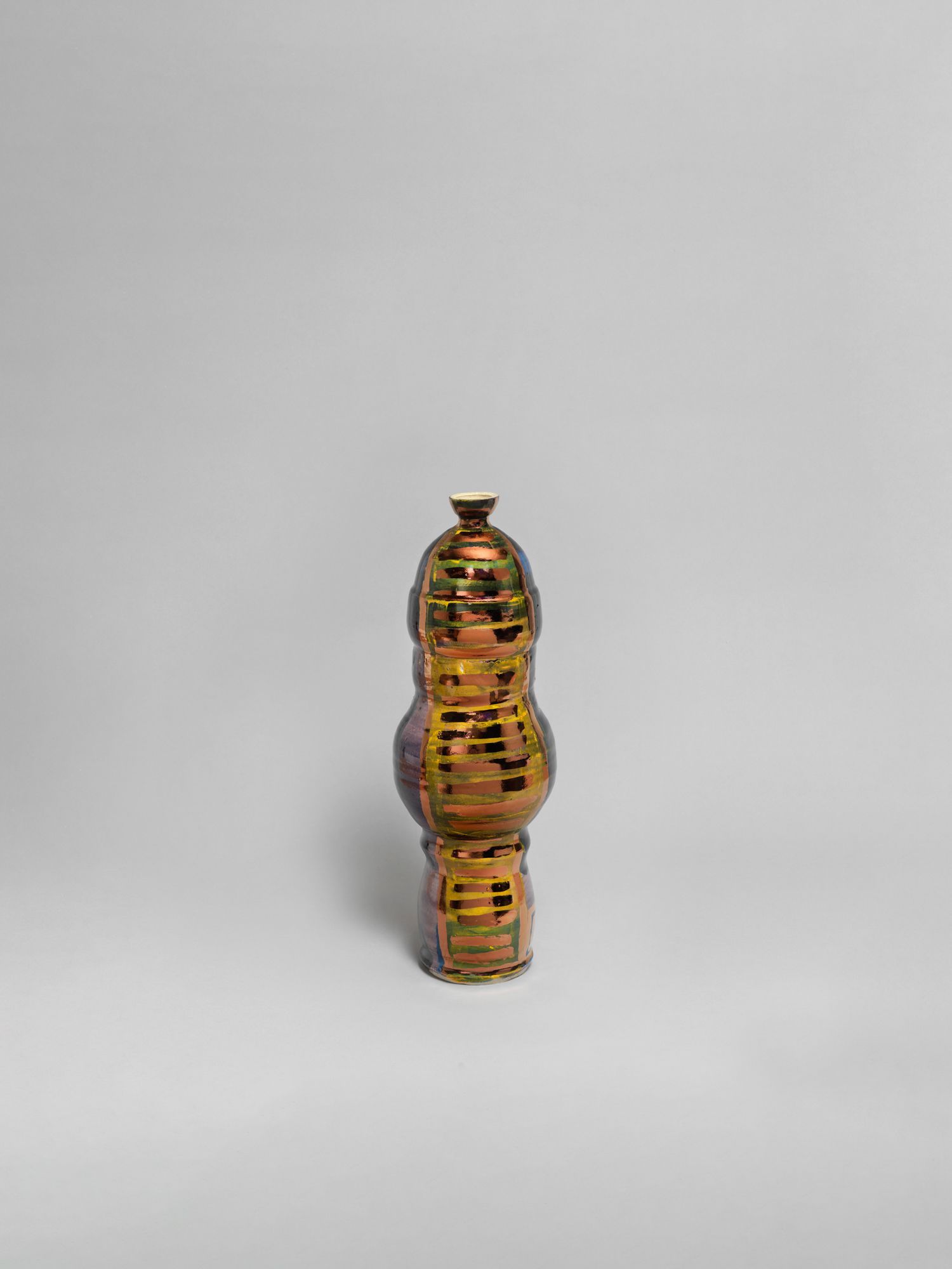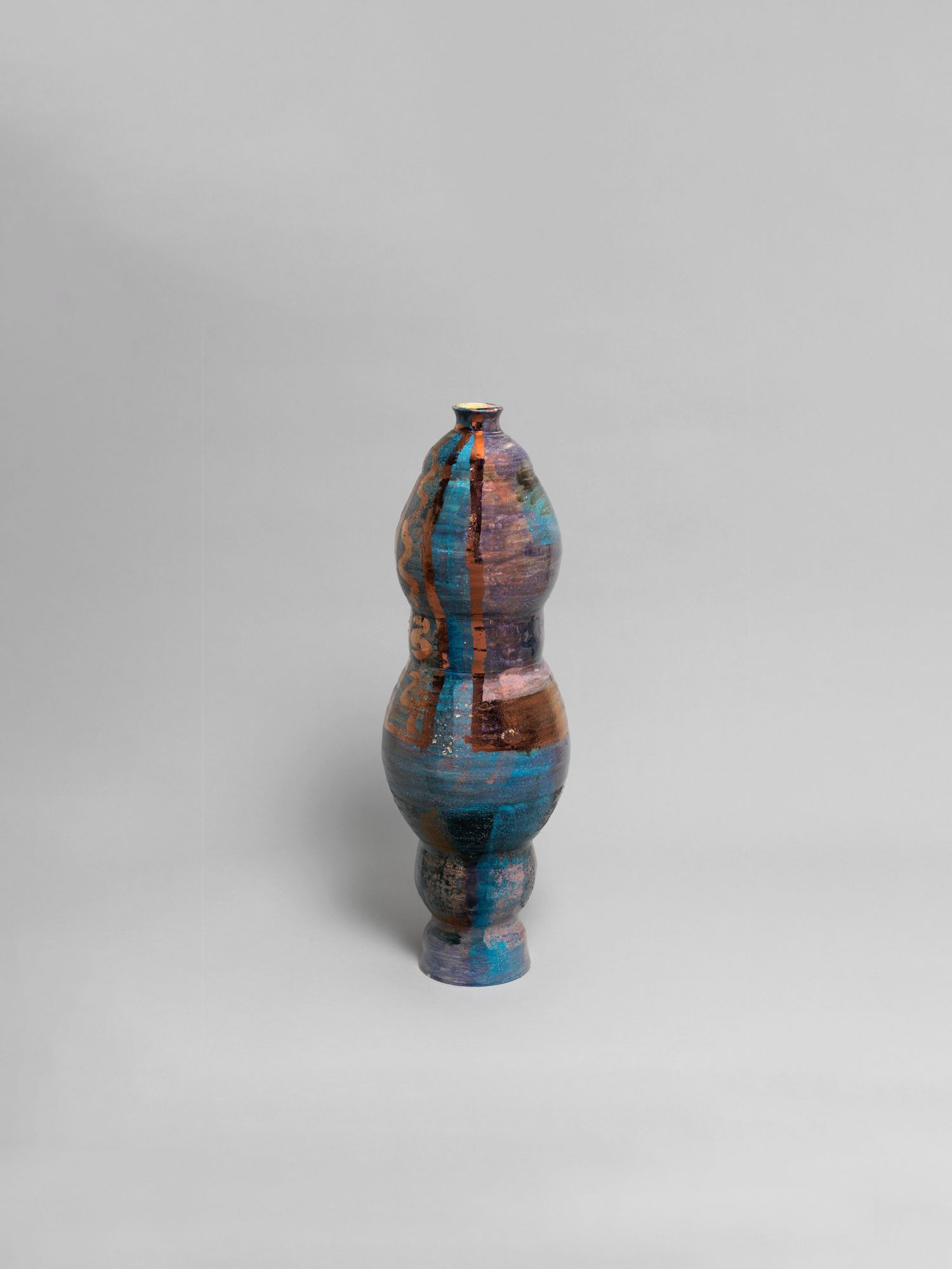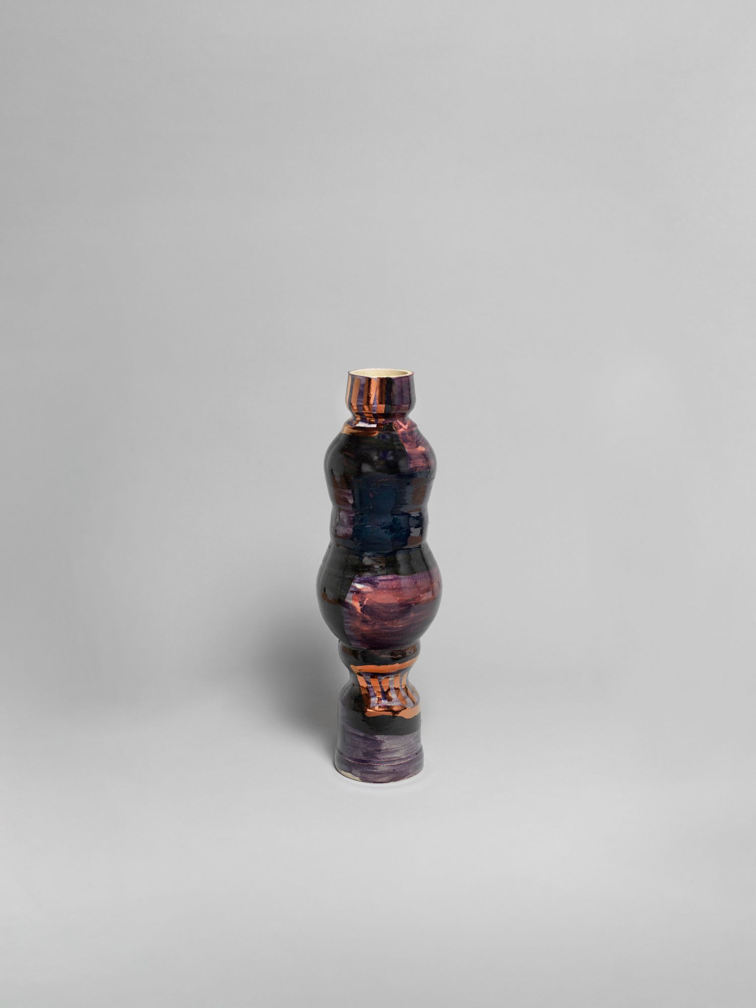 Corbett’s wider practice is deeply rooted in the personal and theoretical. She draws from childhood memories growing up in the American southern state of Mississippi, and later, the urban sprawl of New York, to personalize vessel-like objects she has previously described as being “just like bodies and stand-ins for people”. Embodied objects are differentiated by their formal qualities, i.e., height, shape, and colors, and further personified by a myriad of glazes, lacquers, and metallic lusters, painted on by brushstrokes scored to music and improvised dance and leaving traces of movement that mark her vessels’ surfaces.