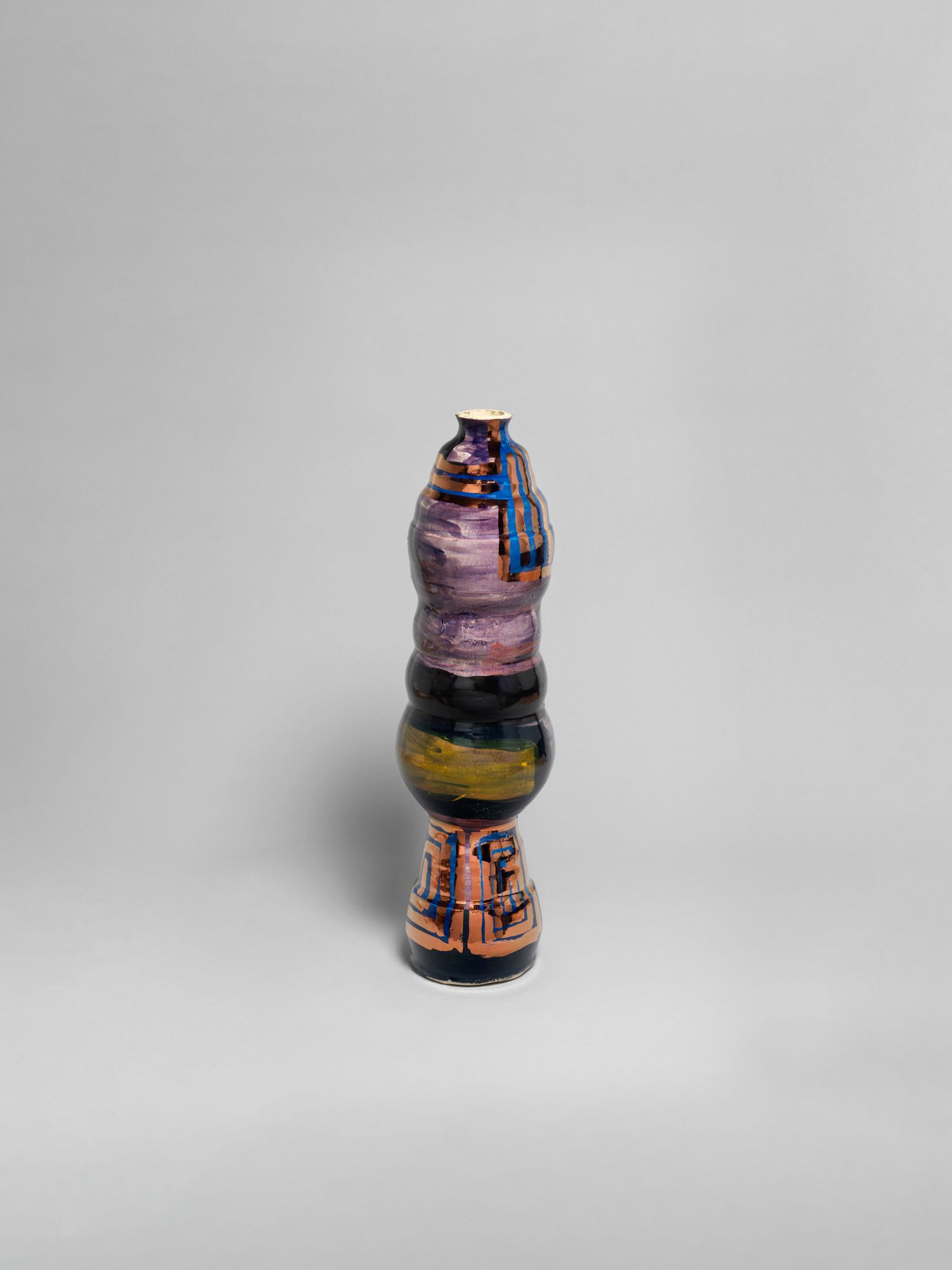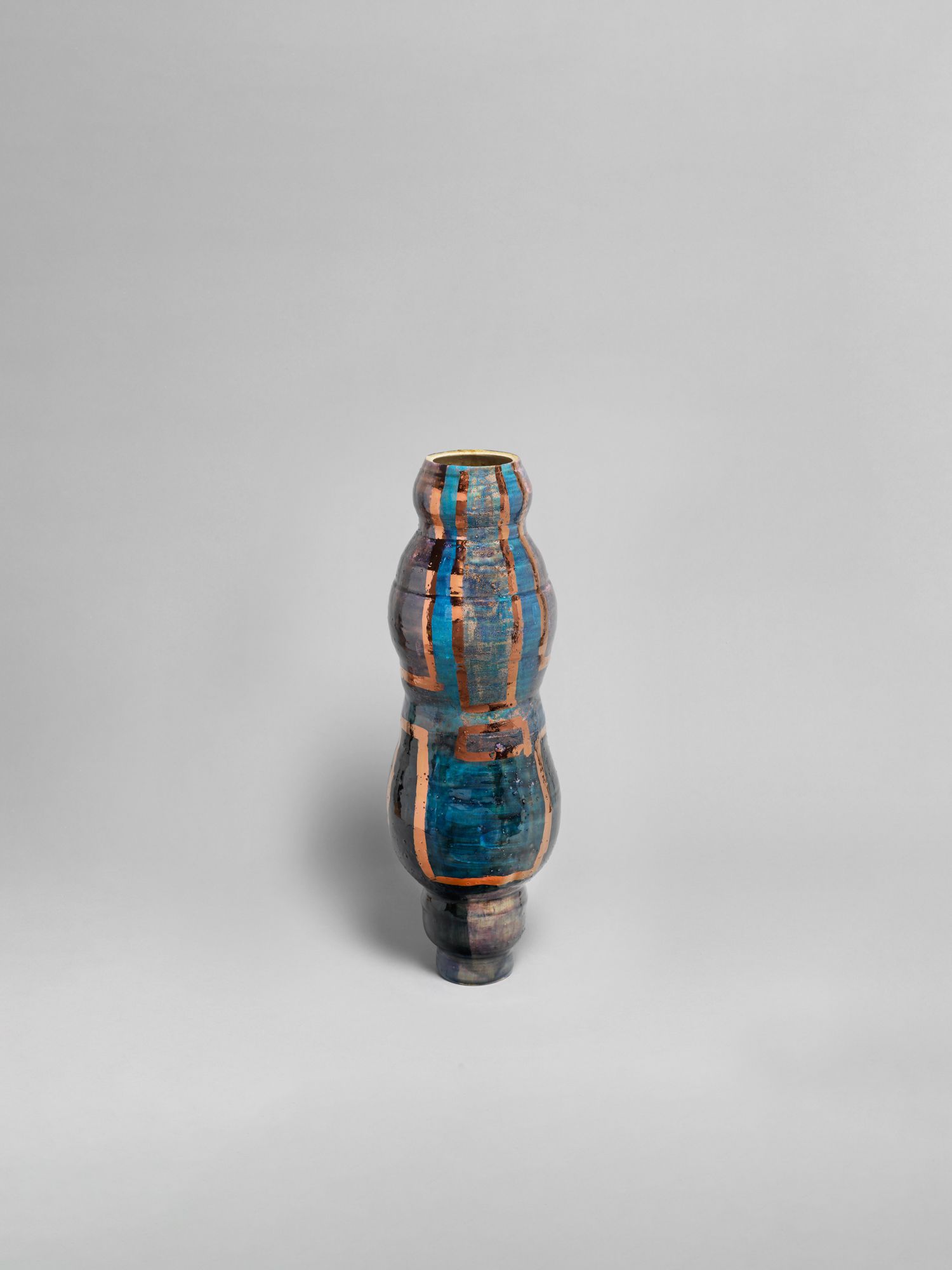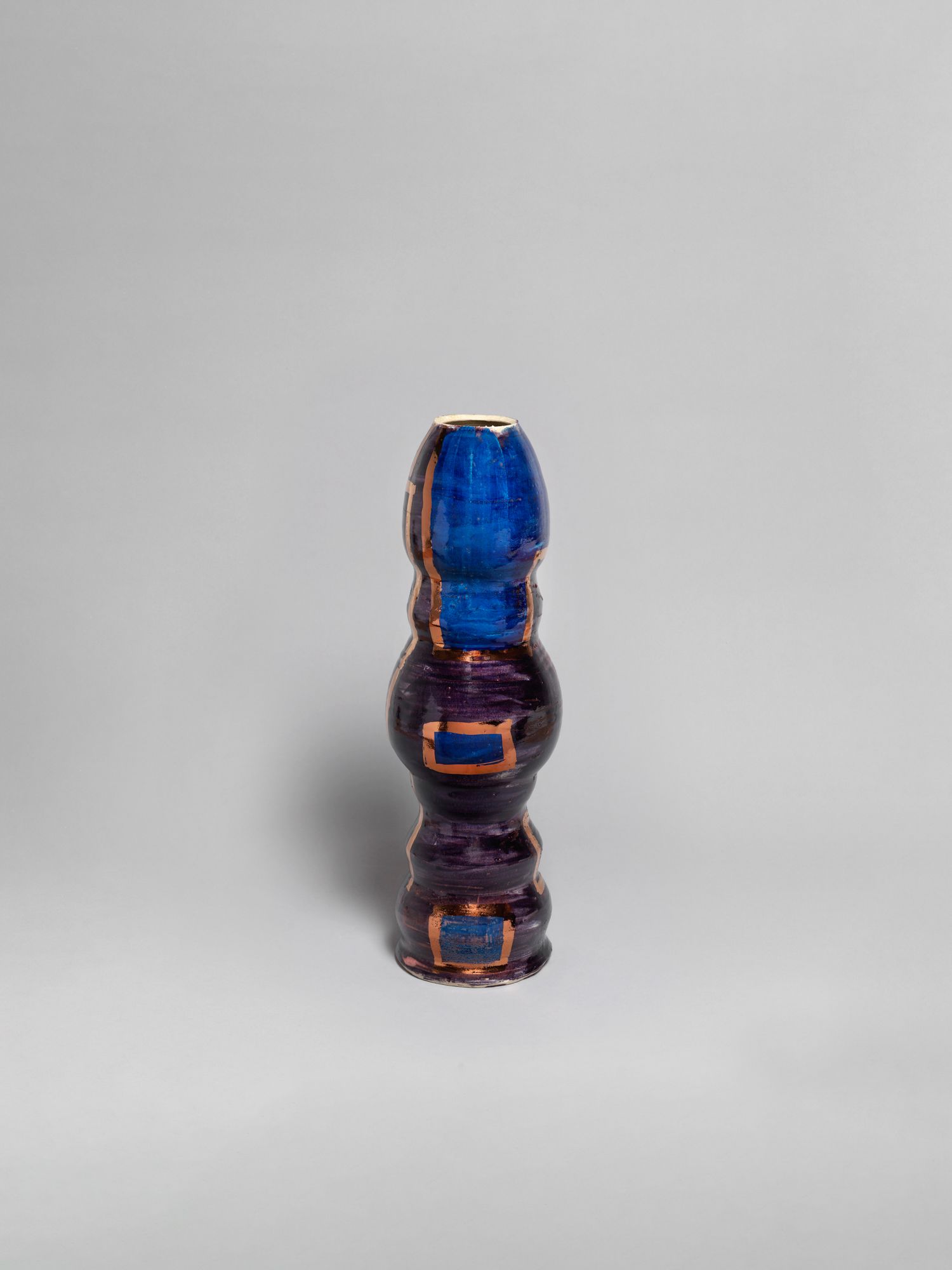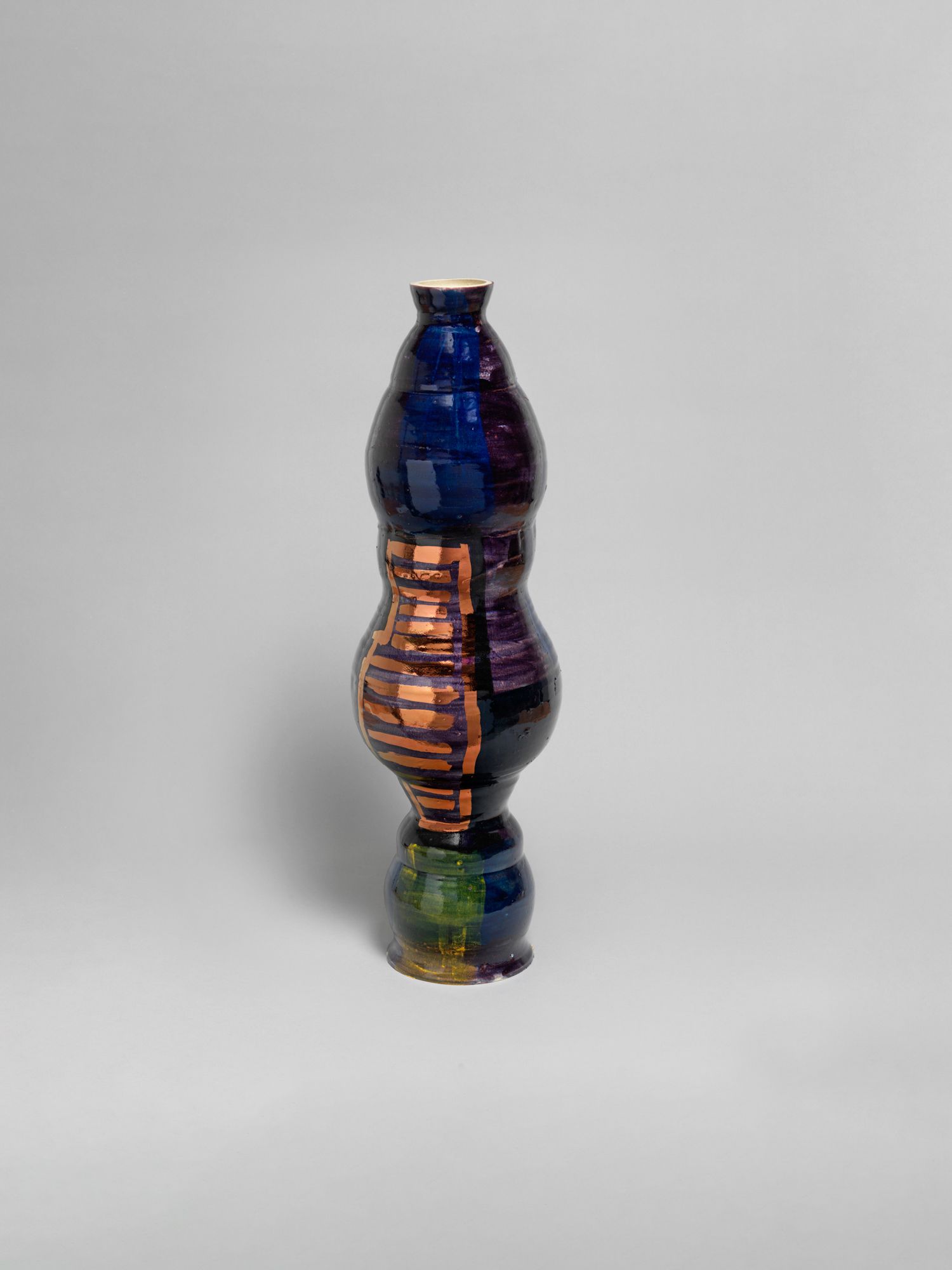 Corbett’s wider practice is deeply rooted in the personal and theoretical. She draws from childhood memories growing up in the American southern state of Mississippi, and later, the urban sprawl of New York, to personalize vessel-like objects she has previously described as being “just like bodies and stand-ins for people”. Embodied objects are differentiated by their formal qualities, i.e., height, shape, and colors, and further personified by a myriad of glazes, lacquers, and metallic lusters, painted on by brushstrokes scored to music and improvised dance and leaving traces of movement that mark her vessels’ surfaces.