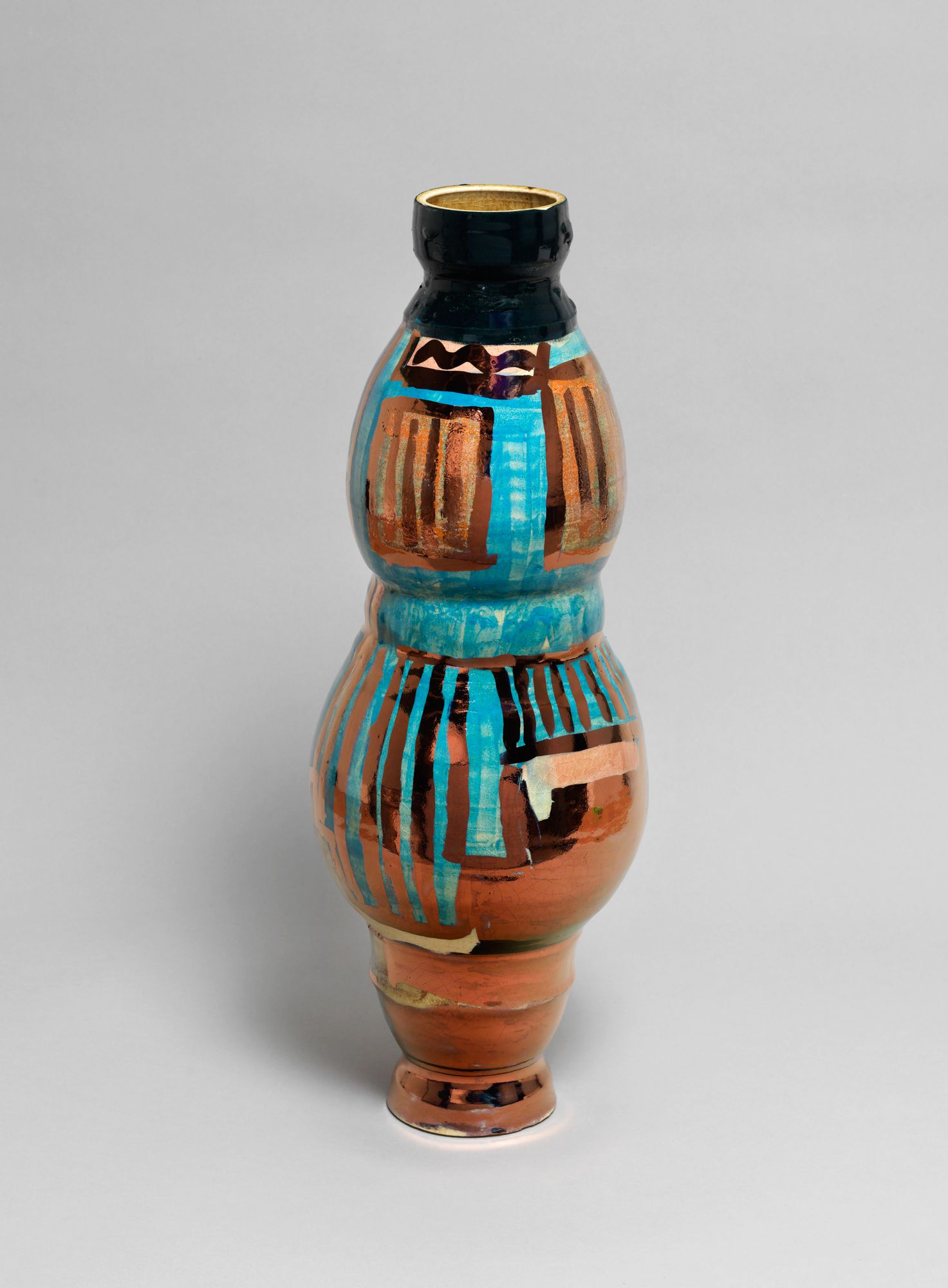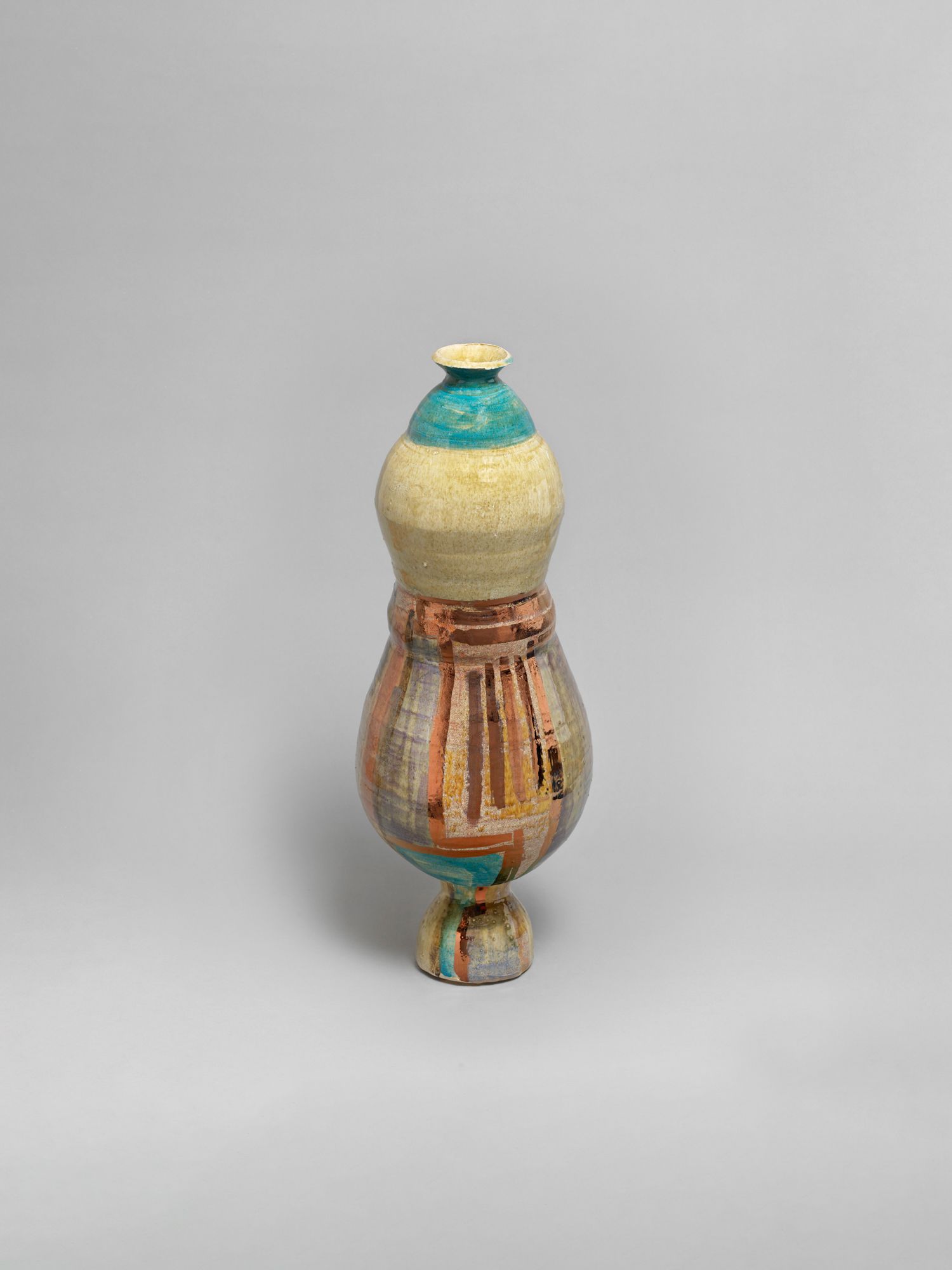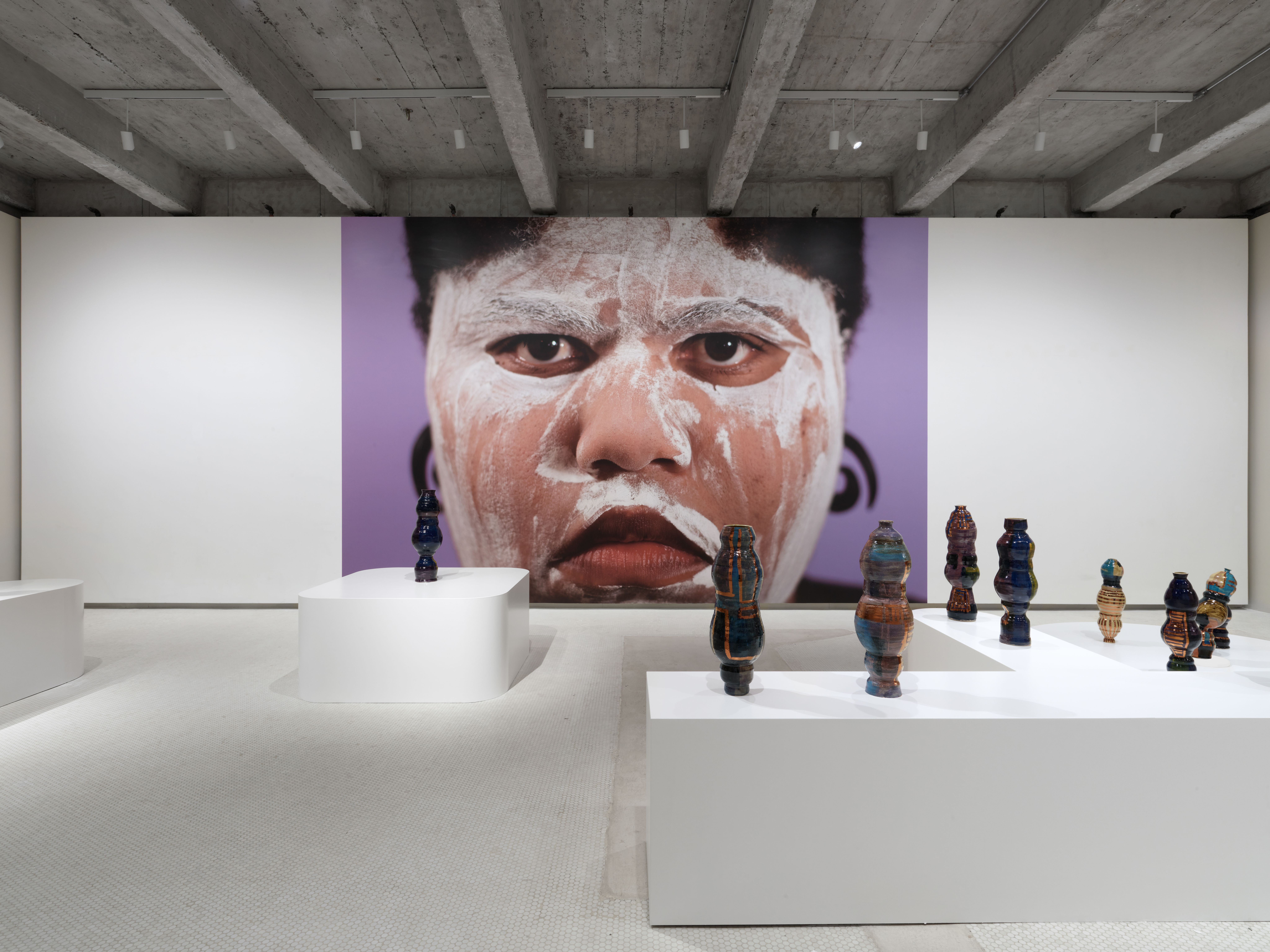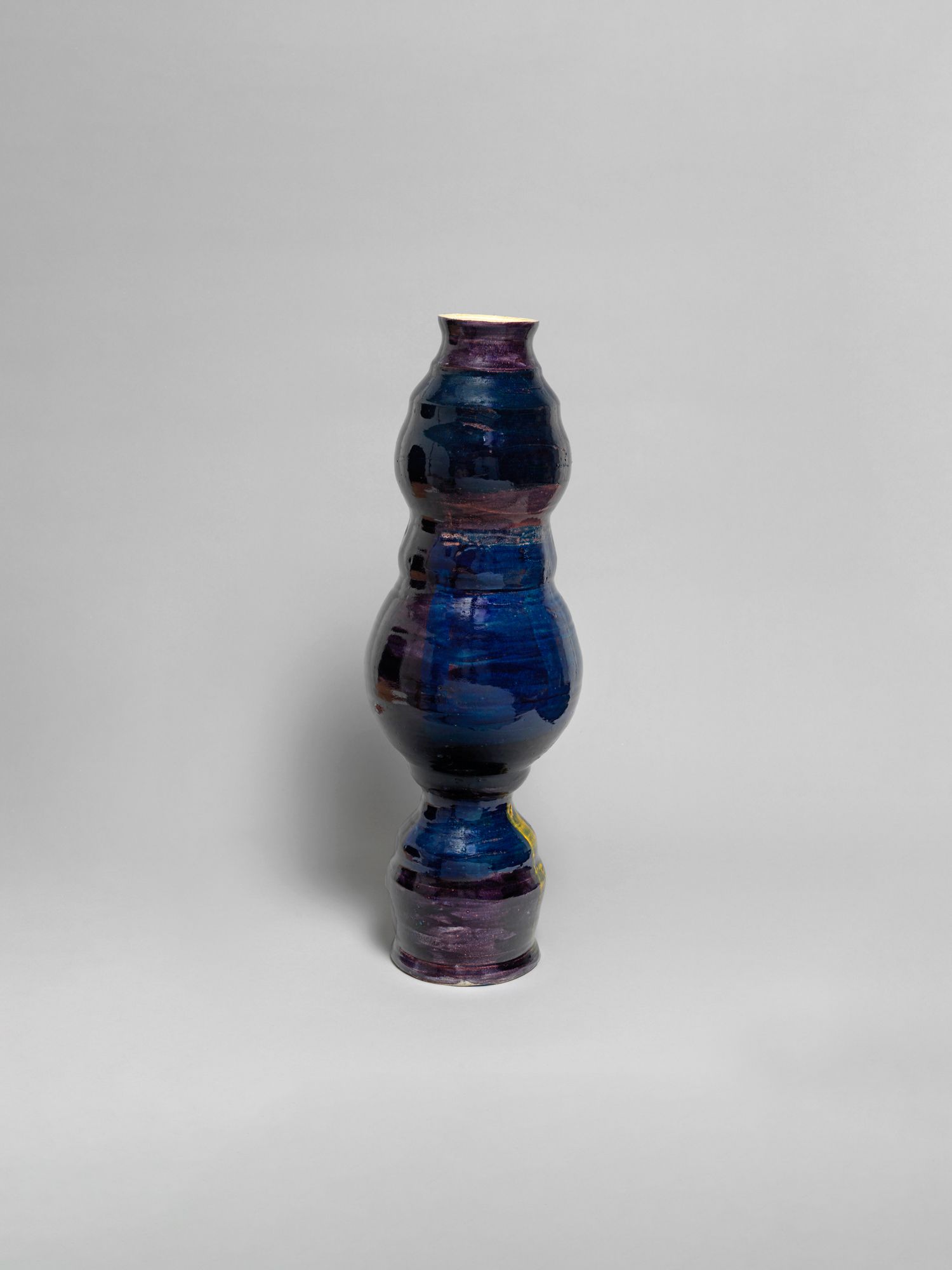 Corbett’s wider practice is deeply rooted in the personal and theoretical. She draws from childhood memories growing up in the American southern state of Mississippi, and later, the urban sprawl of New York, to personalize vessel-like objects she has previously described as being “just like bodies and stand-ins for people”. Embodied objects are differentiated by their formal qualities, i.e., height, shape, and colors, and further personified by a myriad of glazes, lacquers, and metallic lusters, painted on by brushstrokes scored to music and improvised dance and leaving traces of movement that mark her vessels’ surfaces.