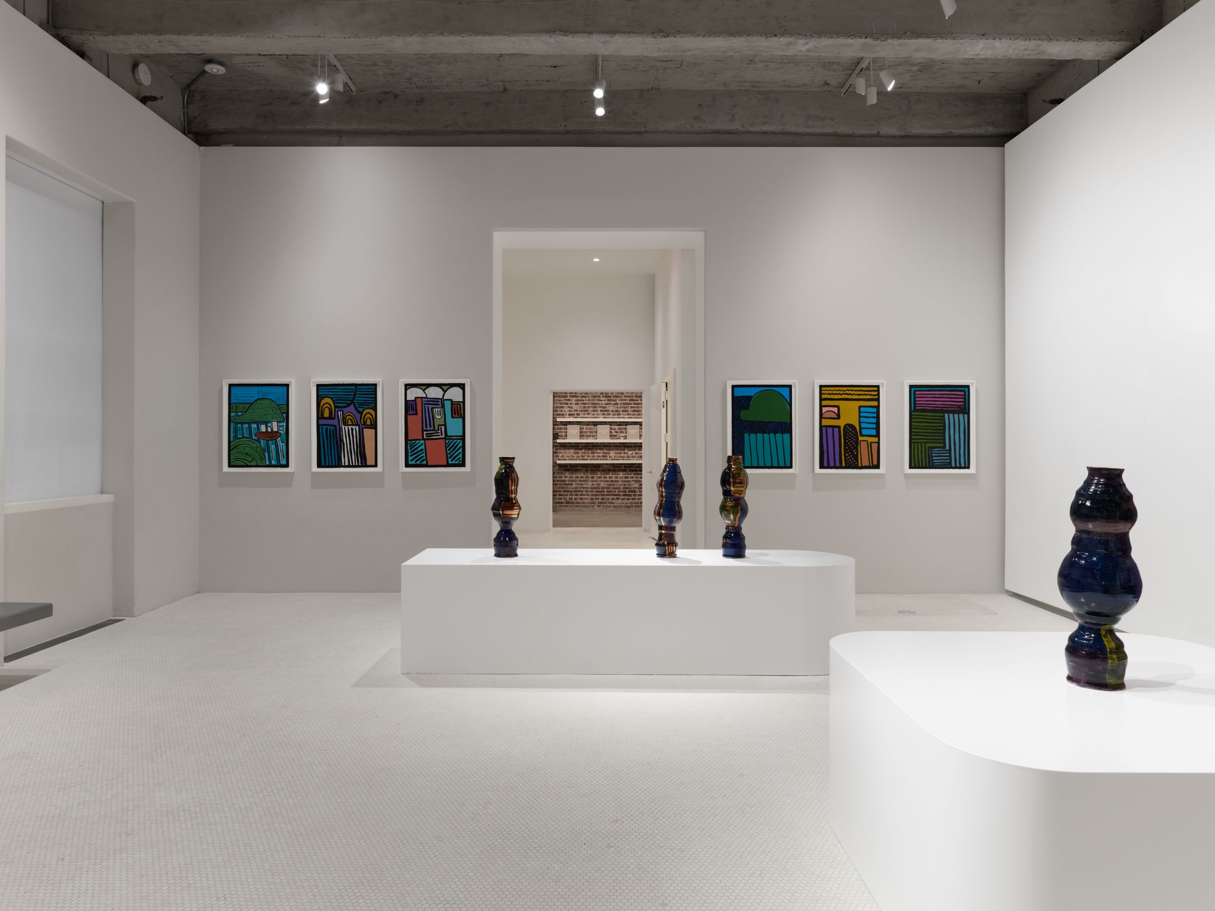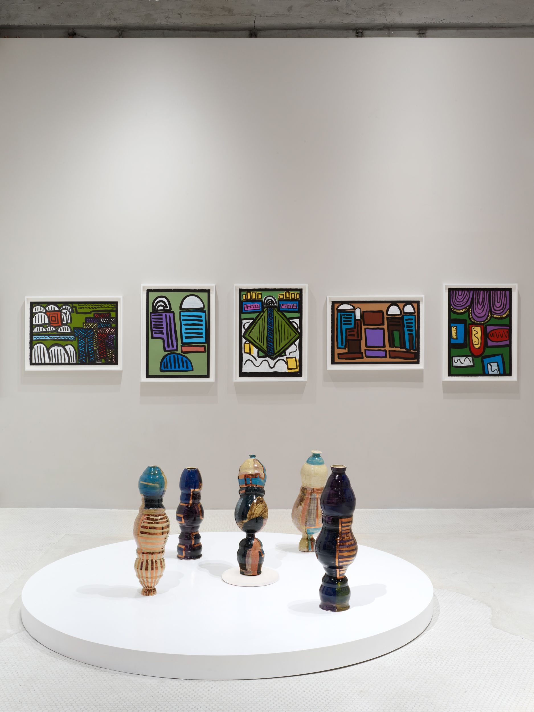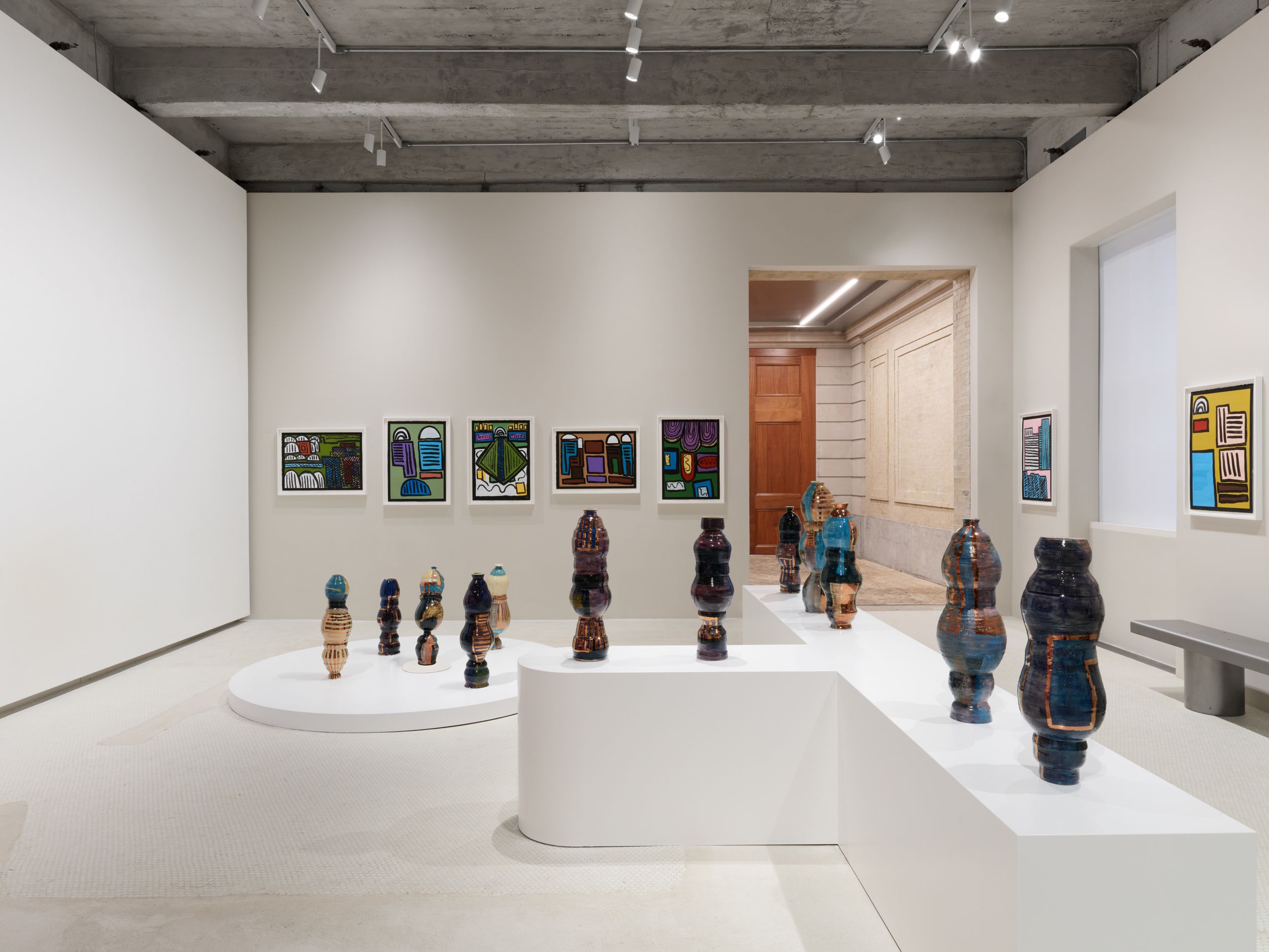 Corbett’s wider practice is deeply rooted in the personal and theoretical. She draws from childhood memories growing up in the American southern state of Mississippi, and later, the urban sprawl of New York, to personalize vessel-like objects she has previously described as being “just like bodies and stand-ins for people”. Embodied objects are differentiated by their formal qualities, i.e., height, shape, and colors, and further personified by a myriad of glazes, lacquers, and metallic lusters, painted on by brushstrokes scored to music and improvised dance and leaving traces of movement that mark her vessels’ surfaces.