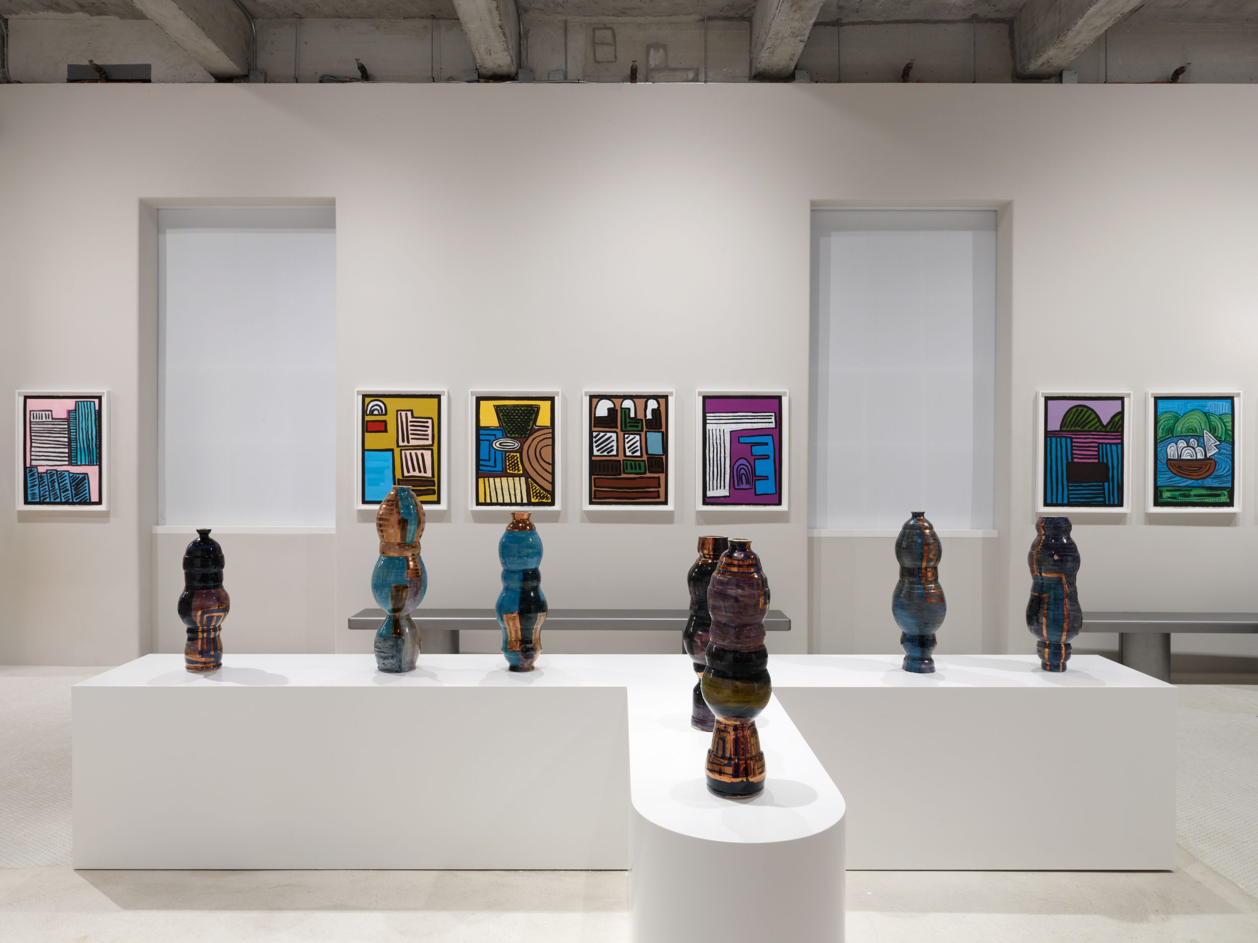 Sixteen vessels of different heights, shapes, leans and glazes—notably, violet hues are prominent in this body of work—form a gathering of sorts in the gallery with titles that express some familiarity in catchphrases such as Do you see what I see”, “Our freedom is not your absolute freedom”, “Stop all that slouching, boy”, “Just the blind leading the blind”, and “The ground beneath us” (all works 2021). Each vessel is inspired by a real person, but rather than calling them by their actual names, they are repositioned anew. Bold, blinging and determined the personages are placed in a stereotype-free space. An ensemble without prejudice or neighborhood borders. The musicality of improvised, transcendental Jazz served as a score of sorts to Corbett’s mark-making on objects’ surfaces (Corbett mentioned in conversation, the one-track, nine-movement album Promises by Floating Points, Pharoah Sanders and The London Symphony Orchestra (LSO) looming sonically in her studio as she made these new works).