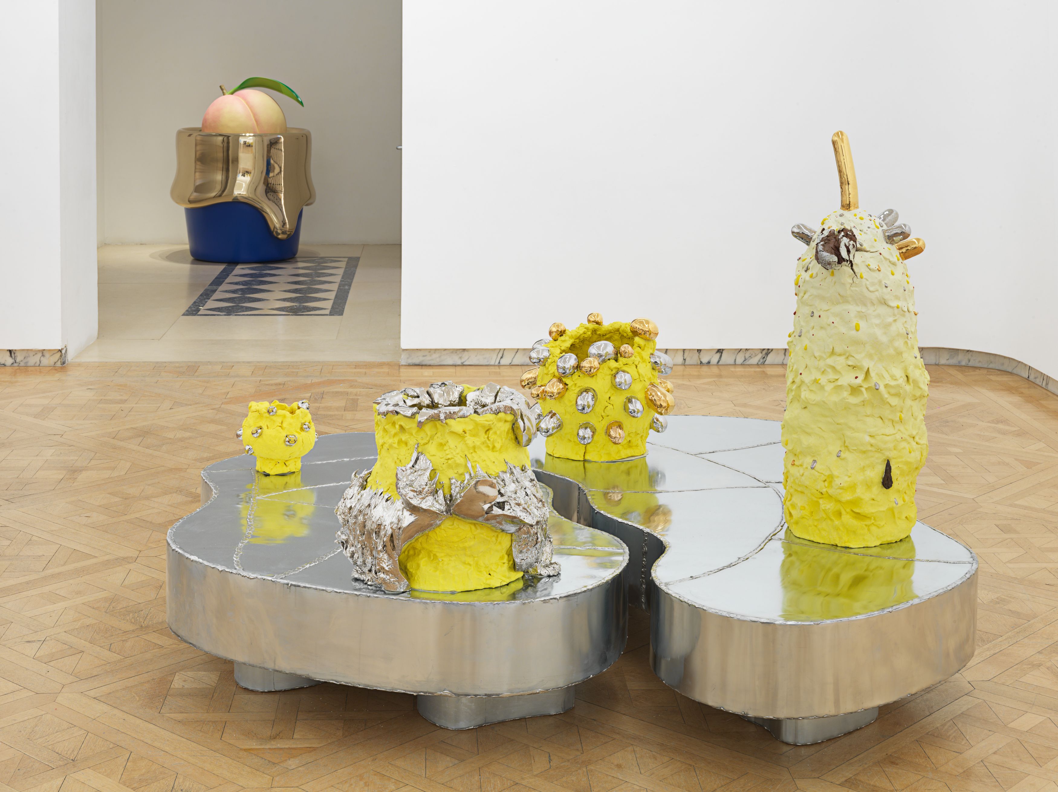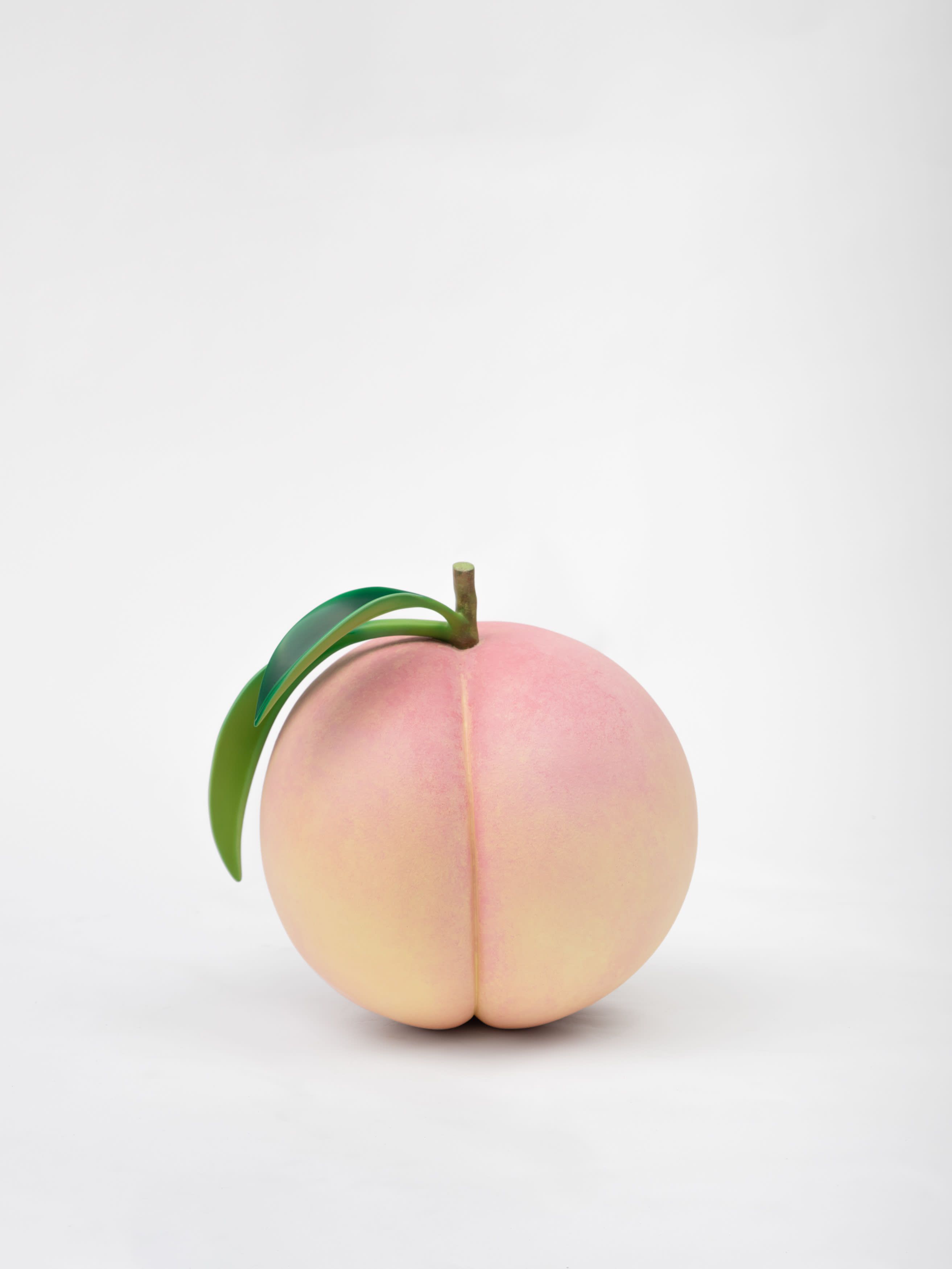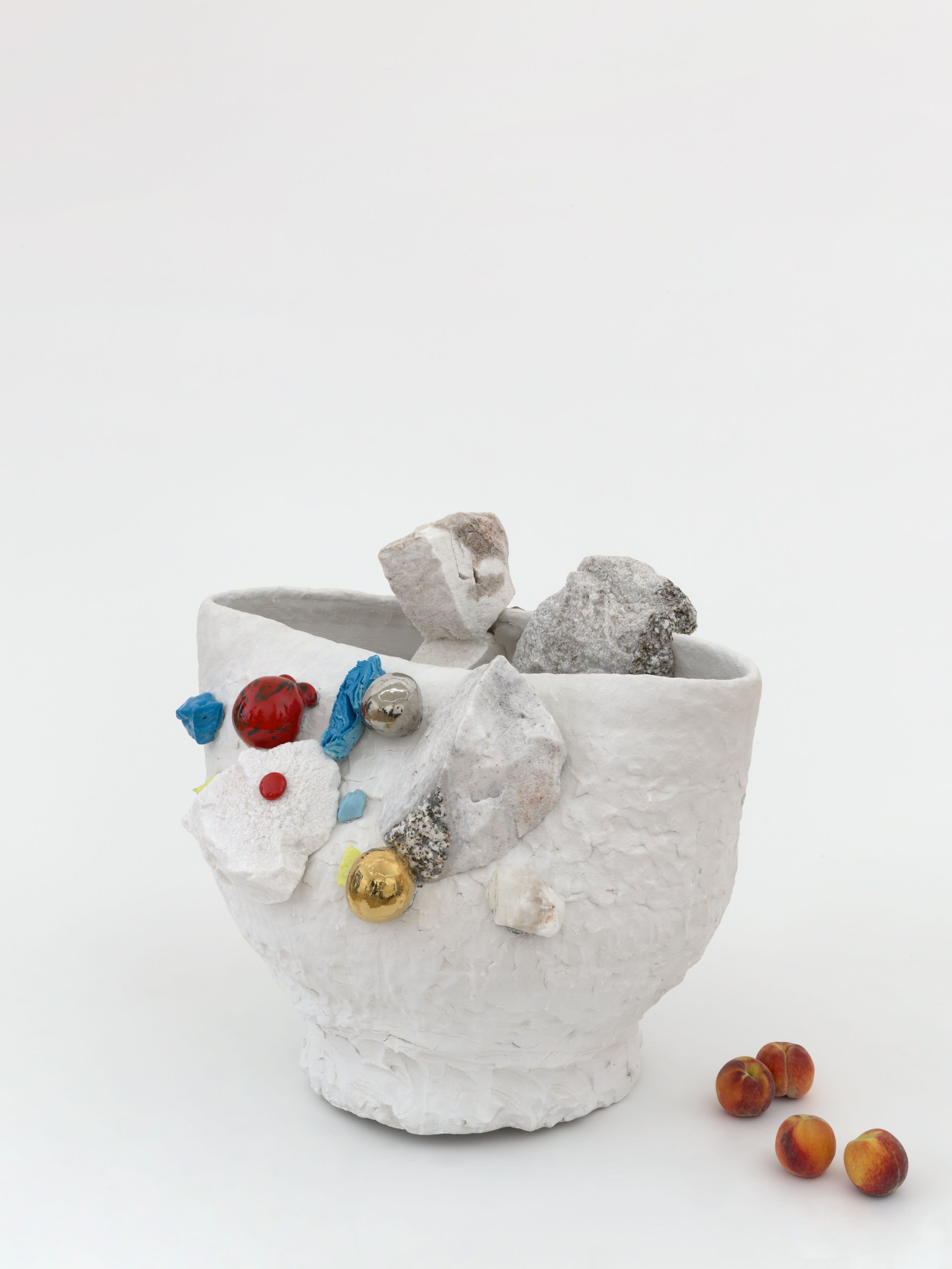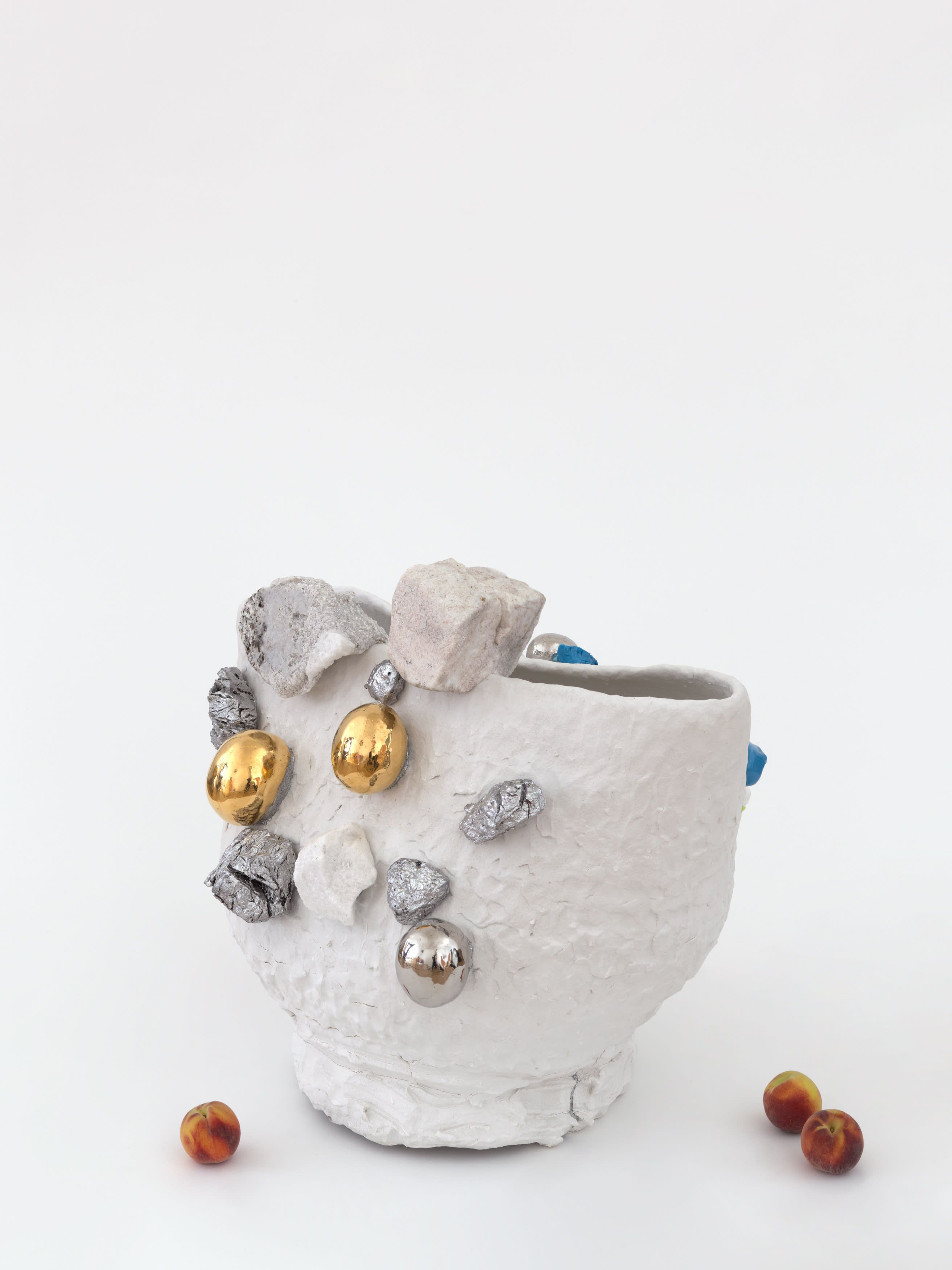 Staying true to his work’s roots in tea ceremony’s ability to stretch time and confound expectations, Kuwata has also begun to introduce realistic trompe l’oeil objects that both collide with and strangely complement his abstract language. In 2023, Kuwata was commissioned by the Okayama Performing Arts Theater to create a public work of art. Kuwata came up with the idea for a larger-than-life Chawan with realistic peaches sprouting from signature platinum-coated appendages to pay tribute to the region’s famous peaches—both a literal agricultural product and a symbol of longevity, hospitality, and generosity.