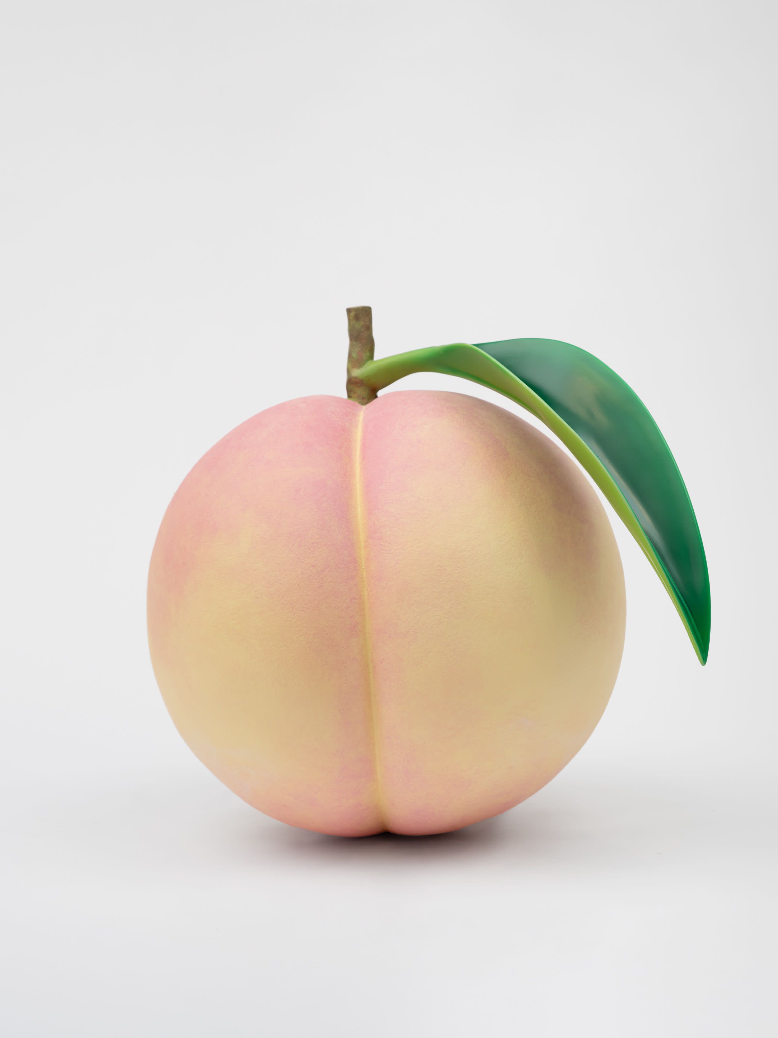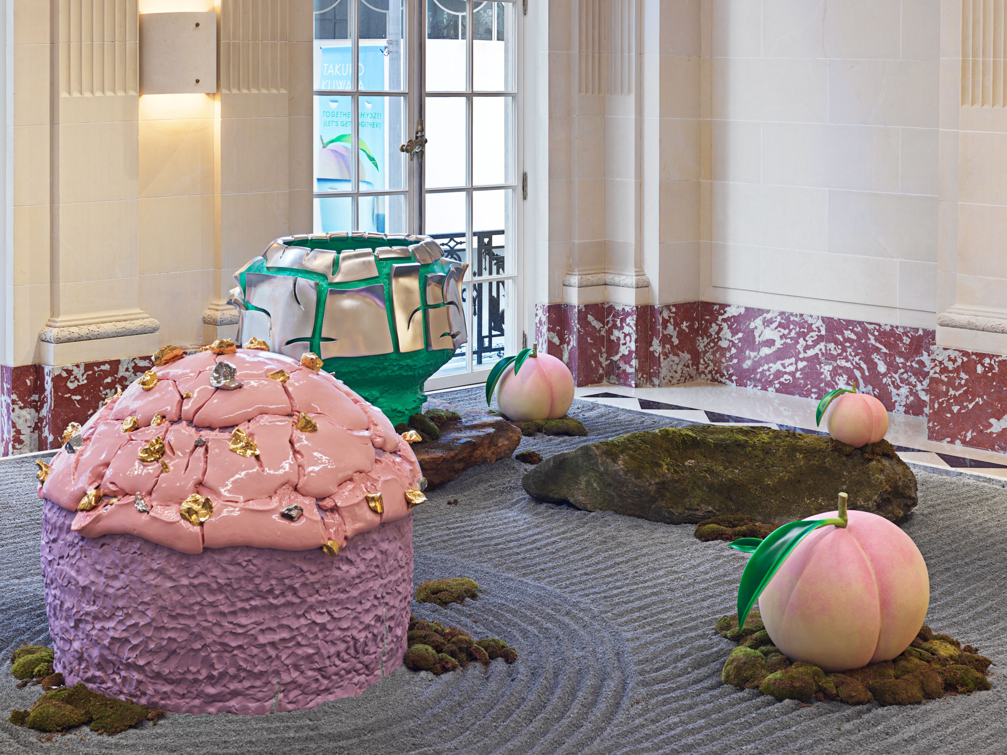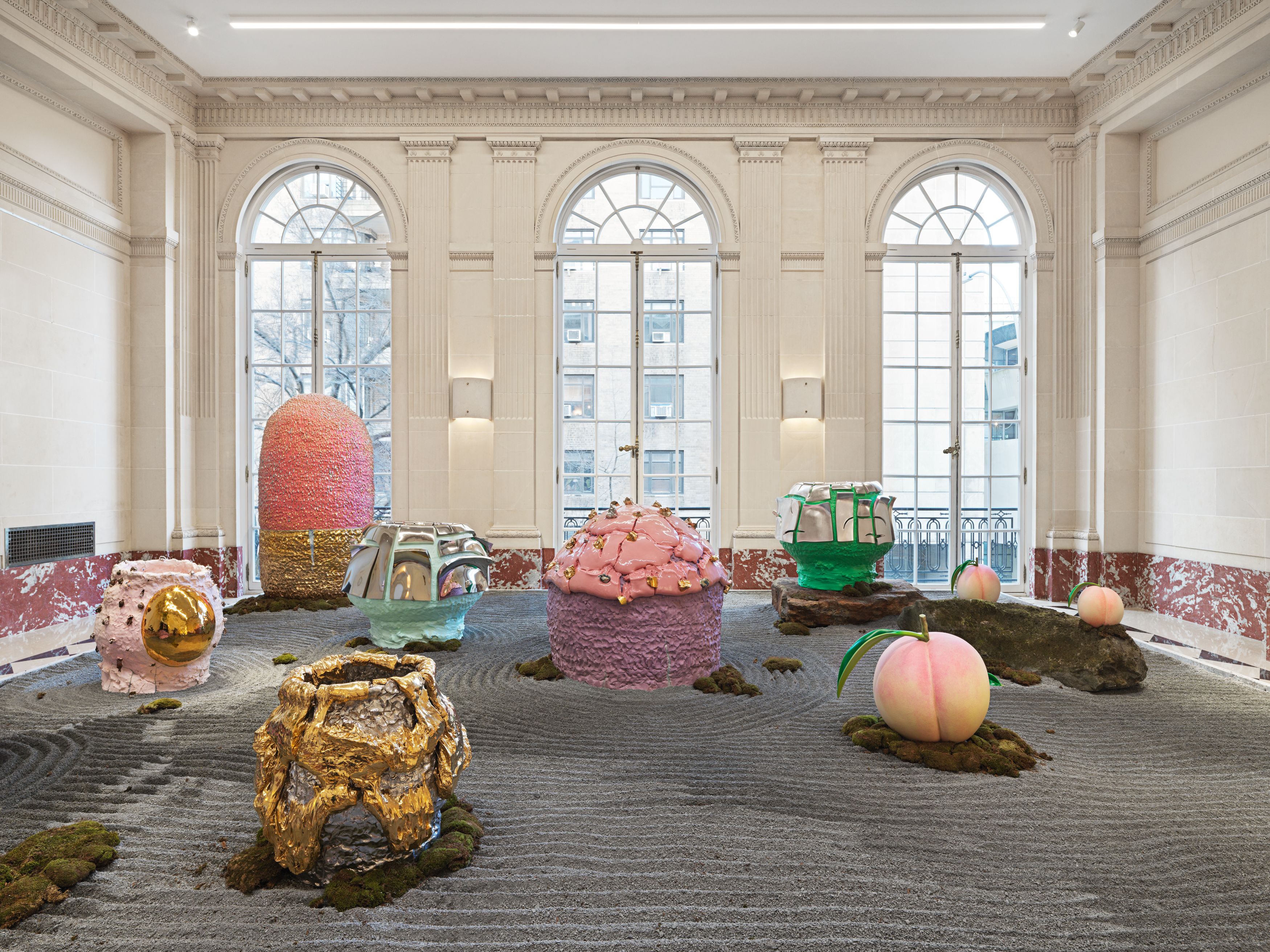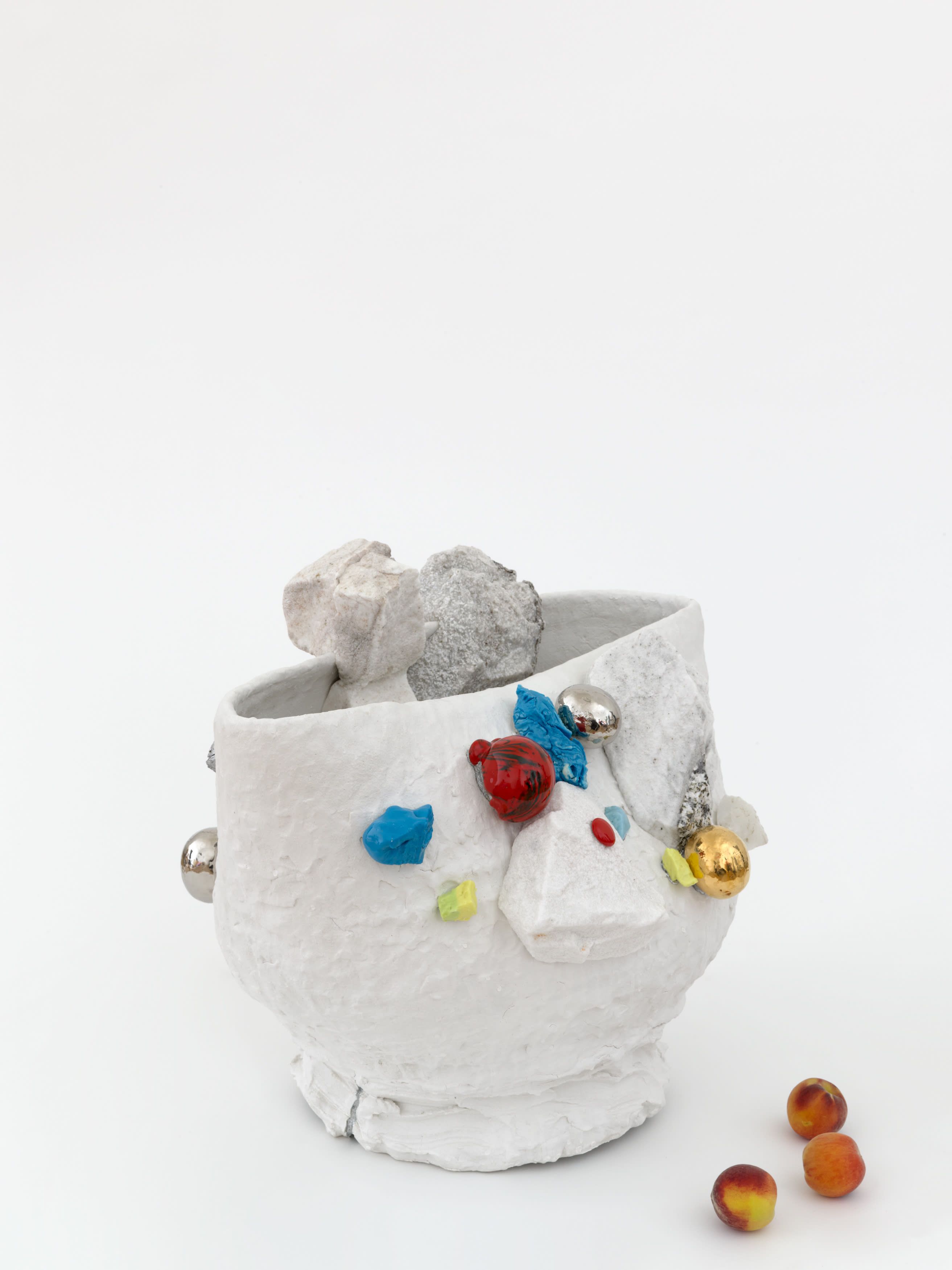 Staying true to his work’s roots in tea ceremony’s ability to stretch time and confound expectations, Kuwata has also begun to introduce realistic trompe l’oeil objects that both collide with and strangely complement his abstract language. In 2023, Kuwata was commissioned by the Okayama Performing Arts Theater to create a public work of art. Kuwata came up with the idea for a larger-than-life Chawan with realistic peaches sprouting from signature platinum-coated appendages to pay tribute to the region’s famous peaches—both a literal agricultural product and a symbol of longevity, hospitality, and generosity.