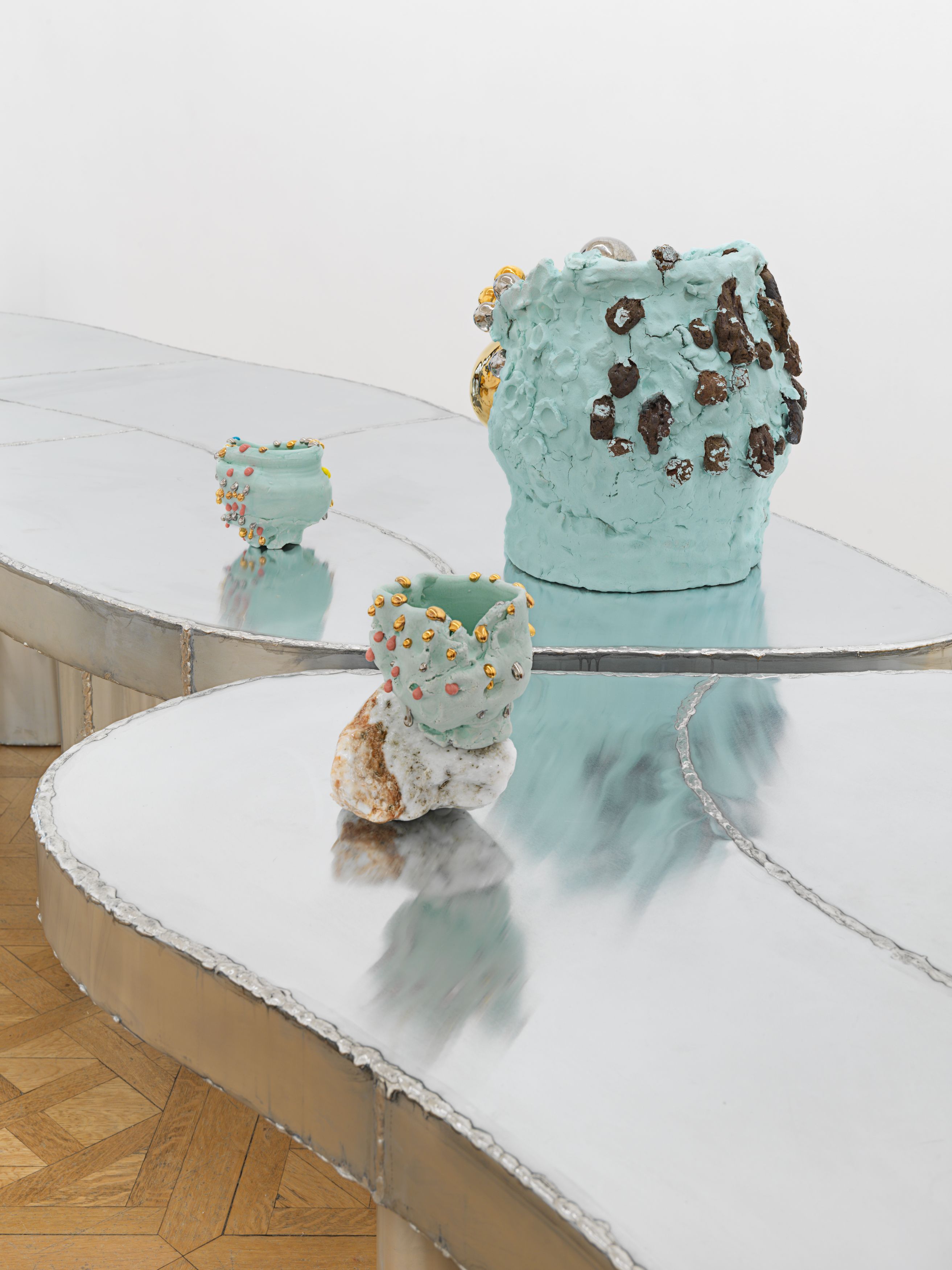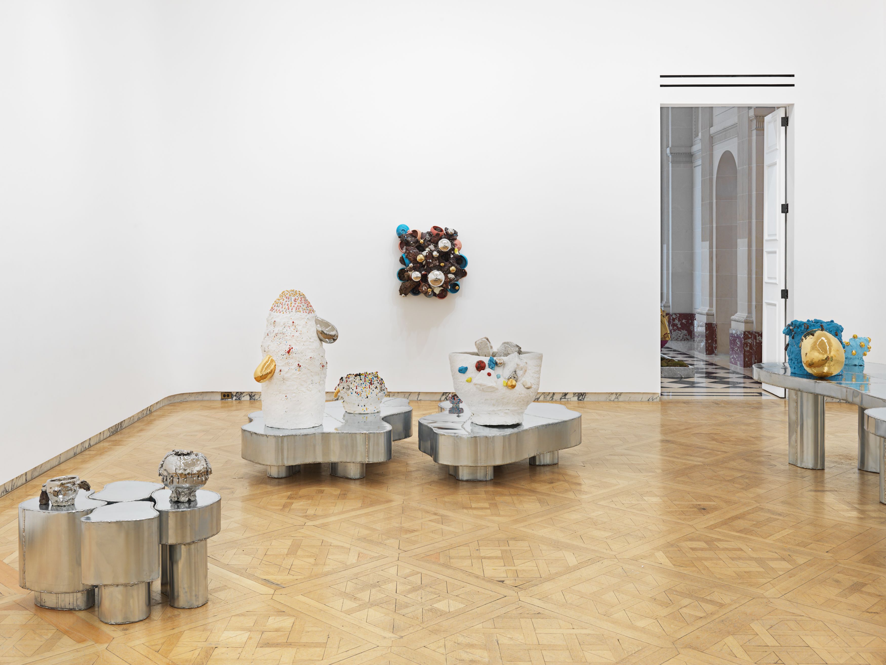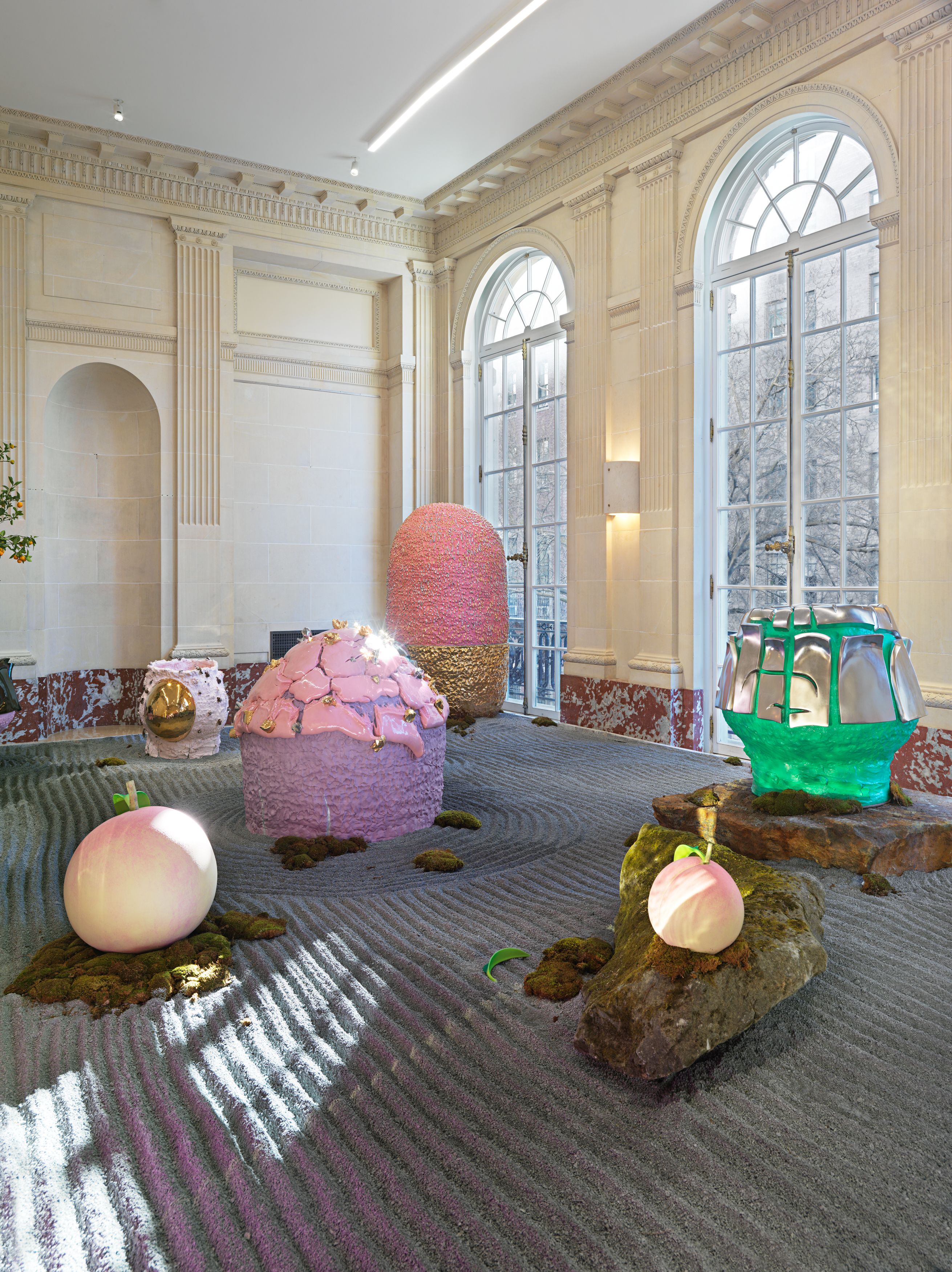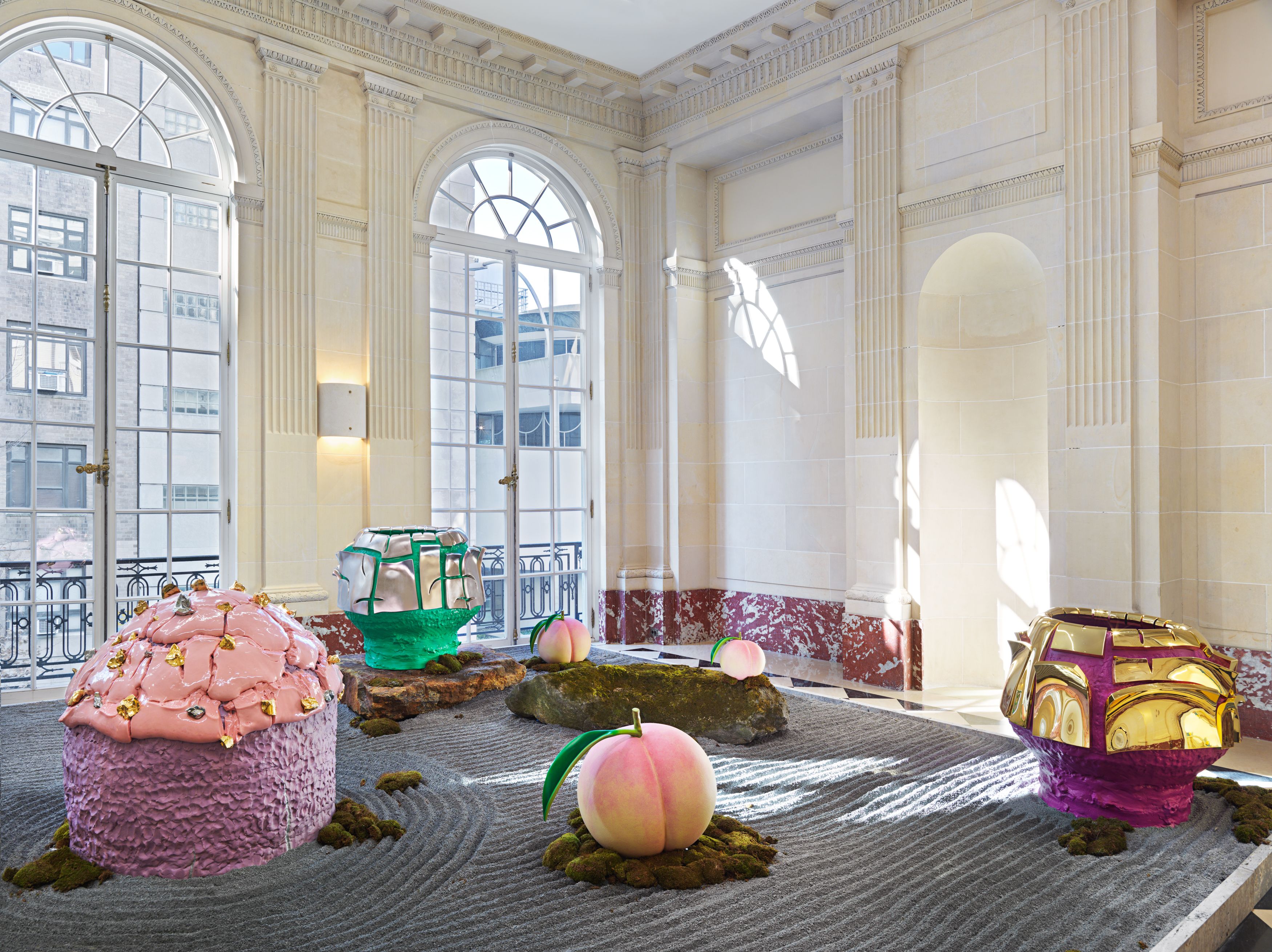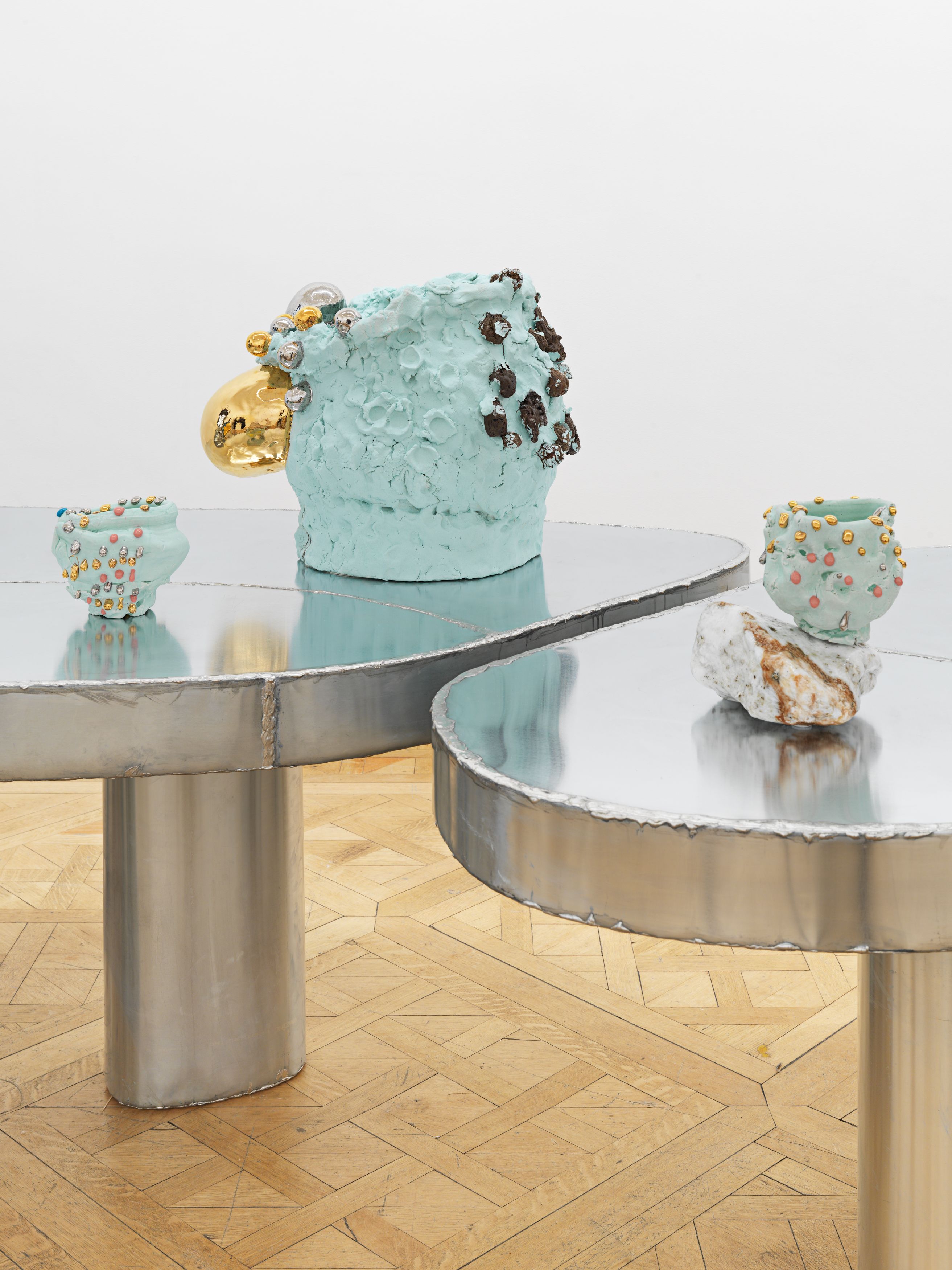 Staying true to his work’s roots in tea ceremony’s ability to stretch time and confound expectations, Kuwata has also begun to introduce realistic trompe l’oeil objects that both collide with and strangely complement his abstract language. In 2023, Kuwata was commissioned by the Okayama Performing Arts Theater to create a public work of art. Kuwata came up with the idea for a larger-than-life Chawan with realistic peaches sprouting from signature platinum-coated appendages to pay tribute to the region’s famous peaches—both a literal agricultural product and a symbol of longevity, hospitality, and generosity.