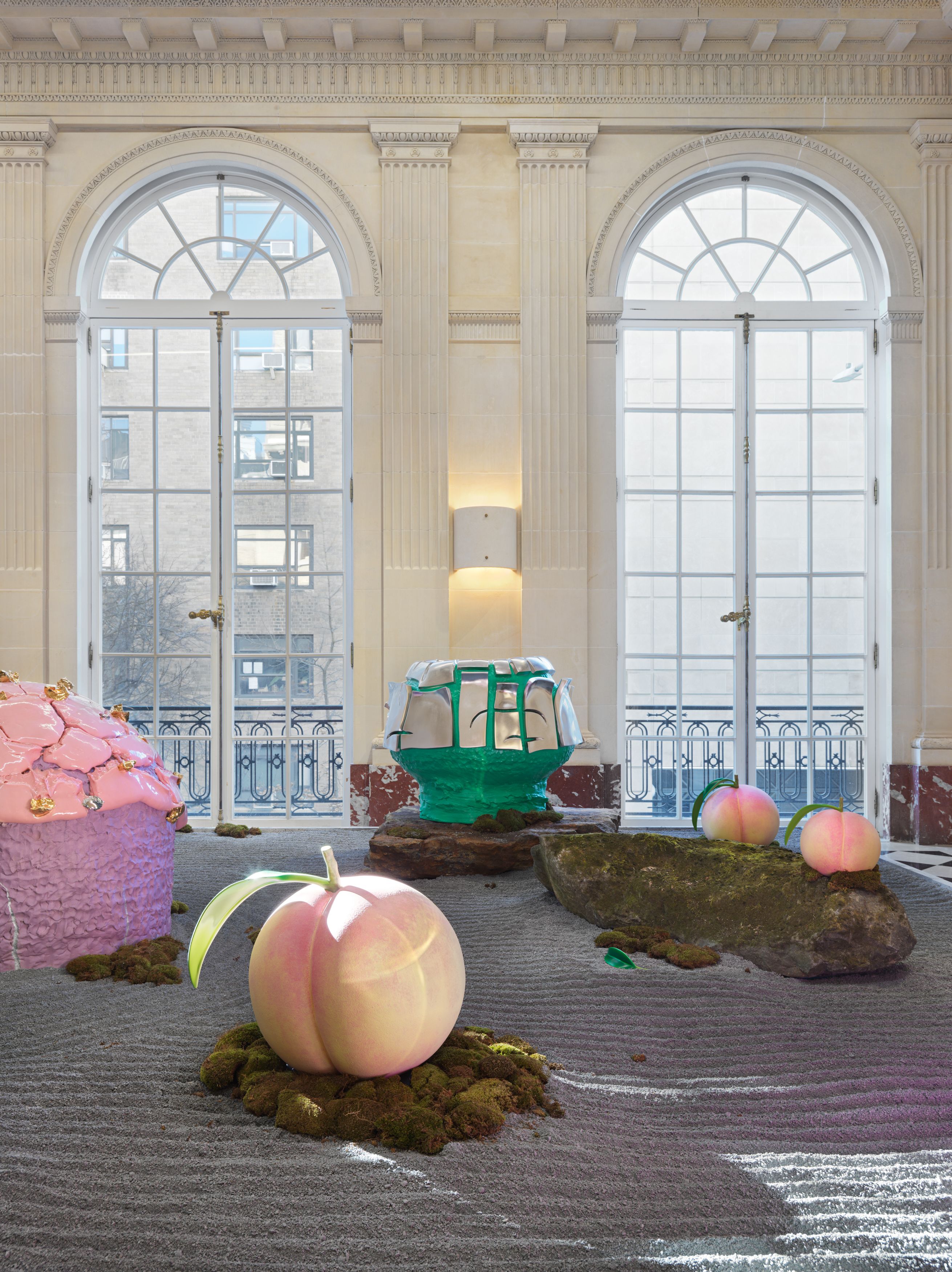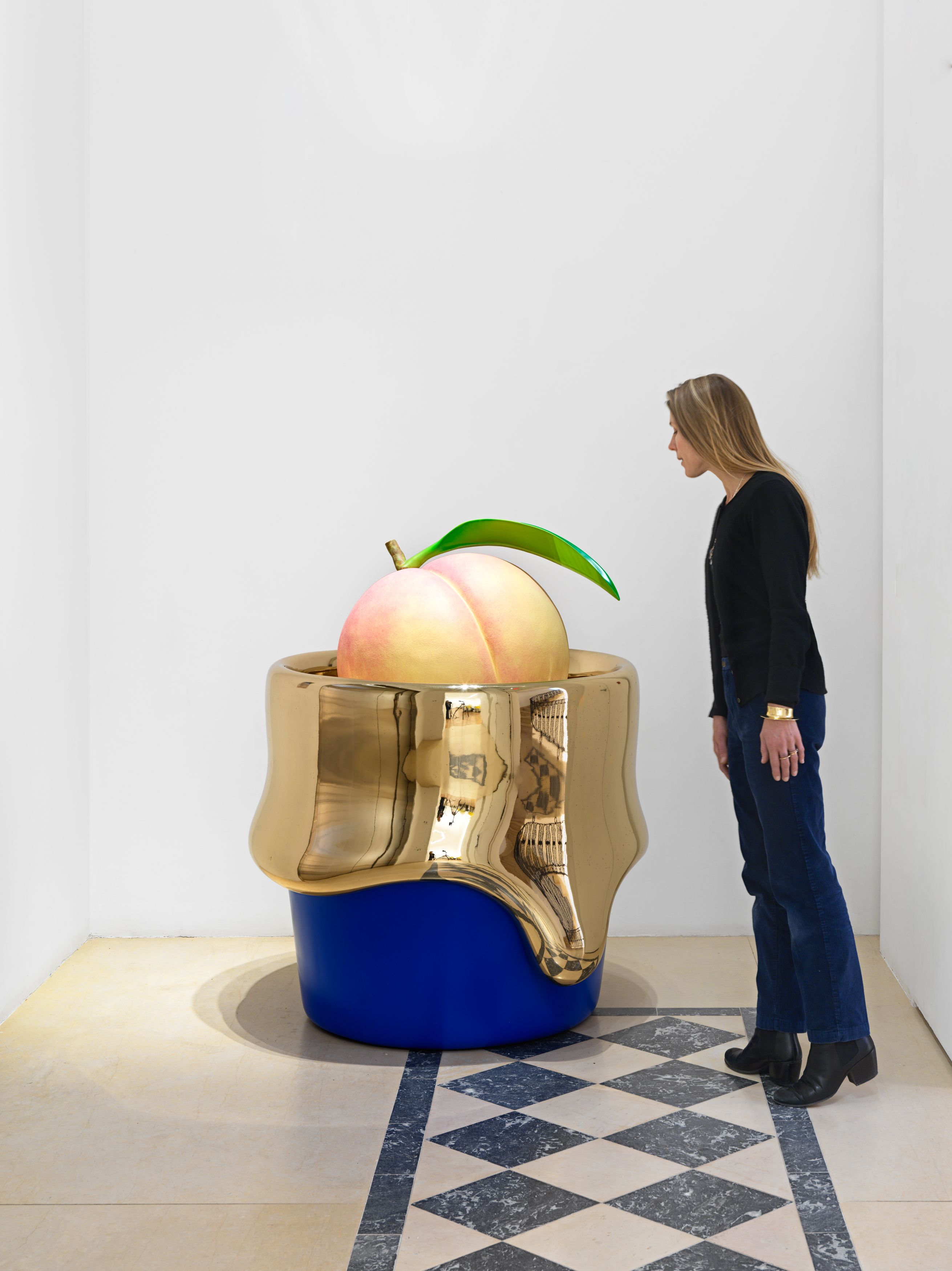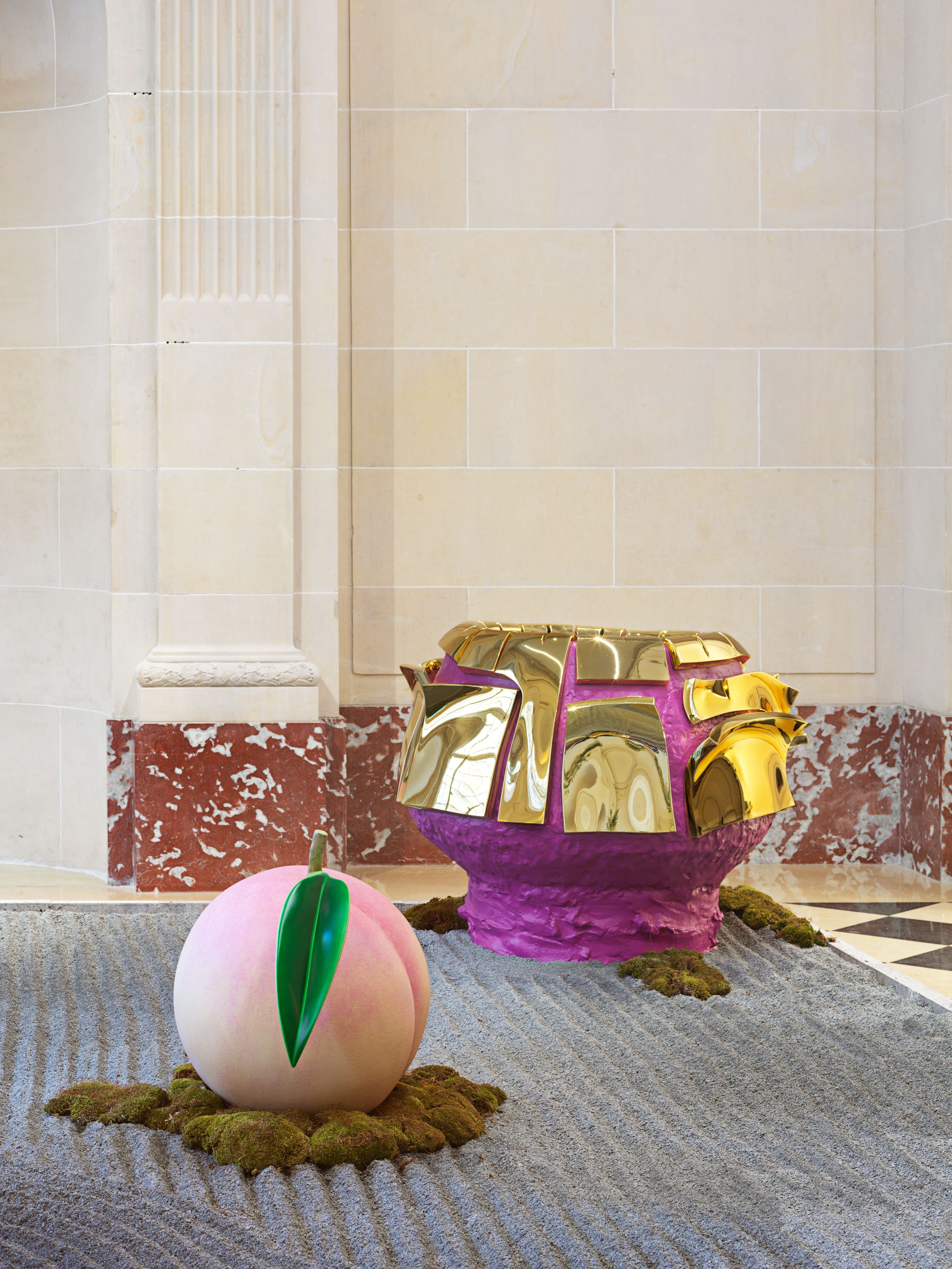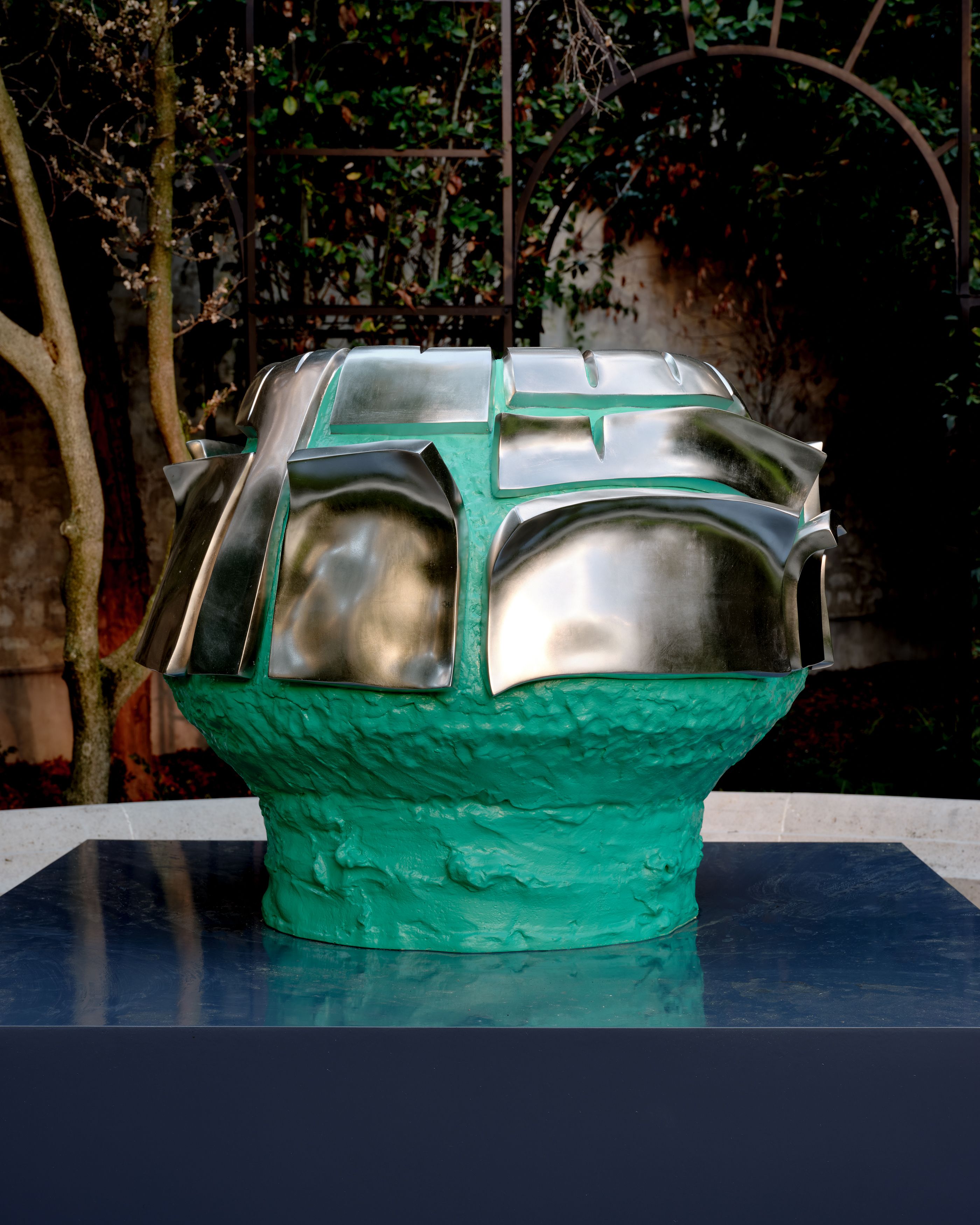 Staying true to his work’s roots in tea ceremony’s ability to stretch time and confound expectations, Kuwata has also begun to introduce realistic trompe l’oeil objects that both collide with and strangely complement his abstract language. In 2023, Kuwata was commissioned by the Okayama Performing Arts Theater to create a public work of art. Kuwata came up with the idea for a larger-than-life Chawan with realistic peaches sprouting from signature platinum-coated appendages to pay tribute to the region’s famous peaches—both a literal agricultural product and a symbol of longevity, hospitality, and generosity.