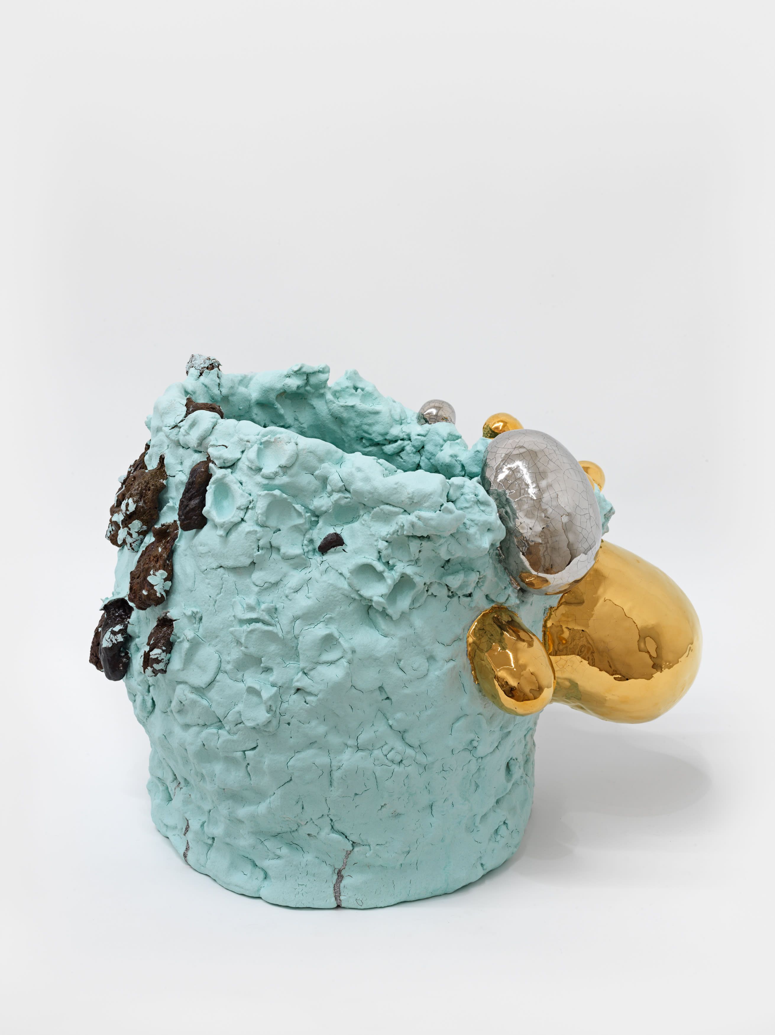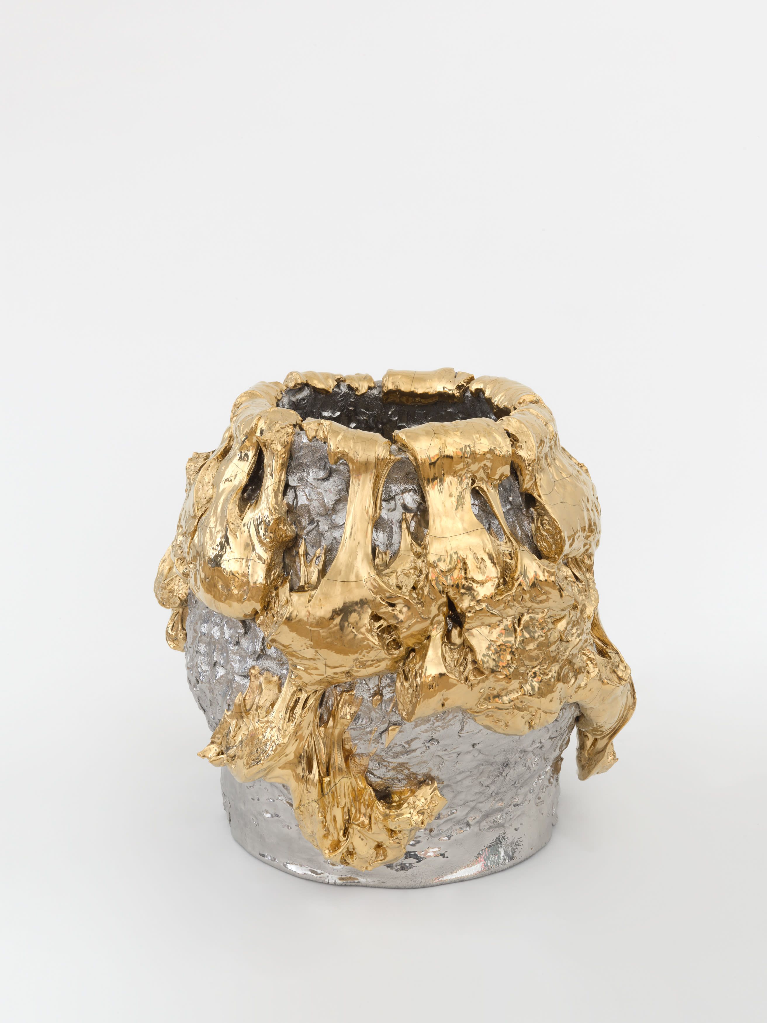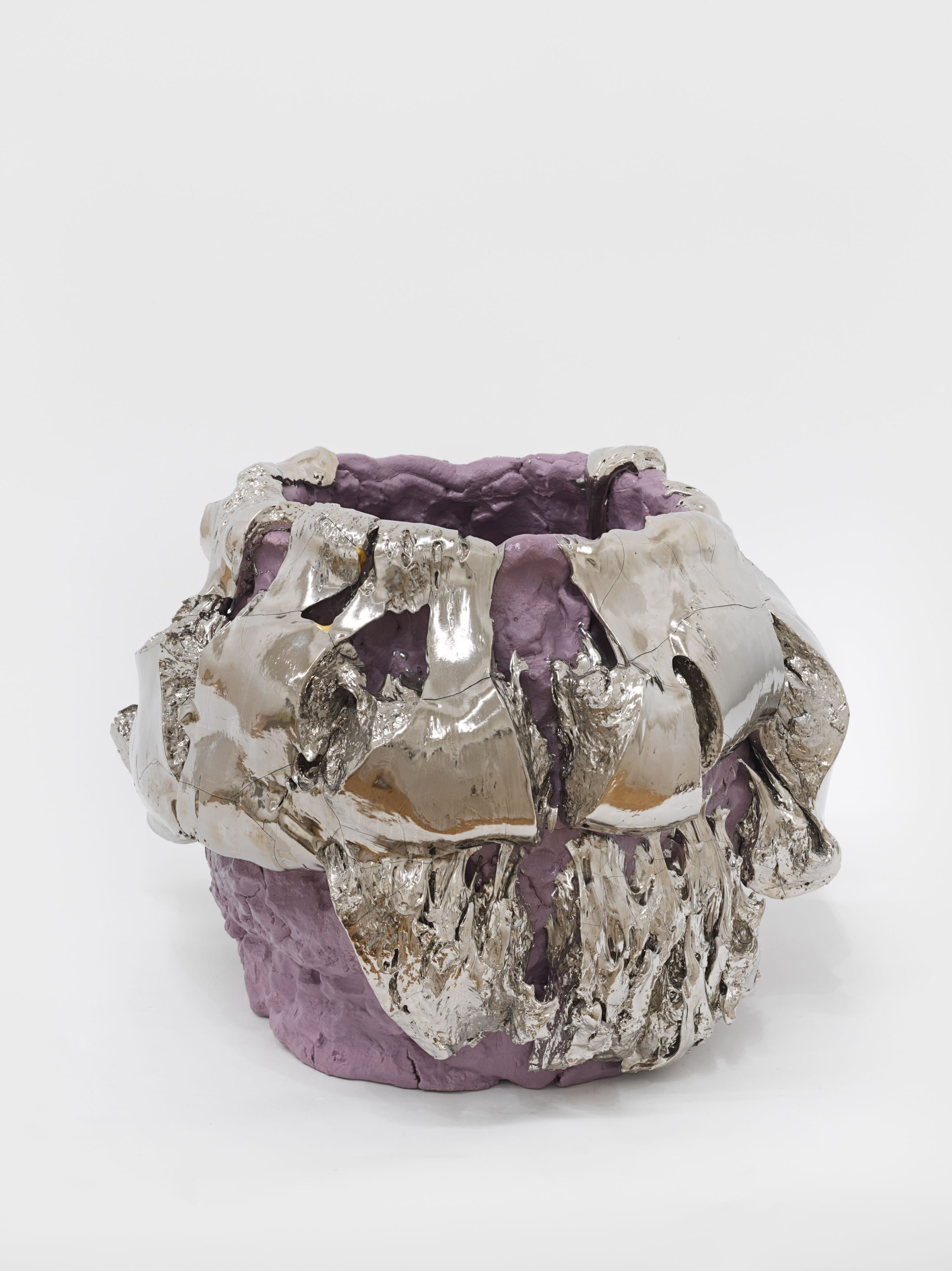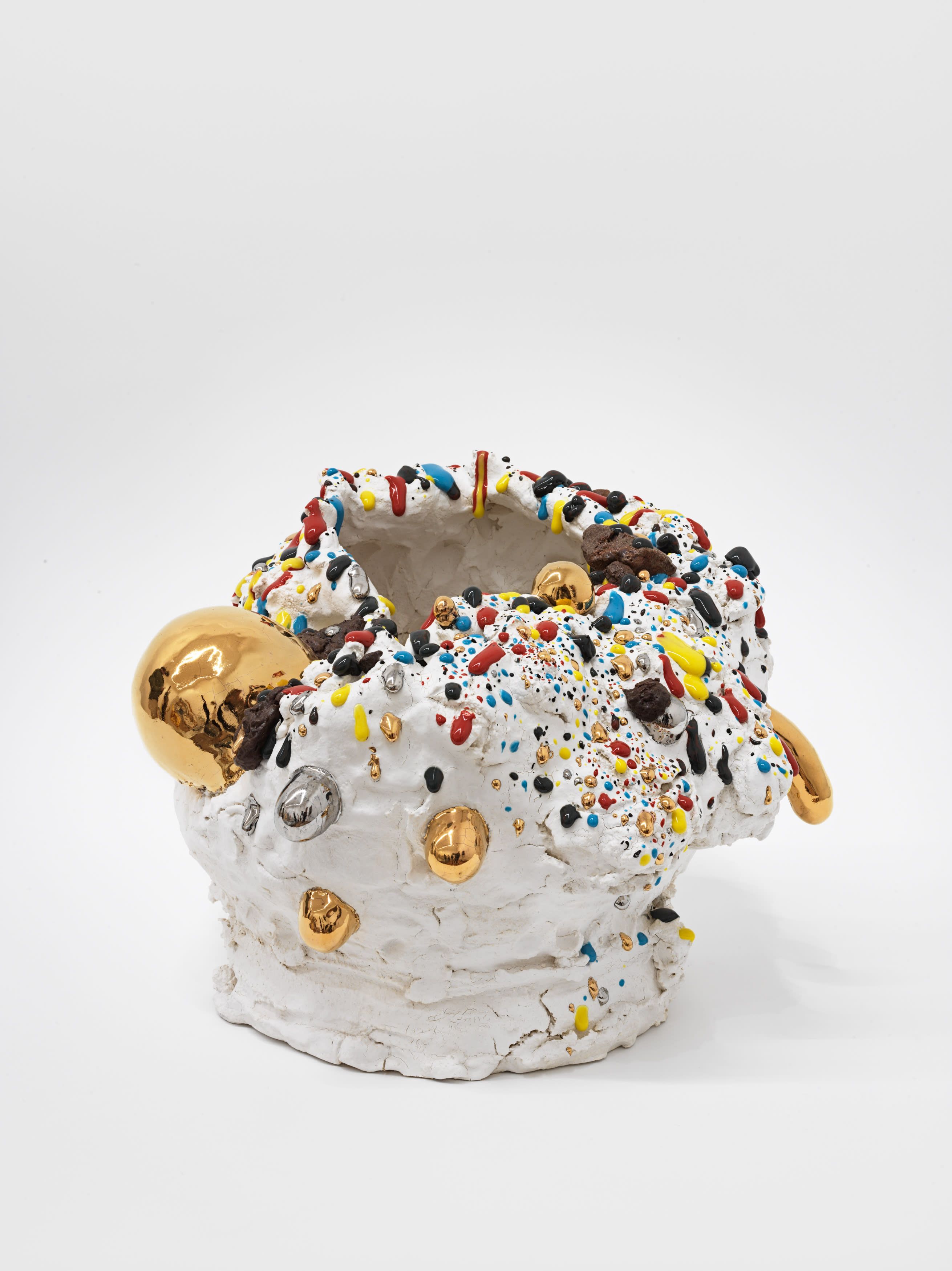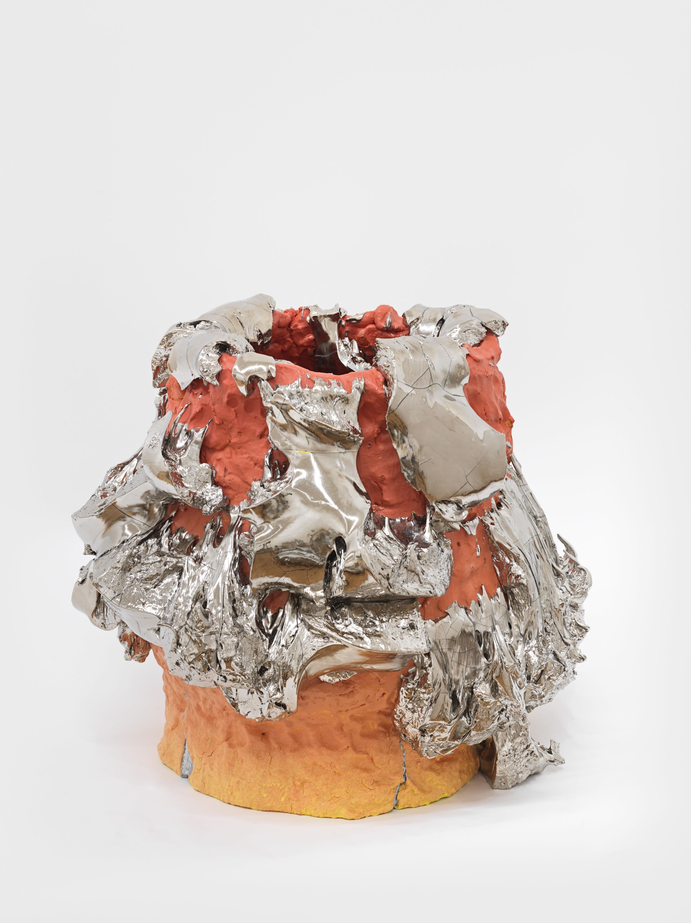 In 1967, Richard Serra published his famed Verblist, an inventory of more than 100 verbs that he described as “actions to relate to oneself, material, place, and process.” The sheer abundance of Serra’s verbs, like “to heap,” “to flow,” and “to swirl,” reveal a multiverse of artistic possibilities, but also the artist’s curiosity about structure and limitations. Few artists working in the medium of ceramics take this lexicon to heart more than Takuro Kuwata. Kuwata’s fantasias in clay effervesce with verbs. A single work can simultaneously shine, pop, droop, shiver, bubble, peel, sweat, crack, calve, burst, shimmer, sag, and flake.