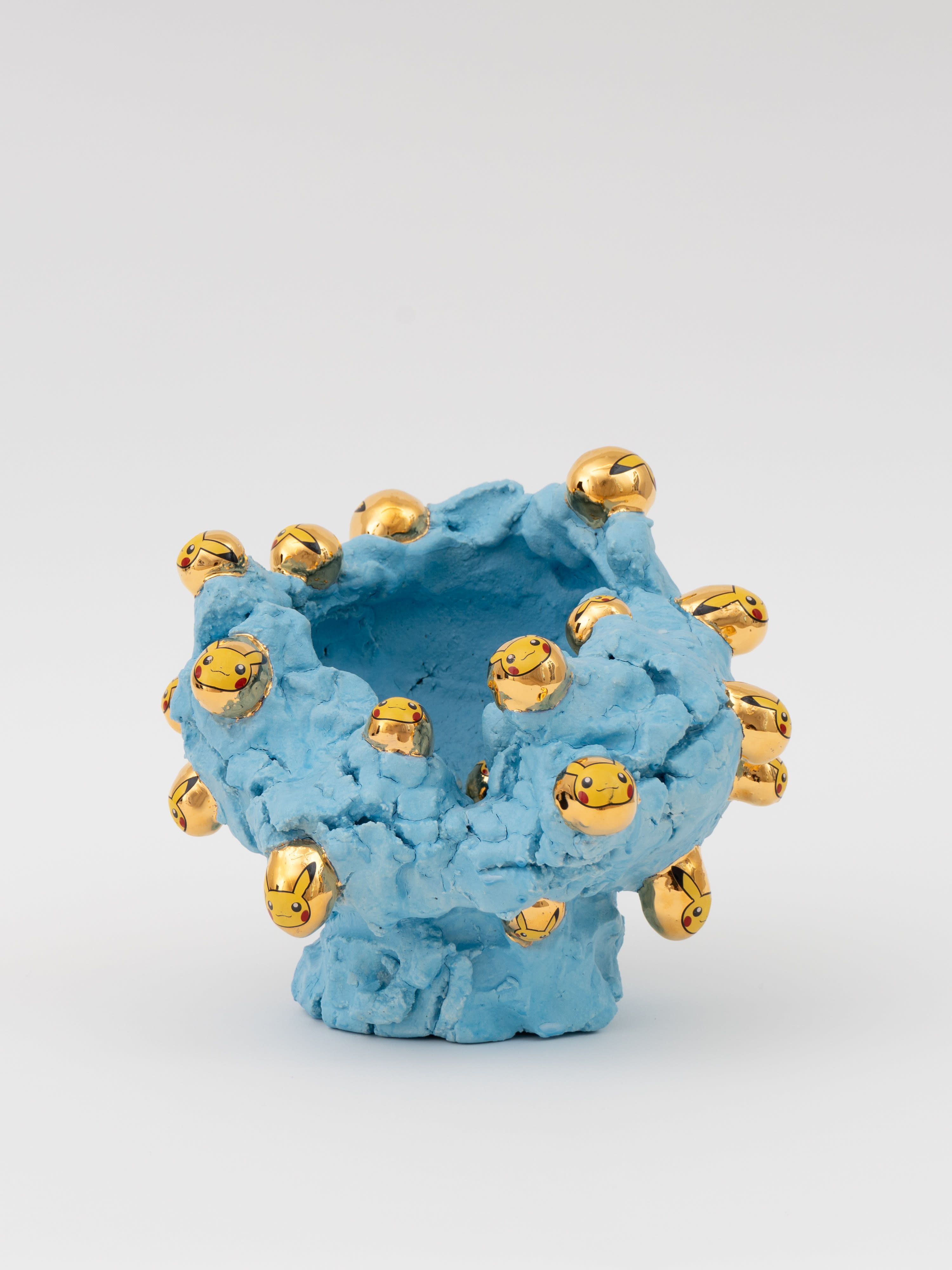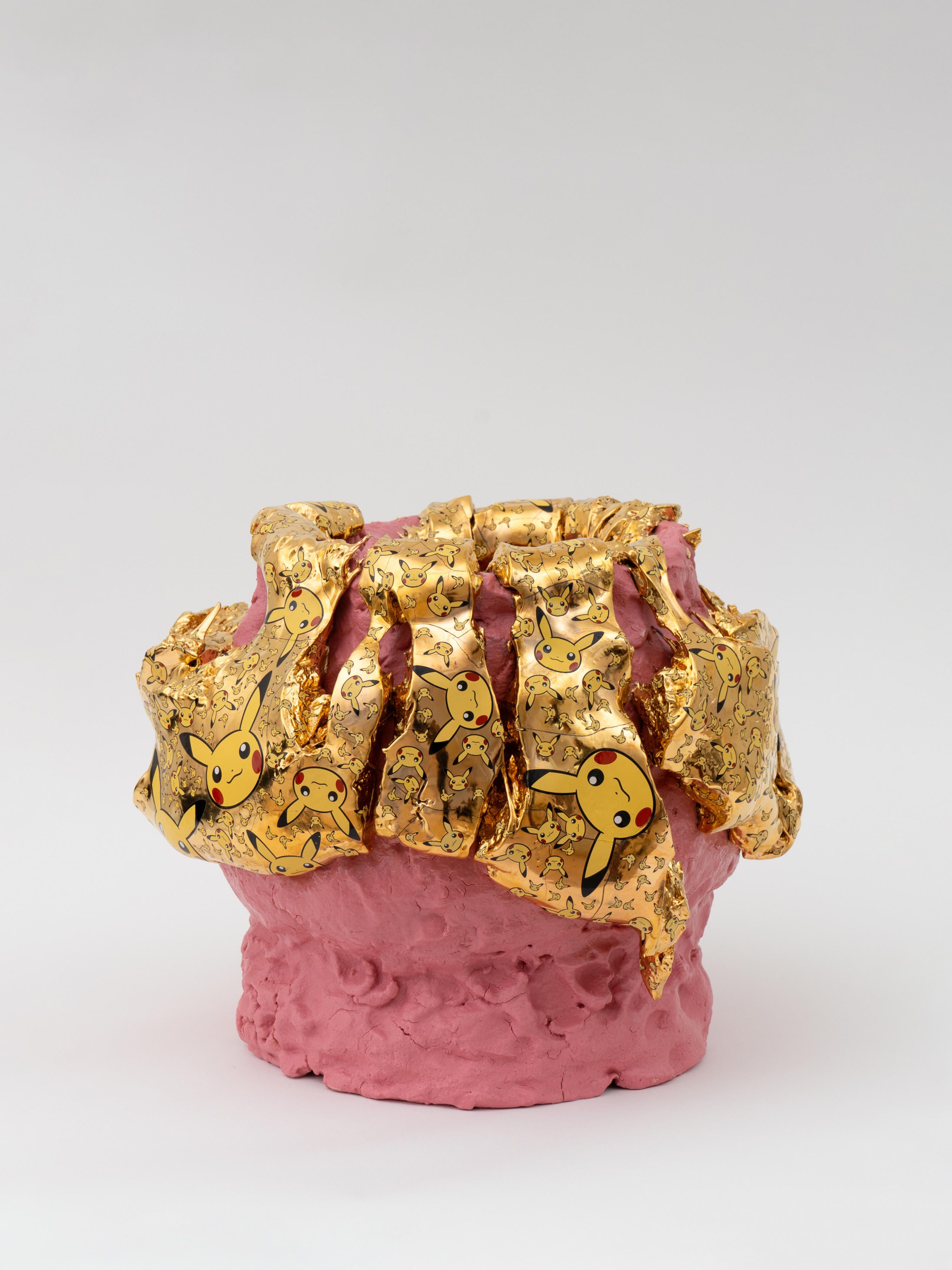 Kuwata’s promiscuous approach to form and surface has led critics to ekphrastic heights. Glenn Adamson used Kuwata’s work as the fulcrum of his 2019 essay “Rise of the Hyper Pot,” describing the ways that Kuwata commands eyeballs and short attention spans on social media in “the basking, acid glow of a computer screen.” Adamson uses Kuwata’s work to verbally flex in a jazzy slipstream of adjectives as he describes an untitled piece from 2018 as a “liquid landslide of bubblegum pink and sky blue, dripping down over a crunchy shell of egg-yolk yellow.”