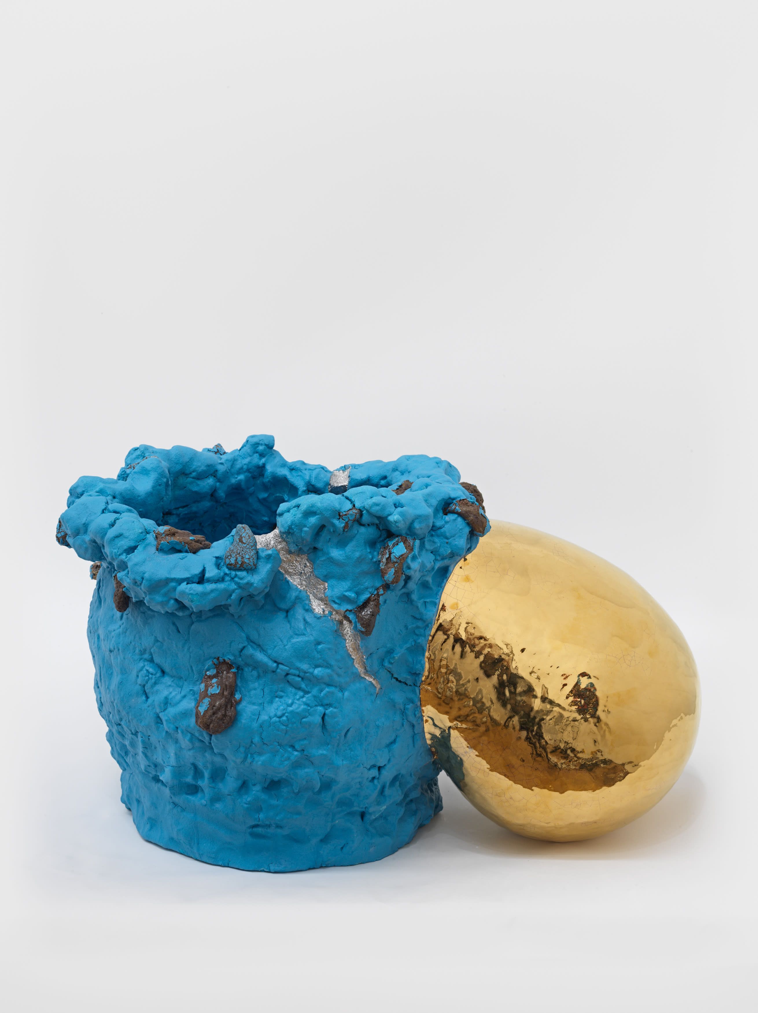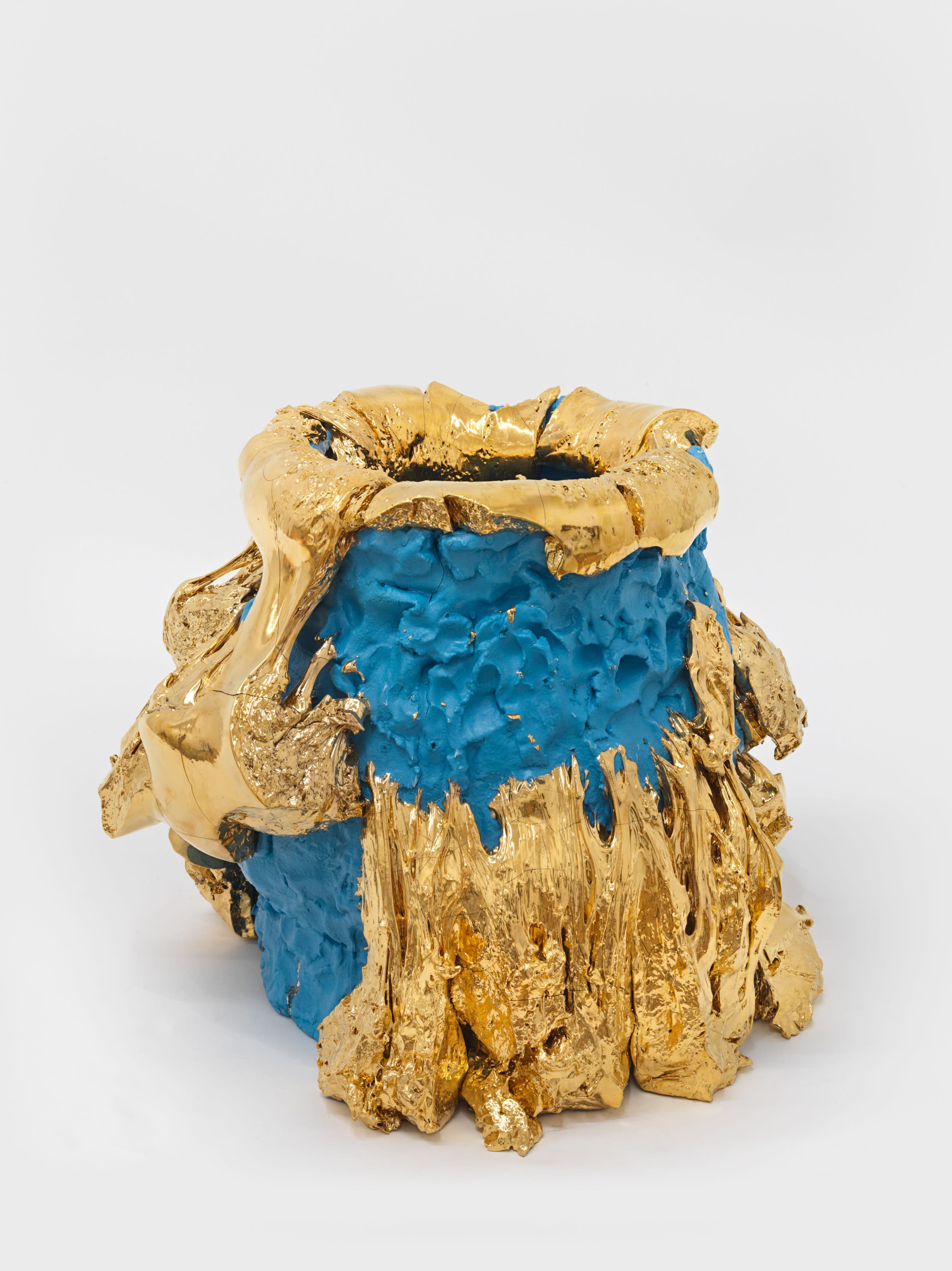 Artist and critic David Stent’s 2021 essay “‘Blue-Slipped Stone-Burst’ – Seeing Destructive Plasticity in Takuro Kuwata” focuses on the seeming maelstrom of energy unleashed in the artist’s work, connecting the dots between Kuwata’s upbringing in Japan, love of tea ceremony, and the dance of destruction and creation in his works. Stent anthropomorphizes Kuwata’s work via nuclear body horror, noting the way his ceramic objects “shuck their own skins, peel or turn inside-out, their glazes raised like keloid scarring.”