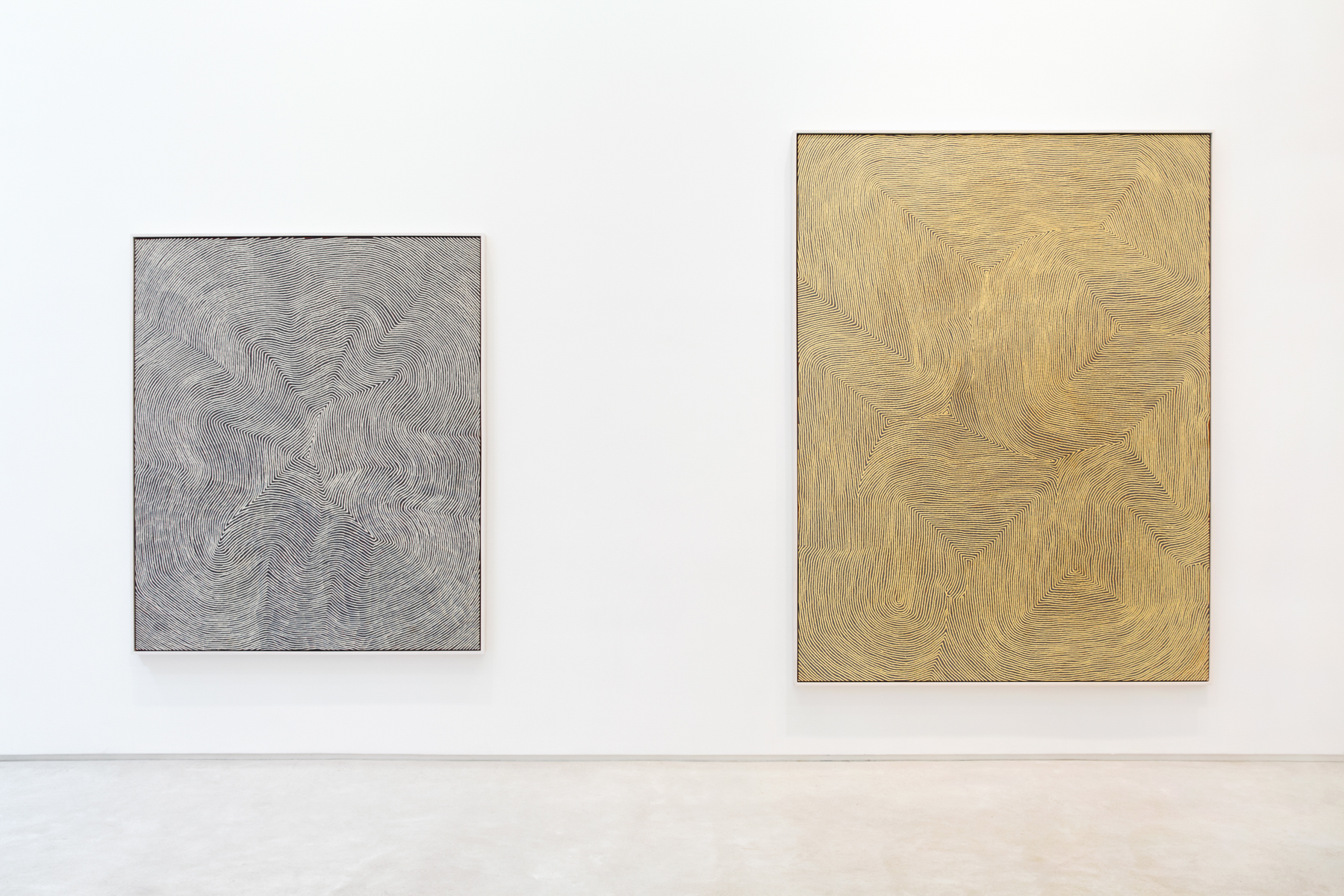Warlimpirrnga’s principle influences were the artists George Tjungurayi and Tjampu Tjapaltjarri, from whom he learned the stark, linear style synonymous with Pintupi painting at Kiwirrkurra. But Warlimpirrnga took this style to dazzling new levels of opticality. Swirling lines of dots shimmer across the canvas like a mirage, evoking the shifting movement of desert sands. The pulse and gleam of these works is a powerful visual metaphor for Tjukurrpa (Dreaming)—the ancestral power that the Pintupi believe runs through all things.