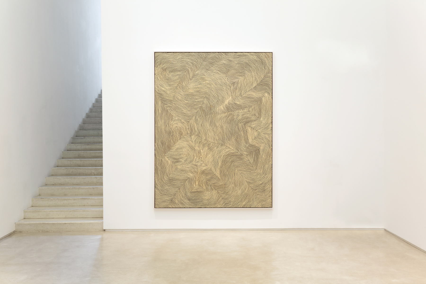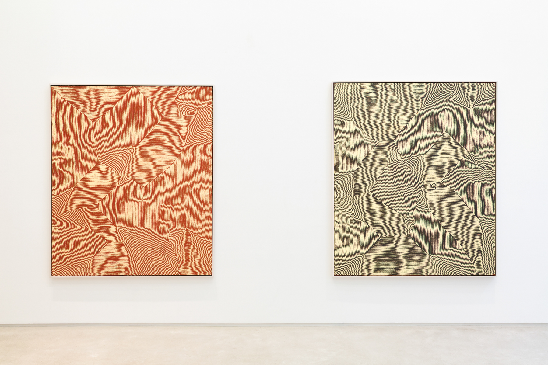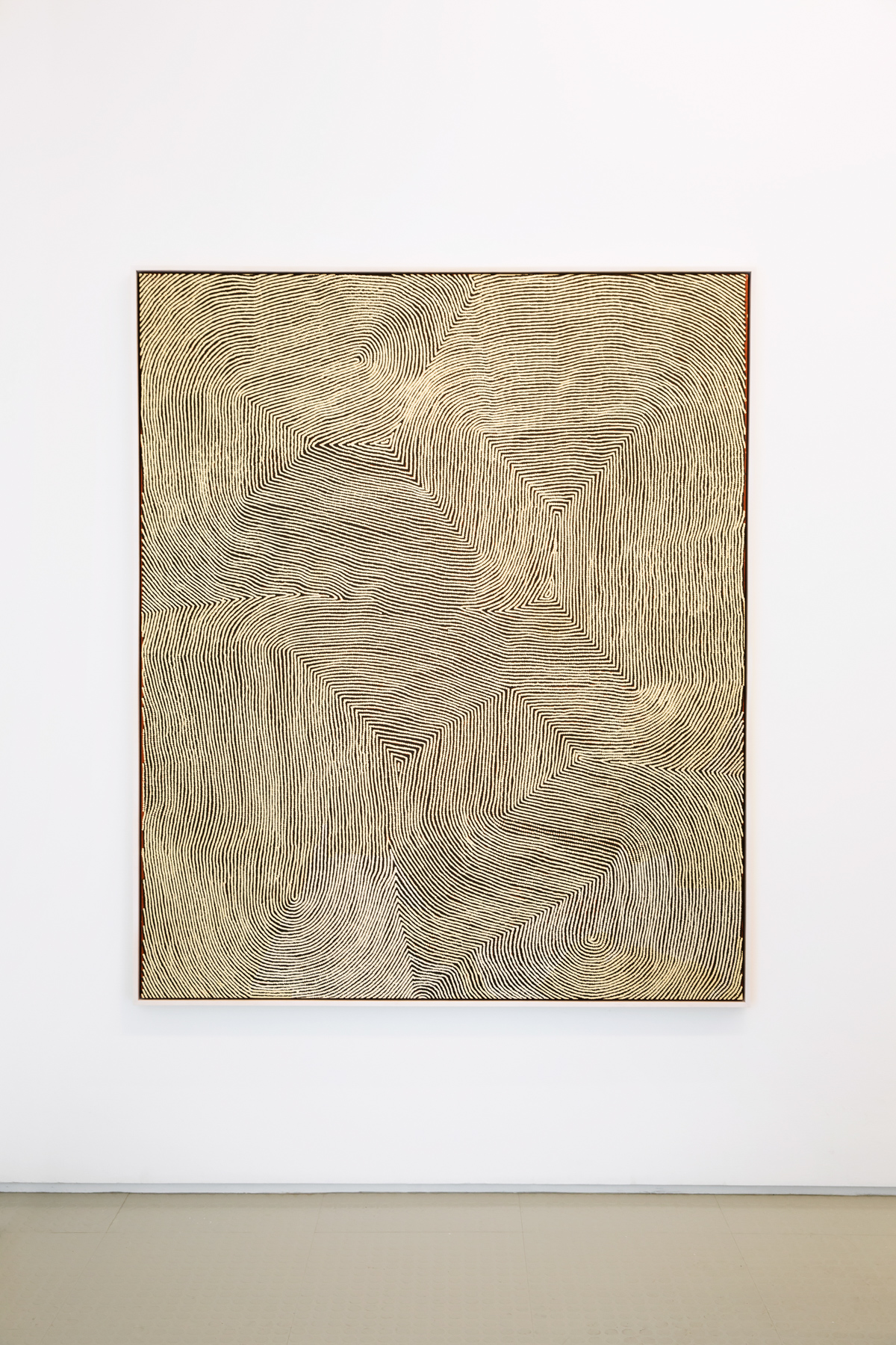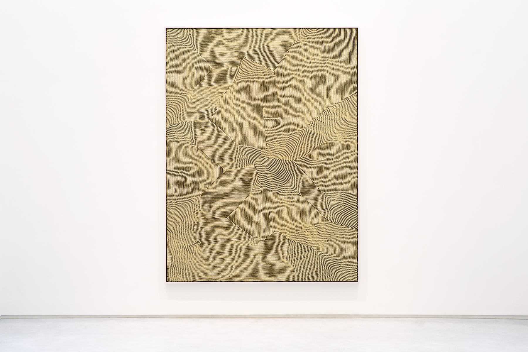 Few painters can match the optical intensity found in his paintings. Shimmering like a mirage, they pulse and swirl, hovering between the canvas and the eye like an electromagnetic field. At times the effect is so powerful that the only human response is to turn away: to shield one’s eyes from their radiant energy. Amongst his Pintupi kin in Australia’s Western Desert, Warlimpirrnga is considered a powerful maparntjarra (ritual healer)—a claim that is easy to accept when confronted with the alchemic force of his paintings.