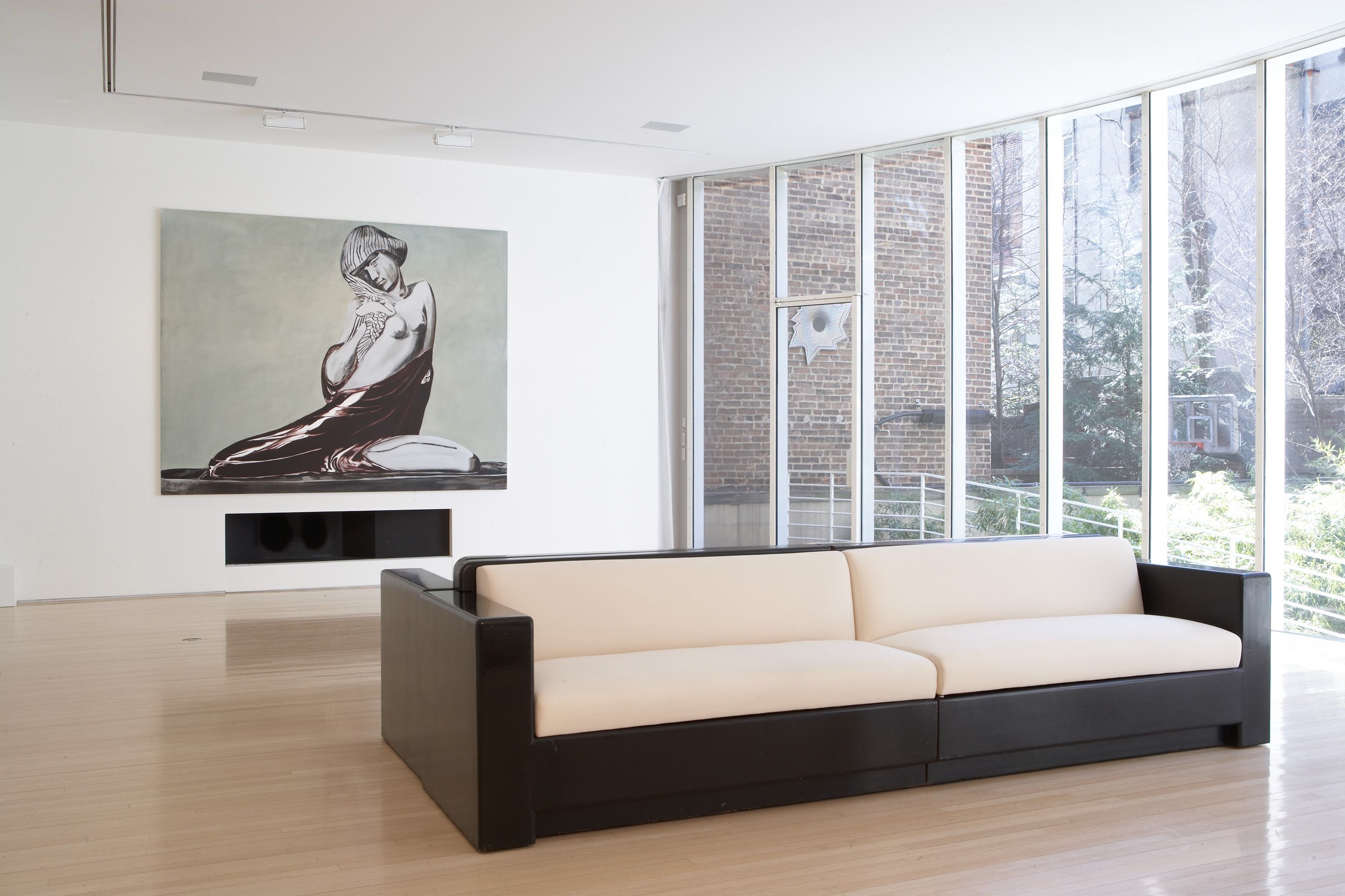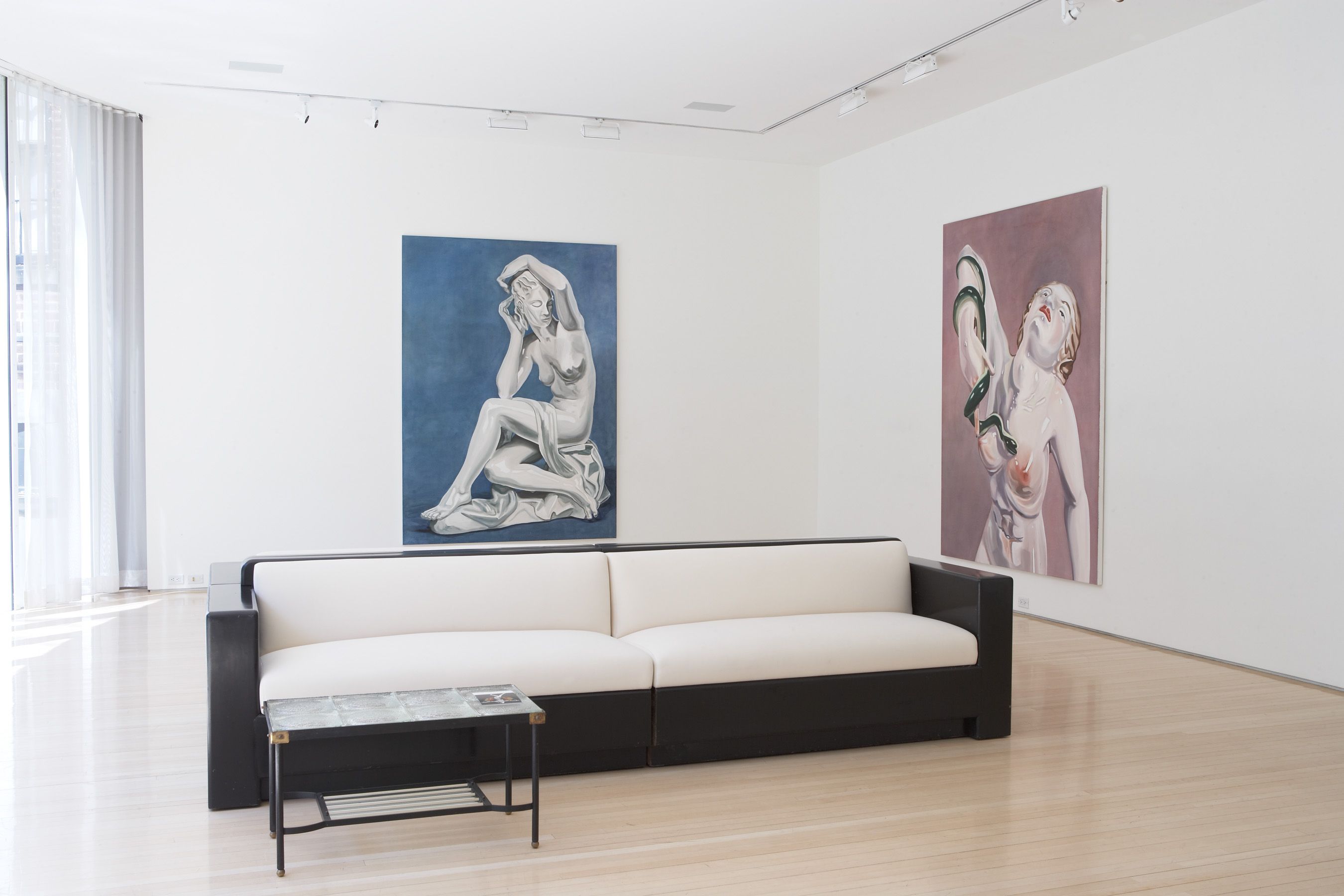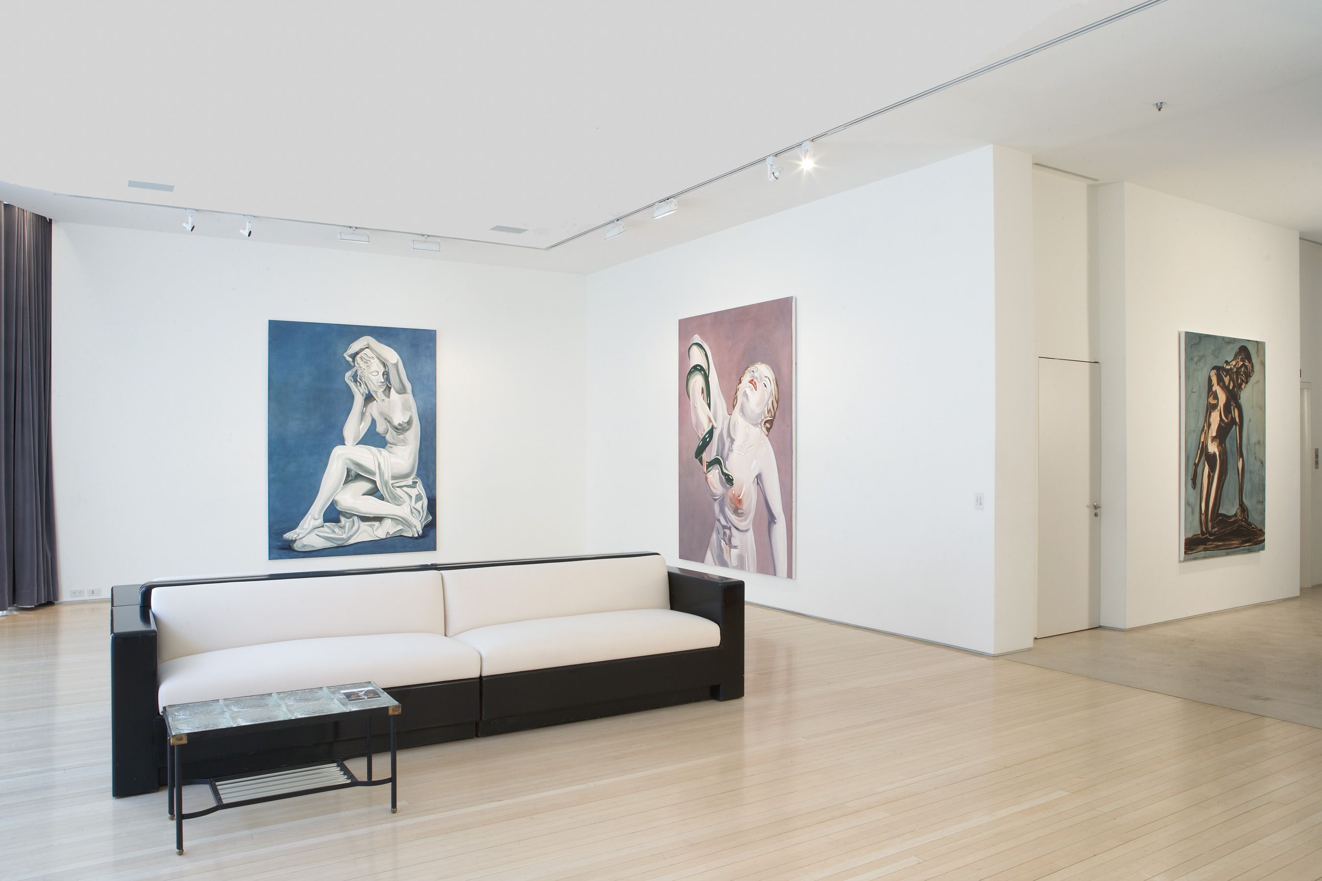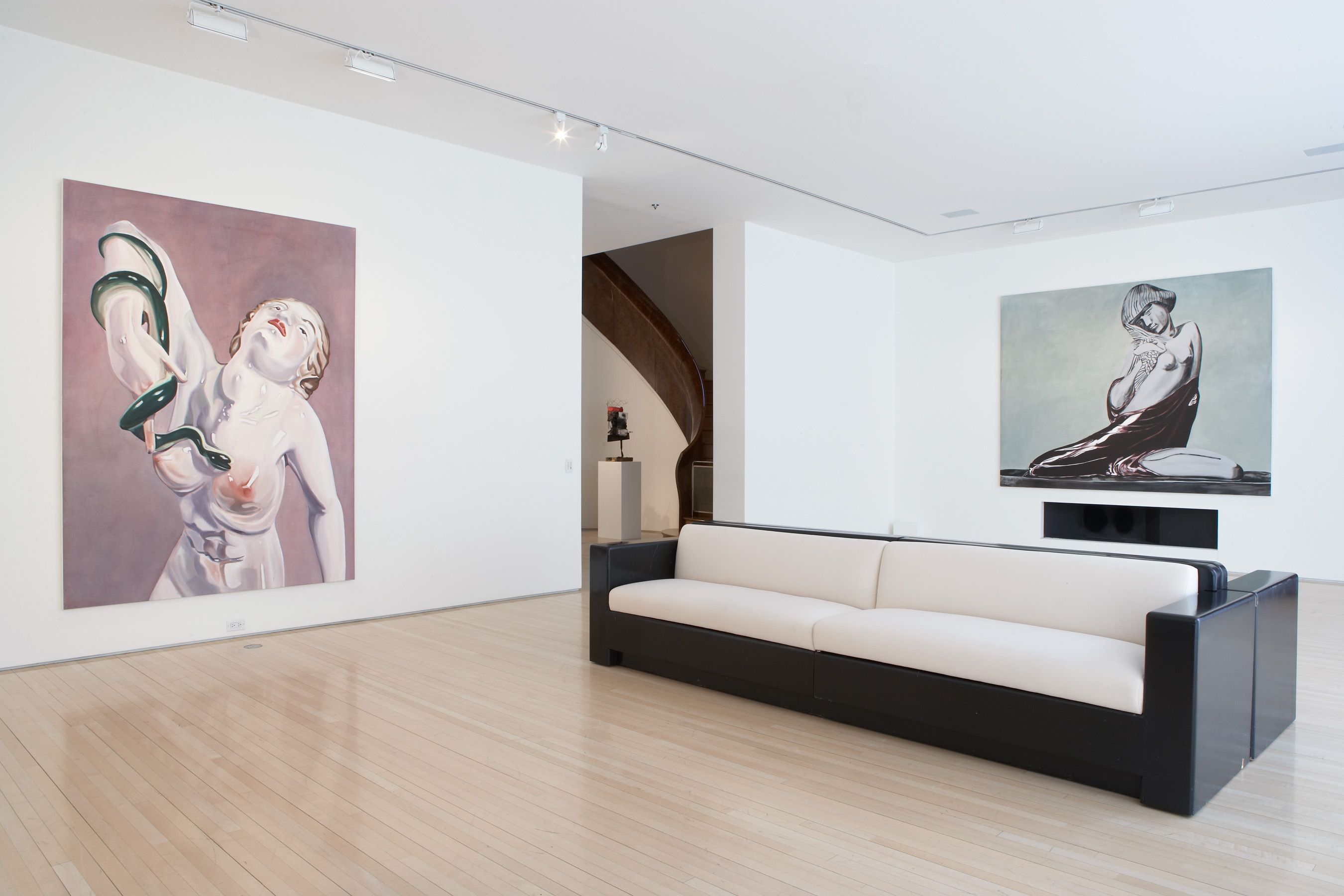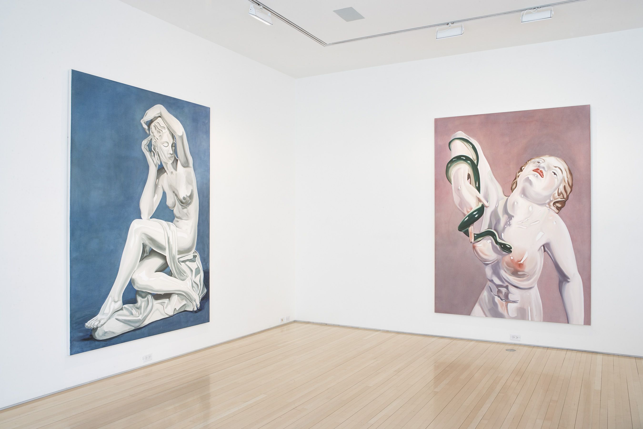 The formal qualities of the works reify their fetishistic nature and isolated space. The porcelain skin of the female figures is luminous, tactile, but cold, contrasting with their seductive postures. The flatness and uniformity of the paint condense the figure and its ground, enhancing the artificiality of the scene. The paintings are rich with art historical references; the theatrical figures in space resemble Watteau's baroque performers by way of Manet's isolated, frontal portraits. The nude females hearken back to Roman sculpture with their posture and draping.