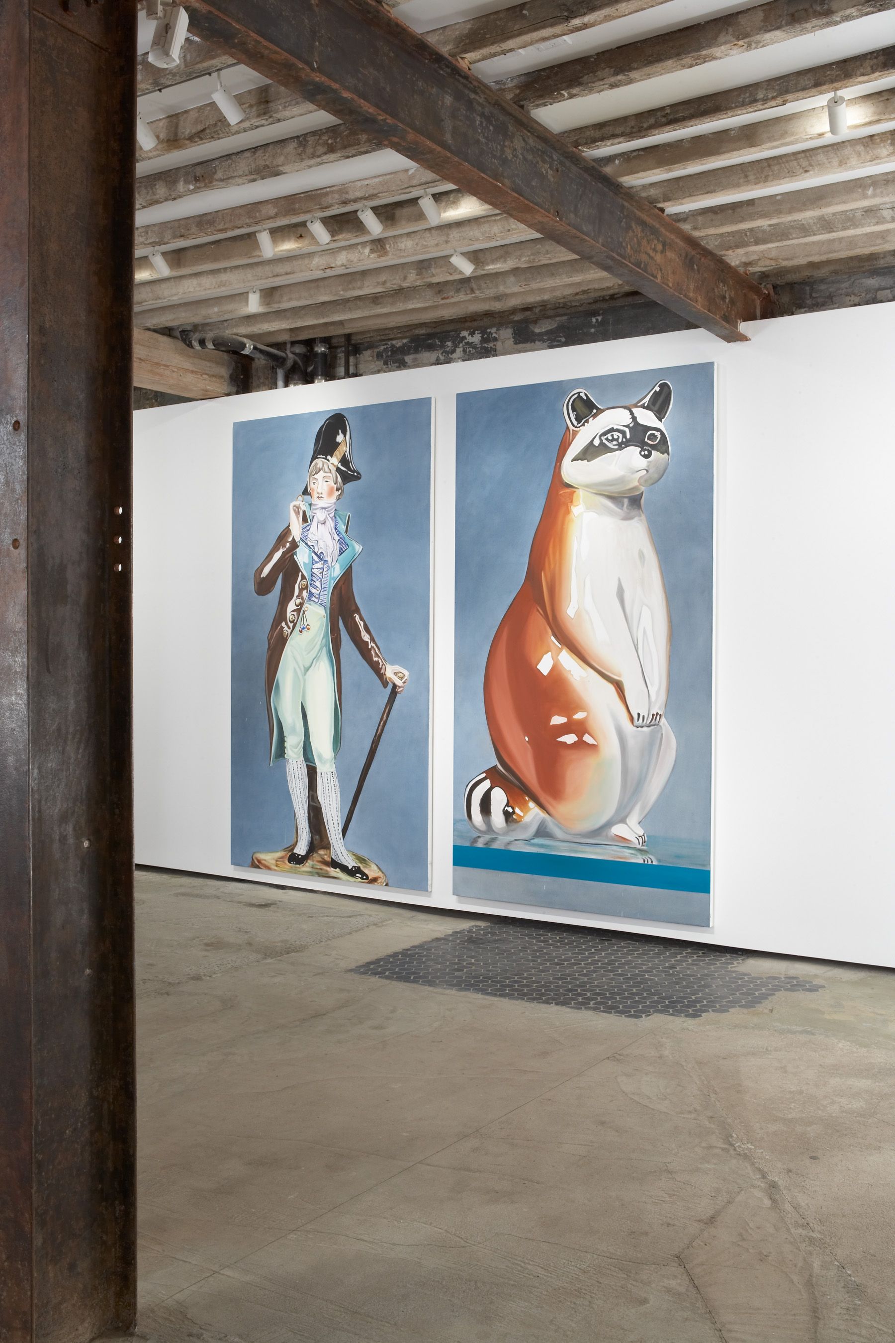 Bessone's paintings depict small porcelain figurines blown up to monumental size against monochromatic backgrounds resembling photographic and theatrical backdrops. The figures are assigned a new layer of meaning by Bessone. Originally functioning as tchotchkes or collectibles, figurines such as these serve as religious and secular devotional objects. They are placed on mantles and in cluttered curio cabinets. They make up motley crochet. By rescaling and decontextualizing them, Bessone creates for the figures their own isolated psychic spaces. While they engage the viewer in a performative, almost animated way, they remain frozen, detached as a function of Bessone's brush. Like Picasso's saltimbanques, they appear removed from the show they are meant to perform. The original nature of these figurines as kitschy fetish objects shifts to a new, more monumental aloofness. As fetishes in the Marxist sense, they appear unattached from their origins, free-floating and deceptive. The nudes take on another role as highly desirable sexual fetish objects.